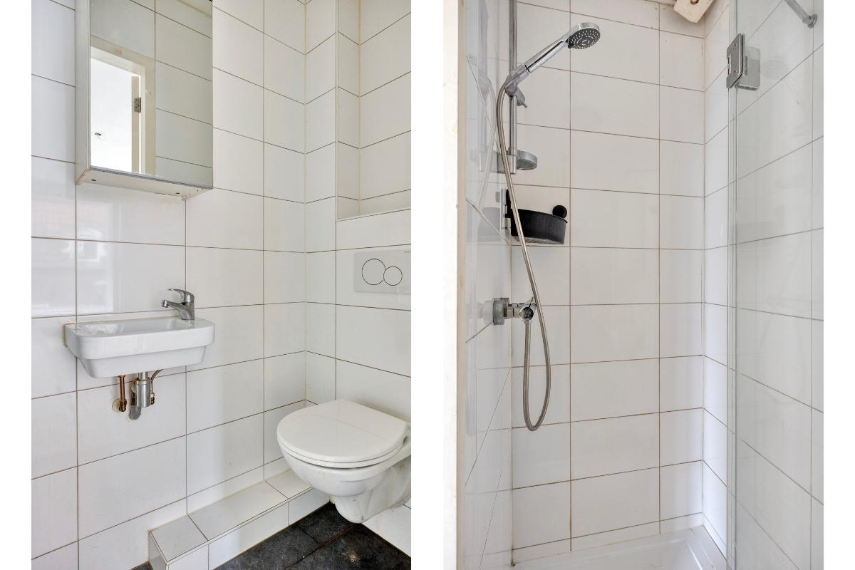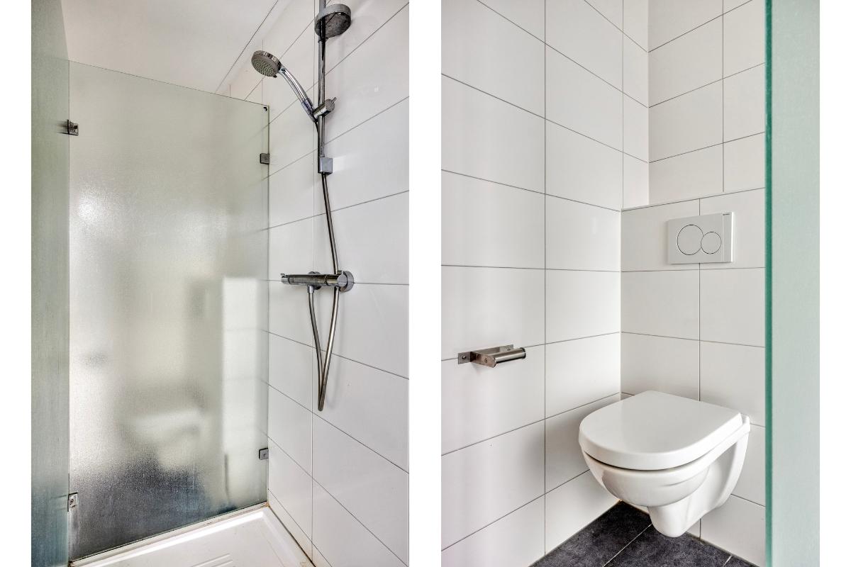 Badkamer De badkamer is volledig betegeld en voorzien van een zwevend toilet, wastafel en douchecabine.