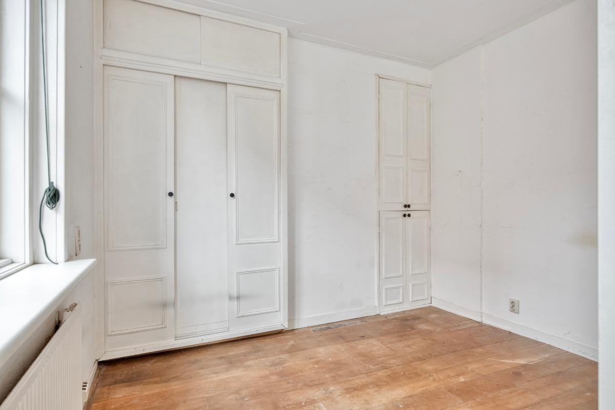 Slaapkamer 1 Via de woonkamer bereikt u de slaapkamer op deze verdieping. Deze kamer beschikt over een ingebouwde kast met schuifdeuren en een kast met openslaande deuren.