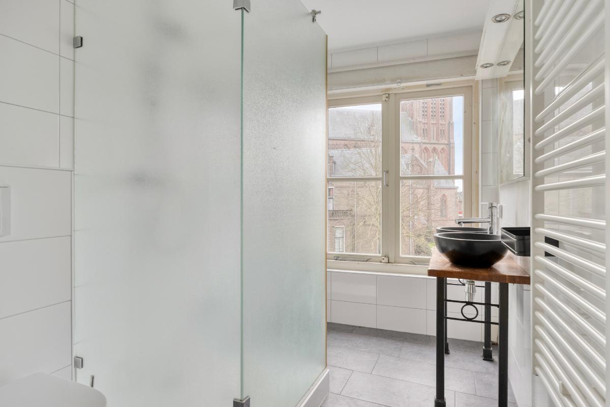 Badkamer Op deze verdieping bevindt zich een tweede badkamer met zwevend toilet, douchecabine, dubbele wastafel en een groot raam dat open kan voor natuurlijke ventilatie.