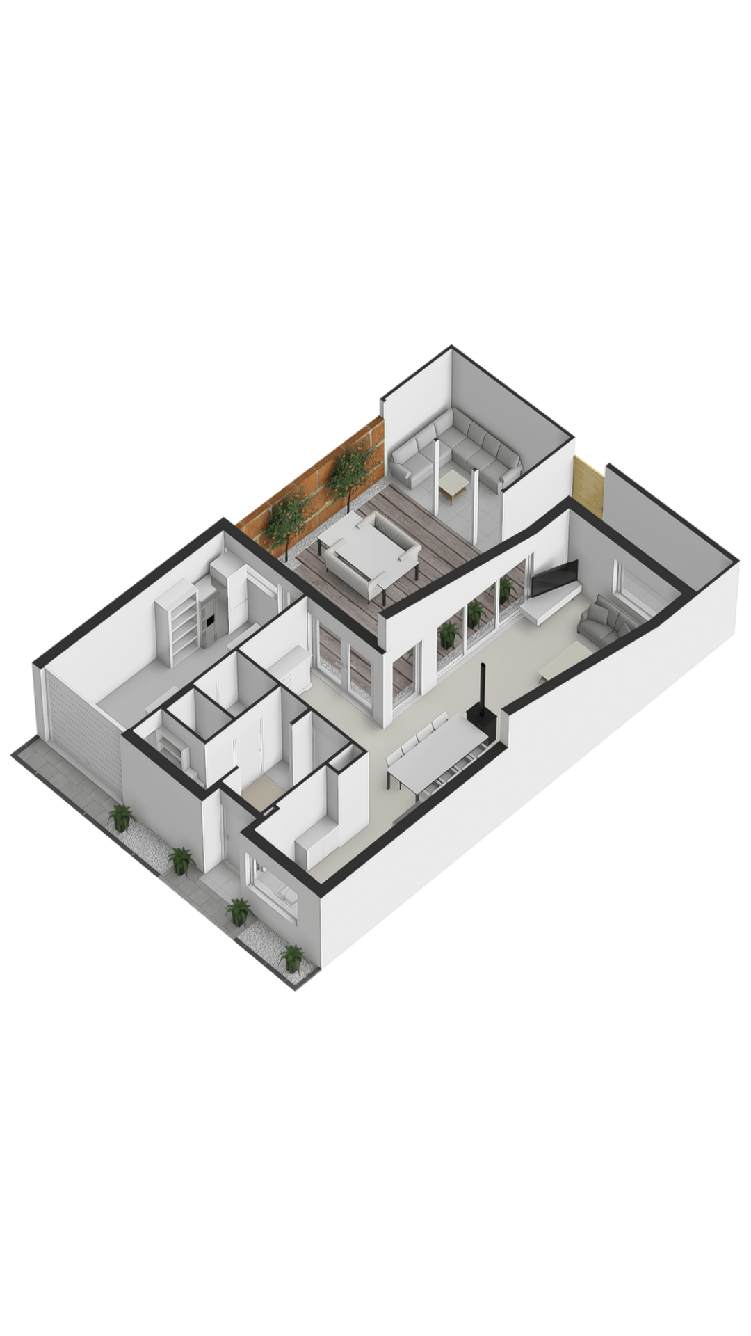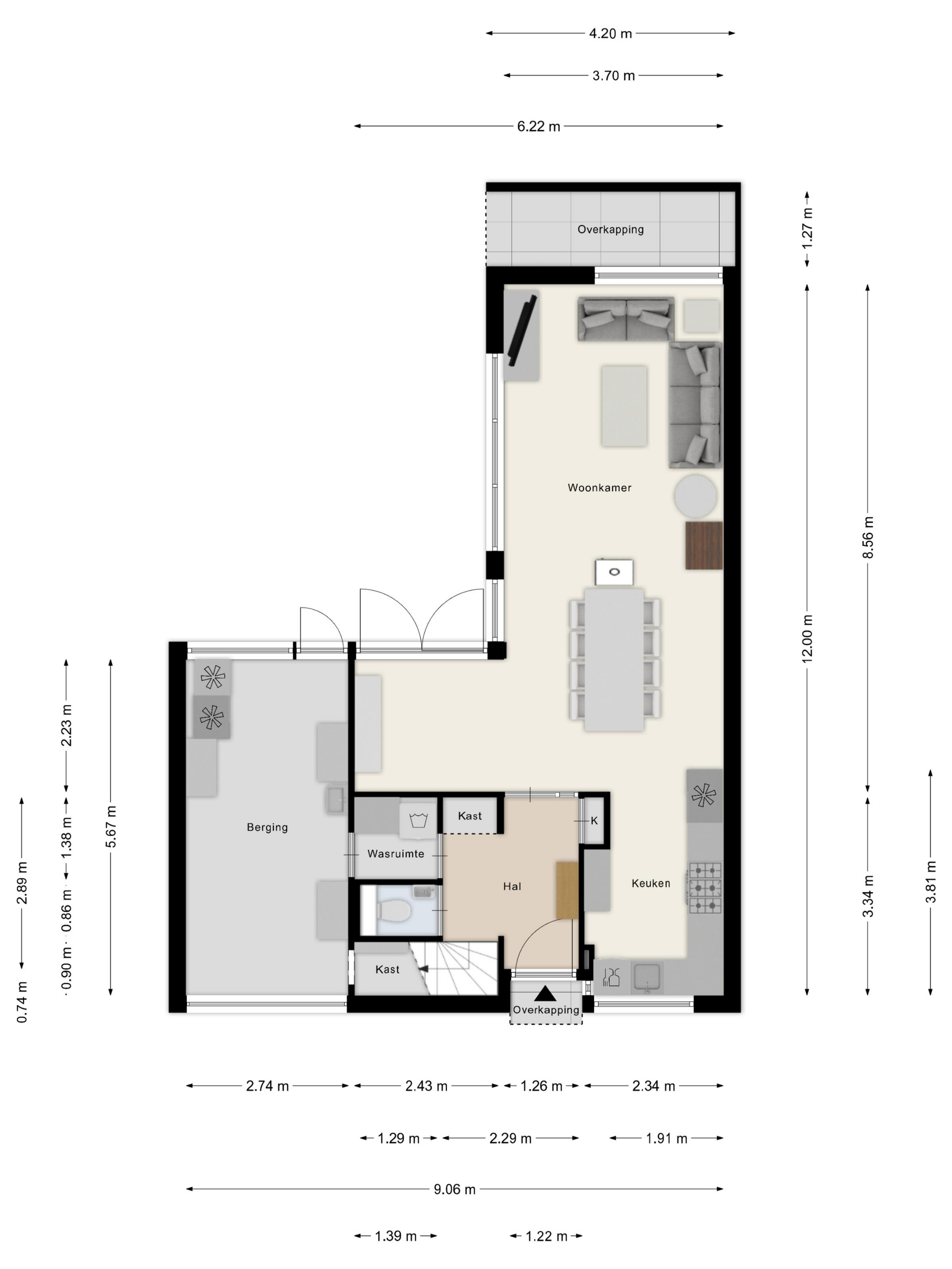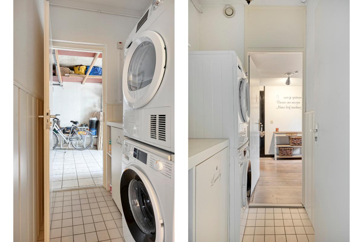Wasruimte: De wasruimte is bereikbaar vanuit de hal of garage en voorzien van de wasmachine- en drogeraansluiting.