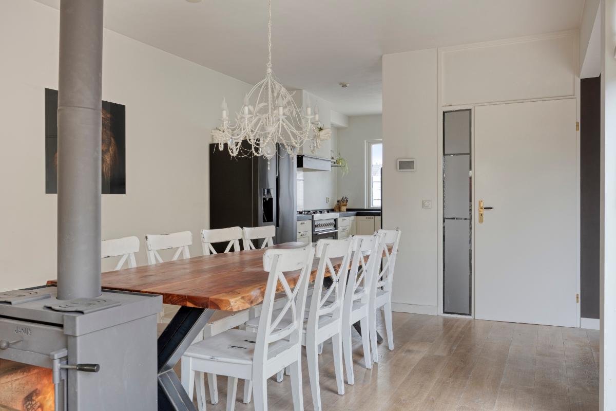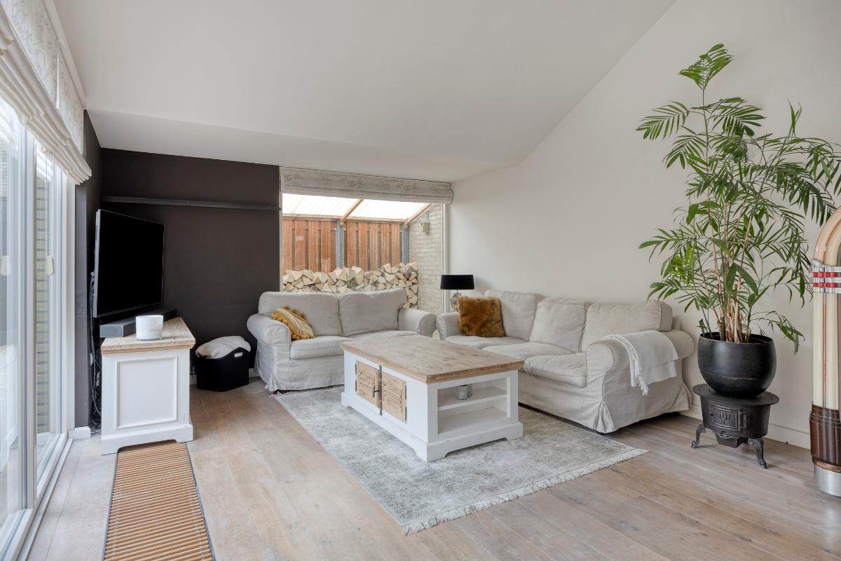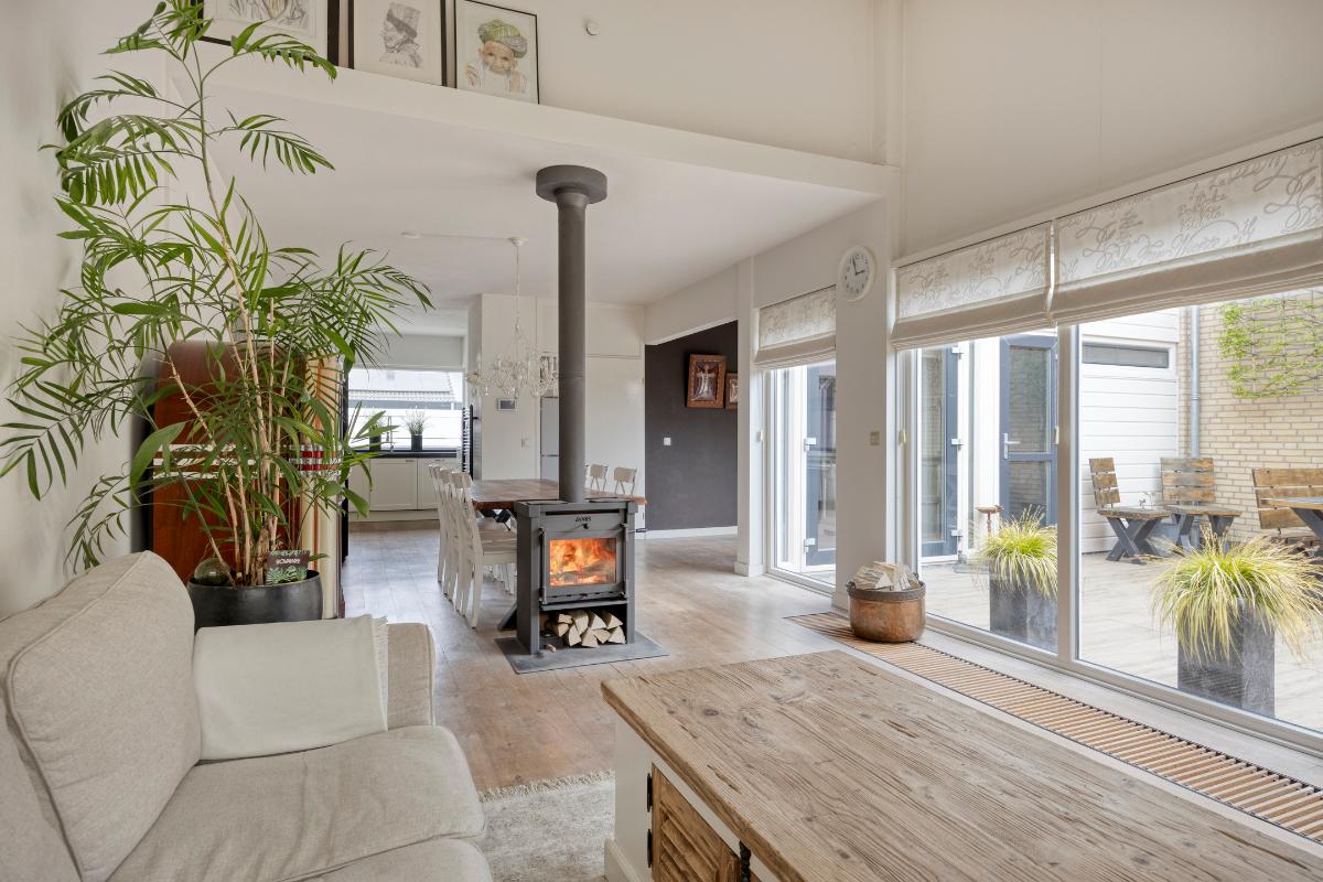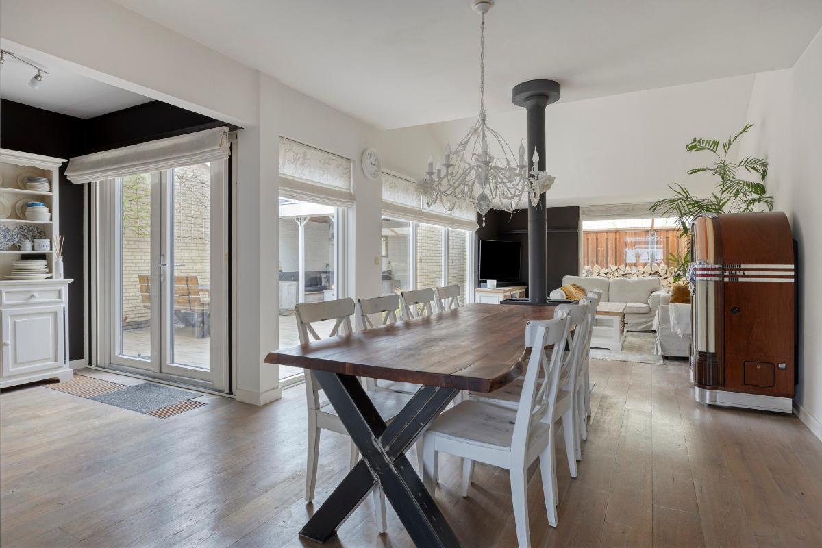 Woonkamer: De woonkamer vormt een sfeervolle en comfortabele leefruimte. De houtkachel fungeert als een warm en gezellig middelpunt, terwijl de convectorput zorgt voor een aangename en gelijkmatige warmteverdeling. Dankzij de meerdere raampartijen en openslaande deuren naar de patio valt er volop daglicht naar binnen, wat bijdraagt aan de lichte en open uitstraling van de ruimte. De openslaande deuren zijn bovendien voorzien van praktische plissé hordeuren. De massief houten vloer draagt bij aan de warme, verzorgde en tijdloze uitstraling van de woonkamer.