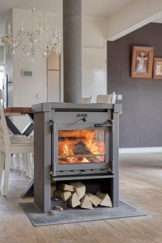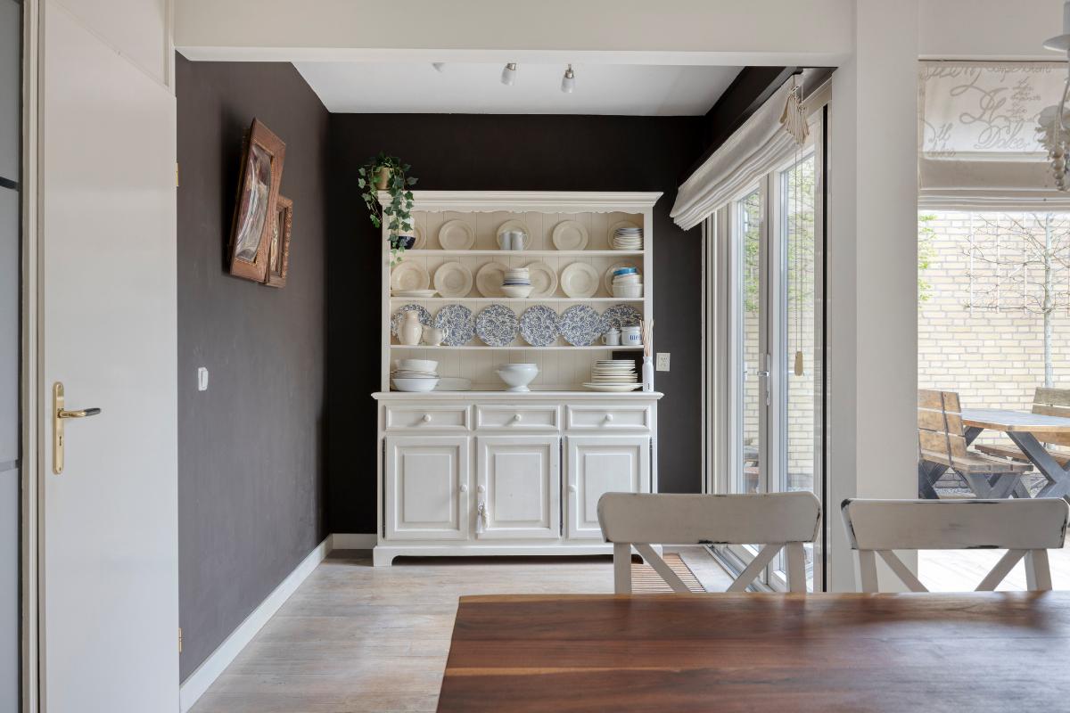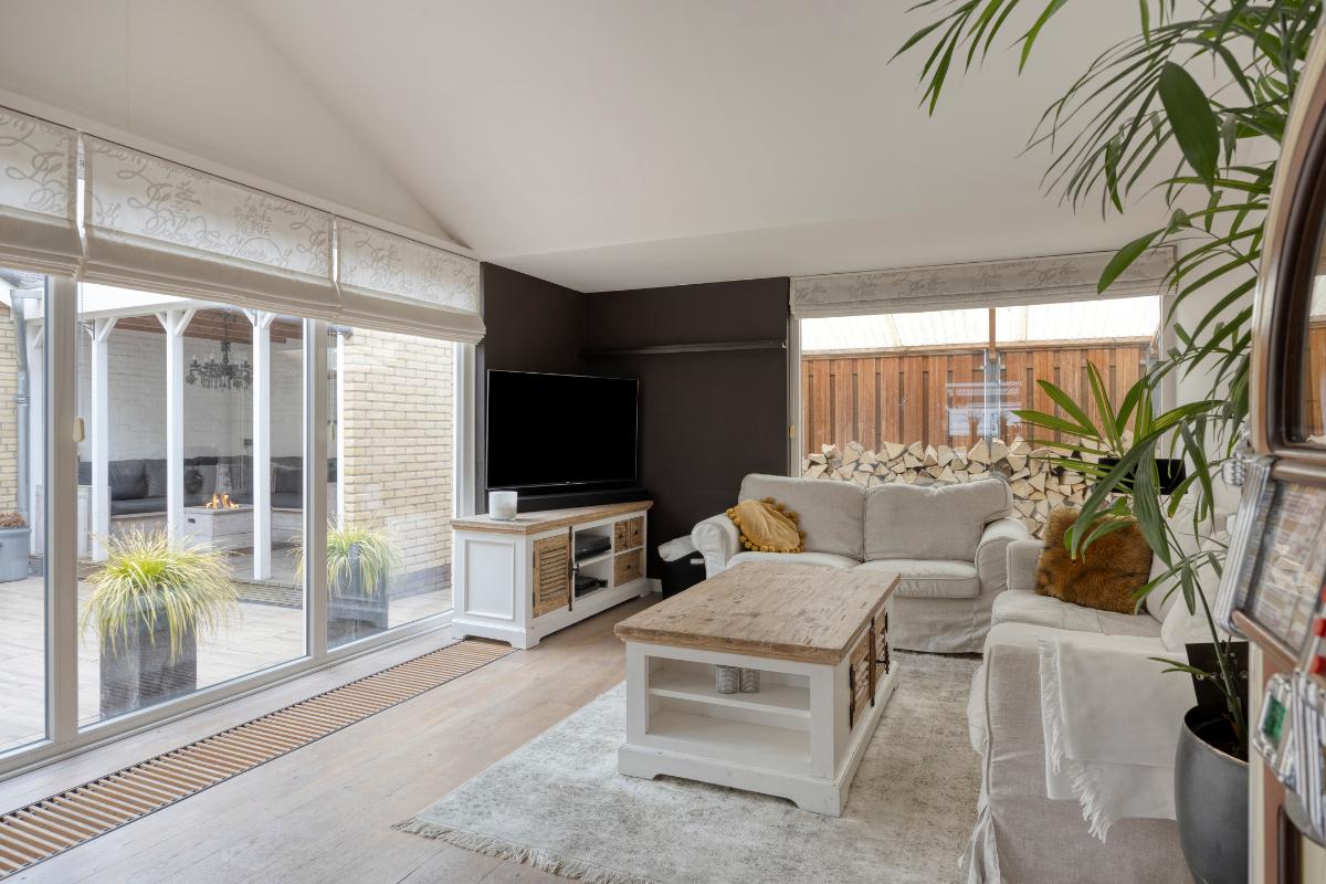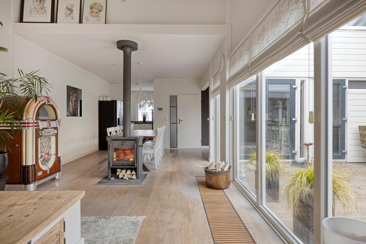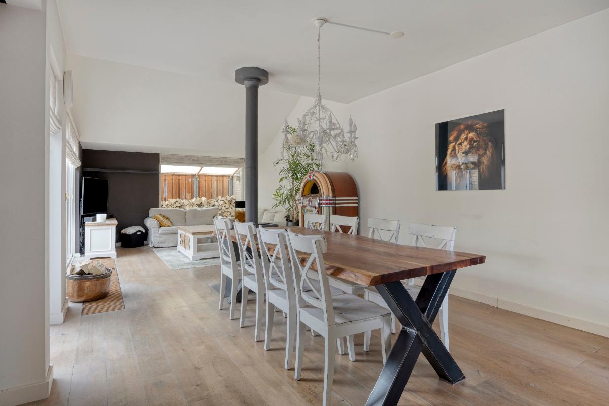 Woonkamer: De woonkamer vormt een sfeervolle en comfortabele leefruimte. De houtkachel fungeert als een warm en gezellig middelpunt, terwijl de convectorput zorgt voor een aangename en gelijkmatige warmteverdeling. Dankzij de meerdere raampartijen en openslaande deuren naar de patio valt er volop daglicht naar binnen, wat bijdraagt aan de lichte en open uitstraling van de ruimte. De openslaande deuren zijn bovendien voorzien van praktische plissé hordeuren. De massief houten vloer draagt bij aan de warme, verzorgde en tijdloze uitstraling van de woonkamer.