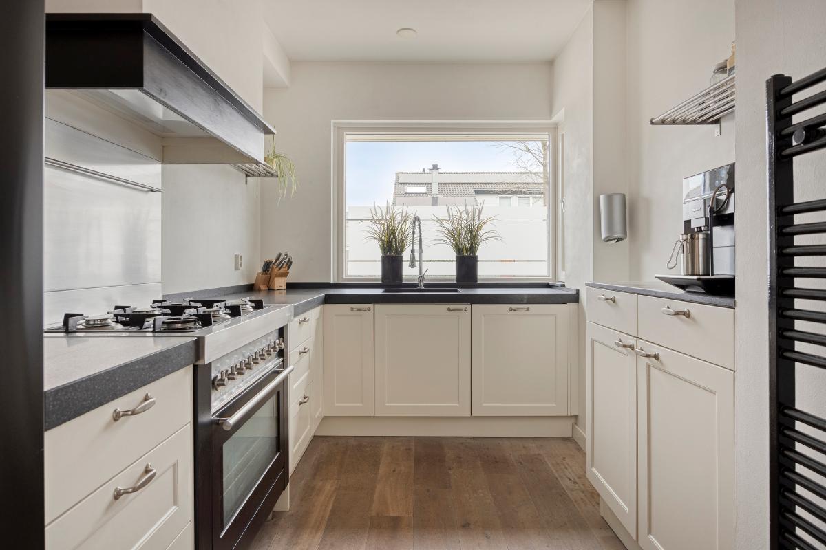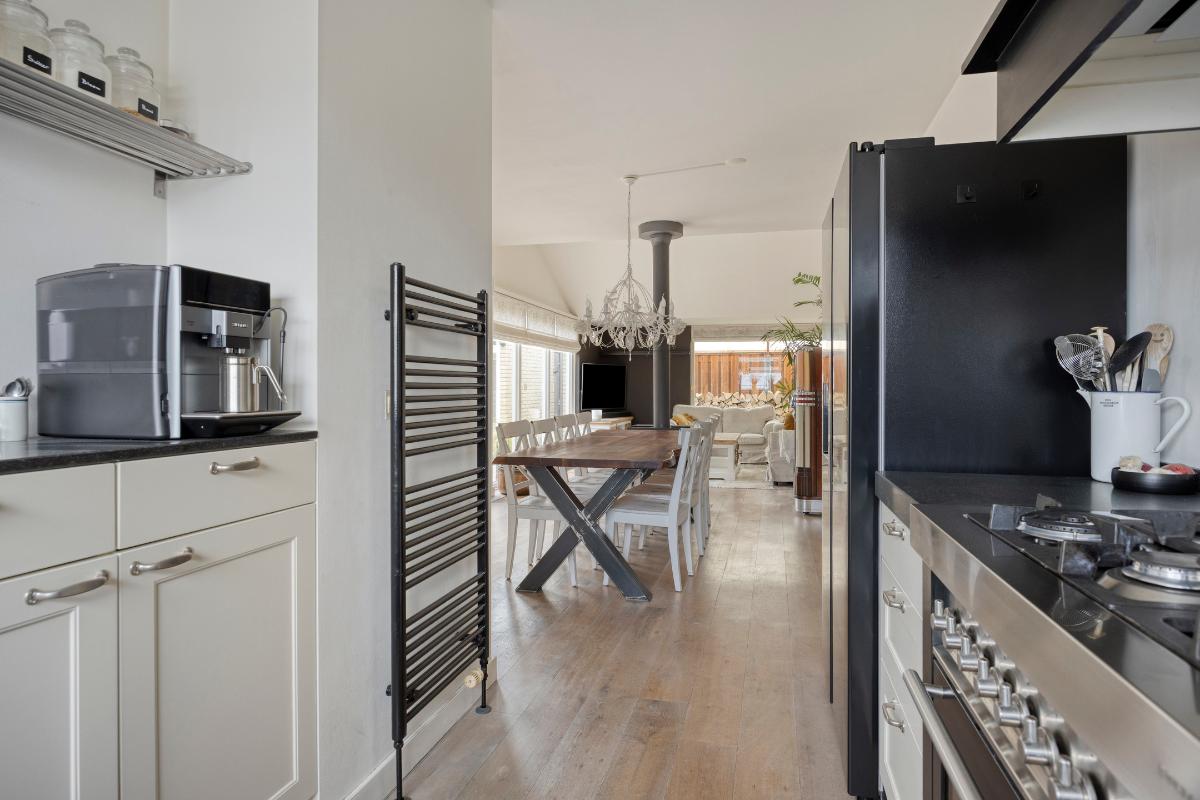 Keuken: De open keuken is praktisch ingericht en voorzien van diverse inbouwapparatuur. Zo beschikt de keuken over een Amerikaanse koelkast met ijsblokjesdispenser, een 6-pits gaskookplaat met afzuigkap, een elektrische oven en een vaatwasser (2023). Daarnaast is er een enkele spoelbak met uittrekbare kraan aanwezig en biedt de keuken veel bergruimte. Het openslaande raam in de keuken is uitgevoerd met een draai-/kiepfunctie en voorzien van een hor, voor extra ventilatie.