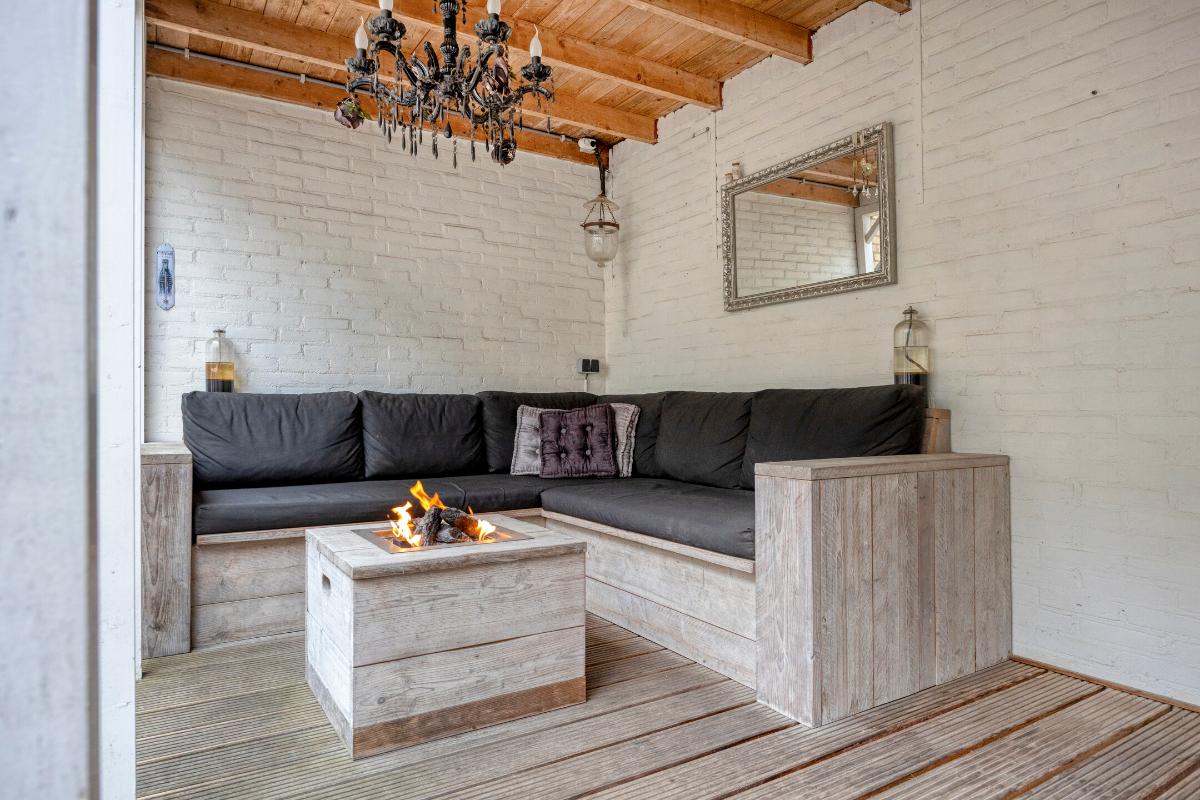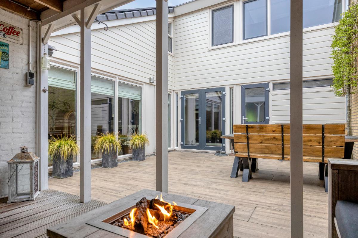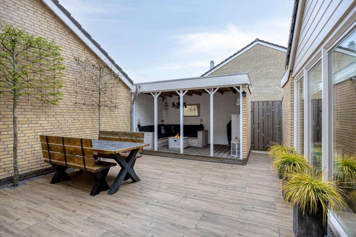Patio: De patio is gunstig gelegen op het zuidwesten en profiteert daardoor van volop zon in de middag en avond. De buitenruimte is verzorgd aangelegd en biedt diverse zitmogelijkheden, waaronder een sfeervol overdekt loungegedeelte met (vuur)tafel. Daarnaast is er een tweede overkapping aanwezig, ideaal voor de opslag van haardhout. Via de achterom is de patio eveneens bereikbaar.