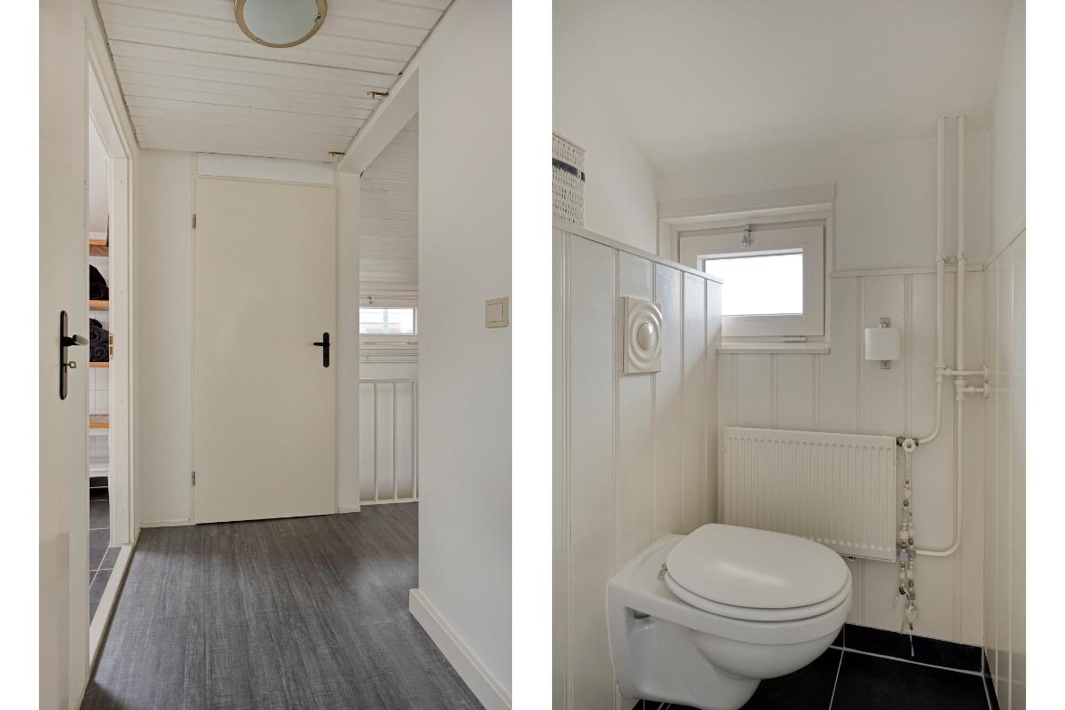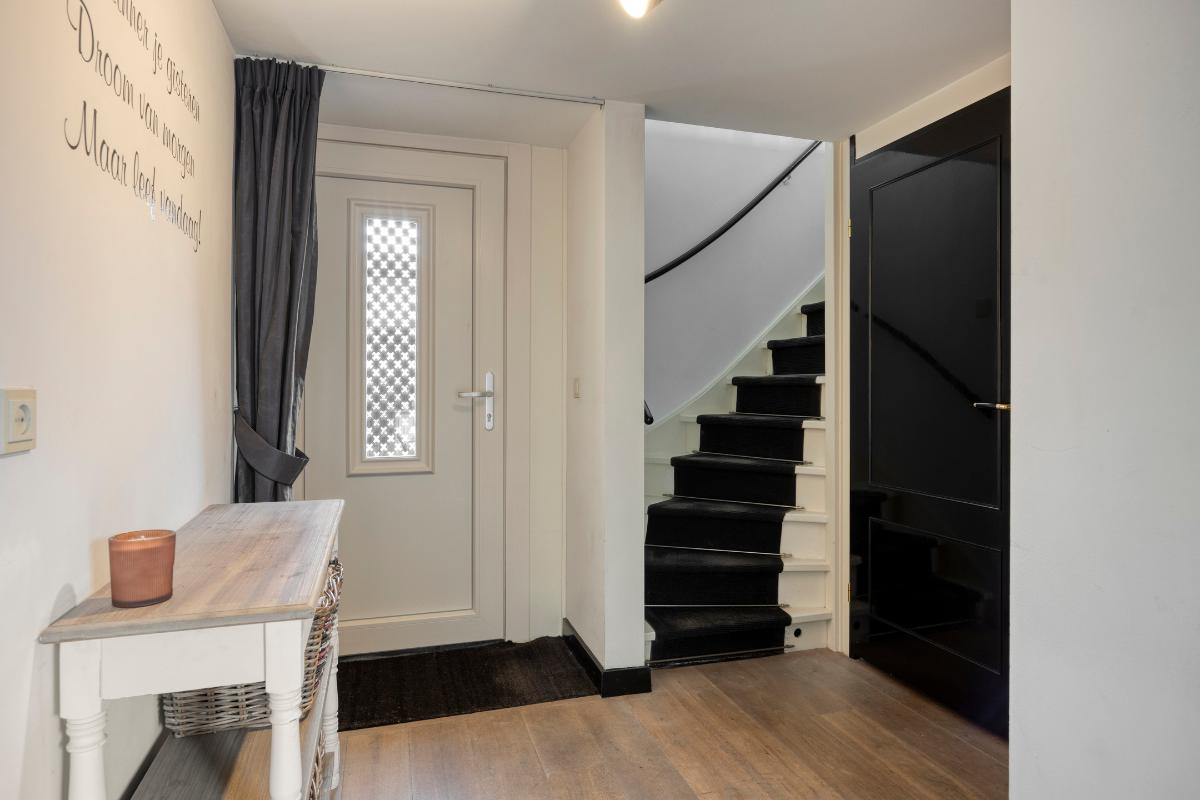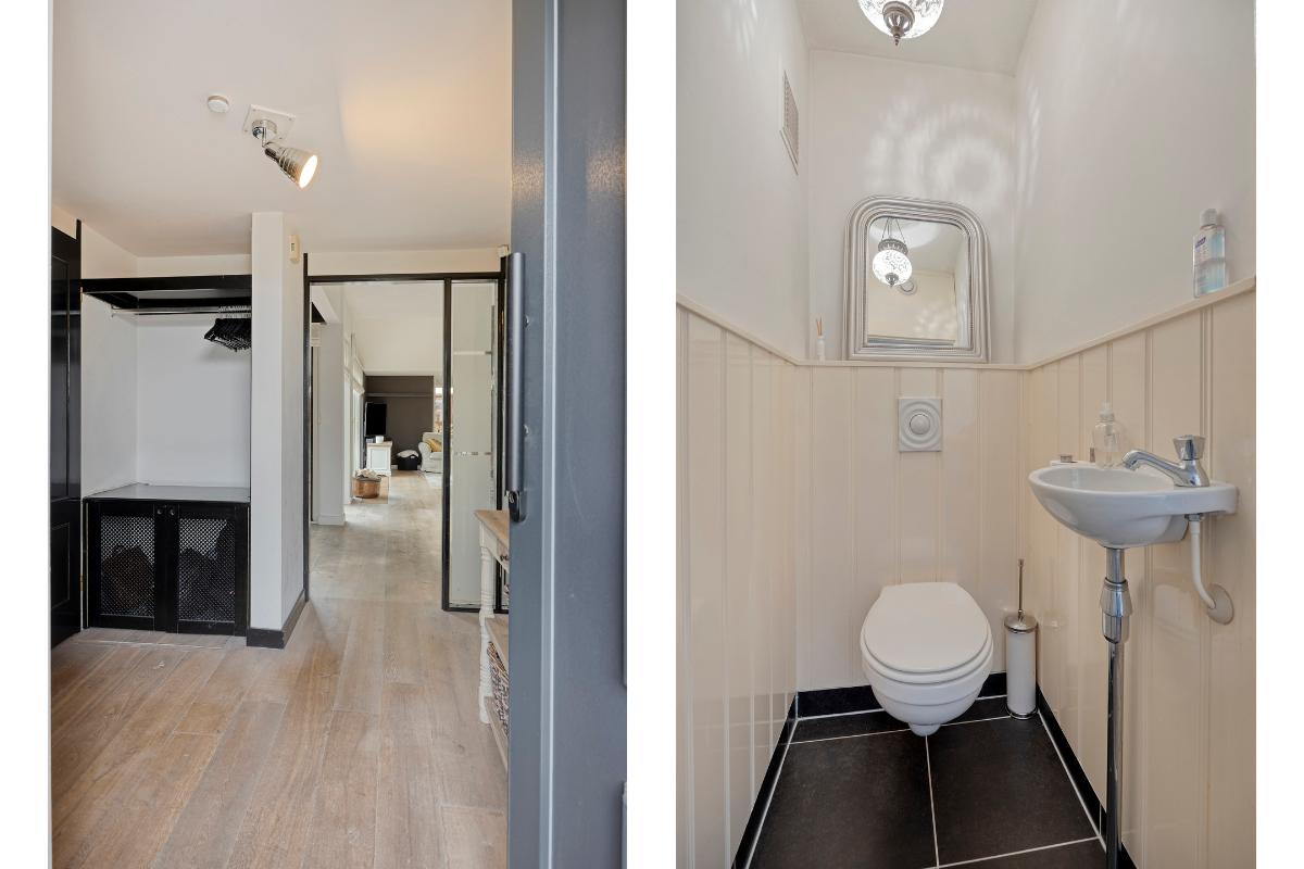 Hal: De hal biedt toegang tot de woonkamer, een toilet met fonteintje, de wasruimte en een trapopgang naar de 1e verdieping. De hal is voorzien van de meterkast en een praktische hoek die zich uitstekend leent voor het ophangen van jassen en het opbergen van tassen.