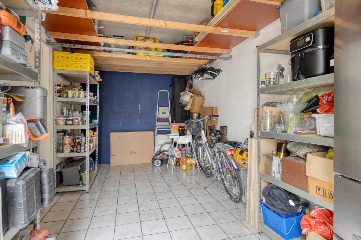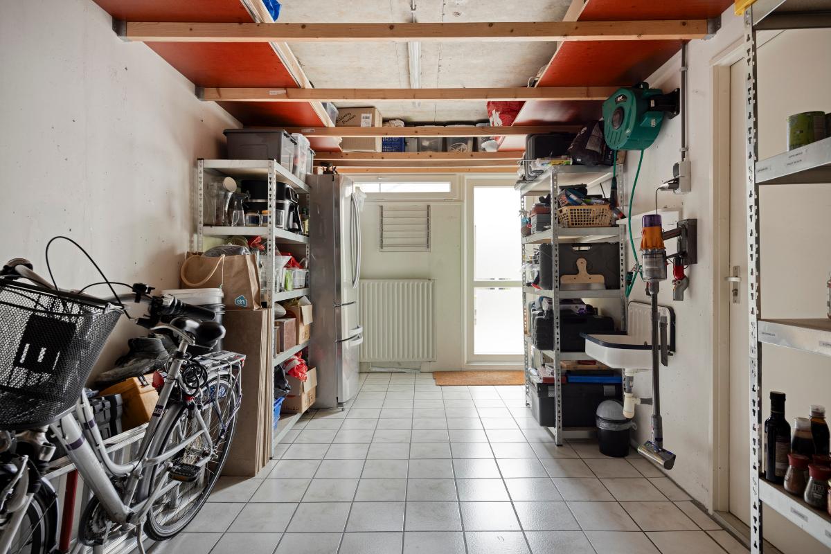 Berging: De berging (voormalige garage) is toegankelijk via de wasruimte en de patio. De ruimte is voorzien van verwarming, water en elektra en beschikt bovendien over een praktische vliering, wat zorgt voor extra bergruimte. De kanteldeur is aan de binnenzijde afgetimmerd. De oorspronkelijke deur en geleiders zijn nog aanwezig, waardoor het met enige aanpassingen mogelijk is de kanteldeur weer in gebruik te nemen.