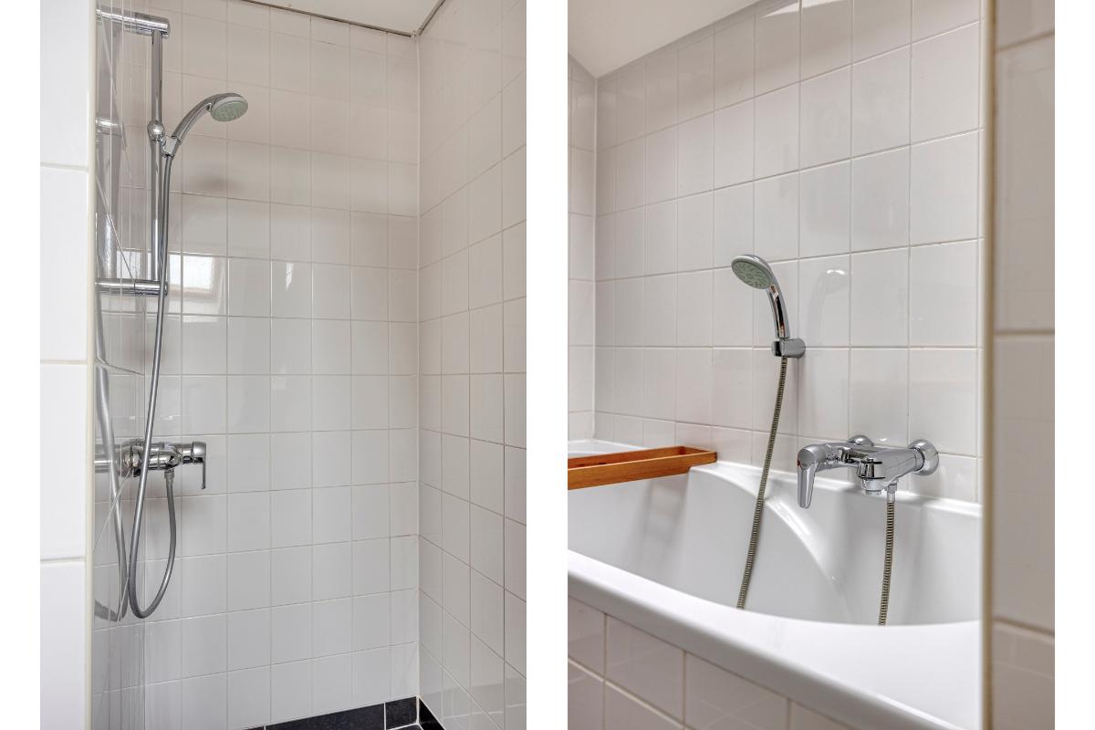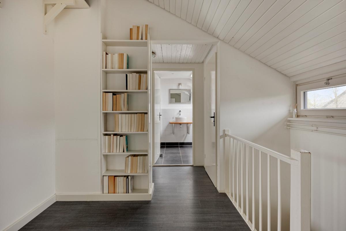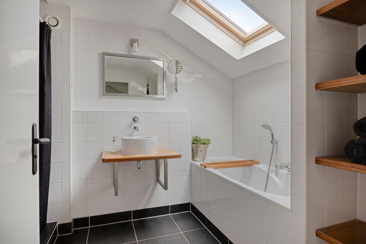 Badkamer: De moderne badkamer is voorzien van een inloopdouche en een ligbad met douchefunctie. Daarnaast beschikt de ruimte over een wastafel met spiegel en handige bergplanken voor handdoeken en toiletartikelen. De badkamer is verder voorzien van een Velux dakraam.