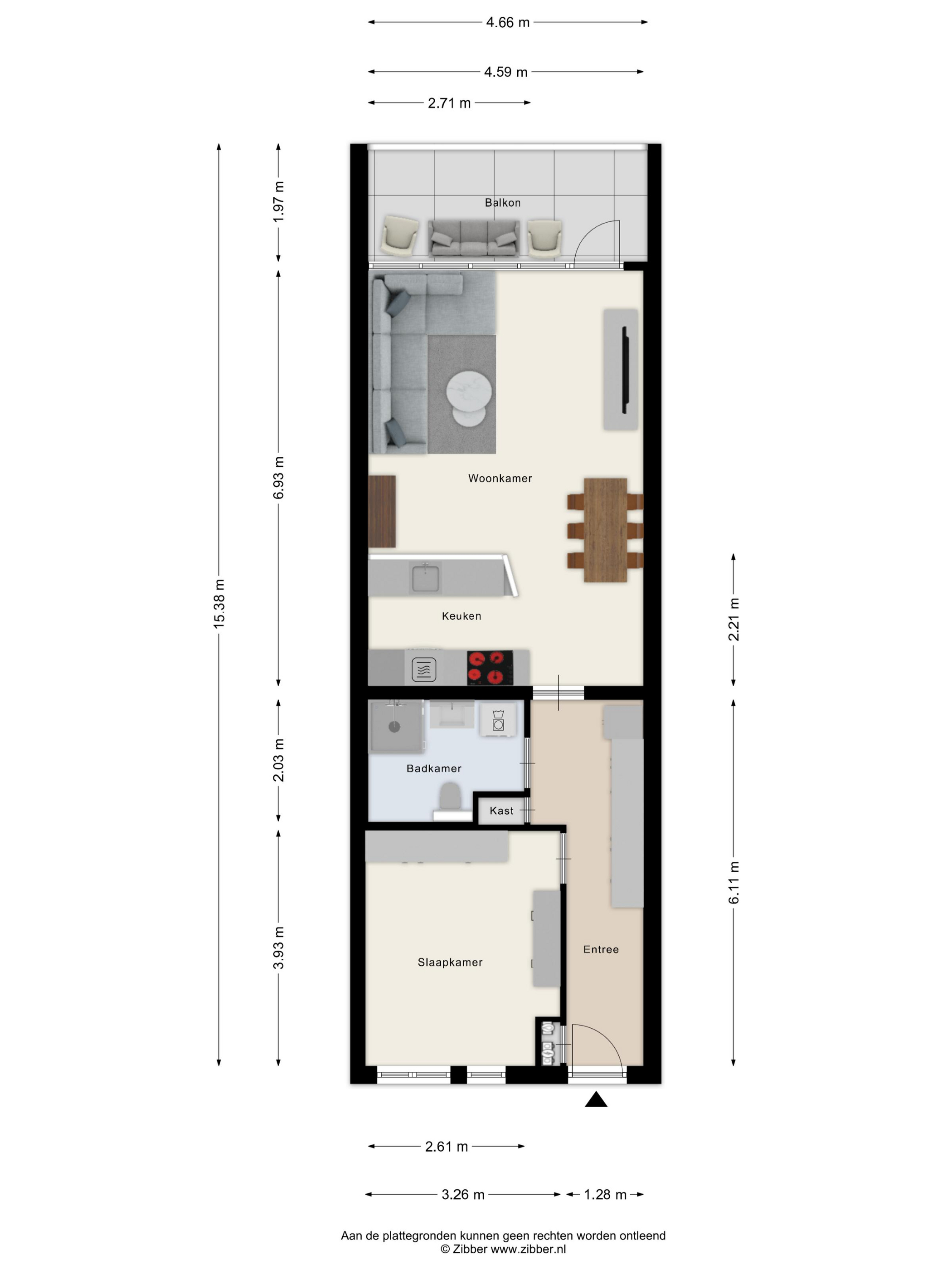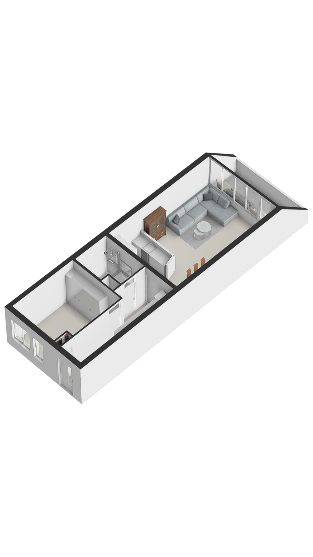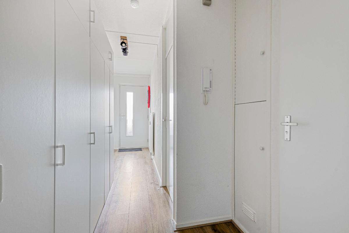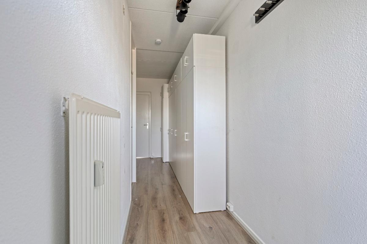 Hal: De ruime hal biedt toegang tot de woonkamer, de slaapkamer en de badkamer. De hal is voorzien van de meterkast en een ingebouwde voorraadkast.