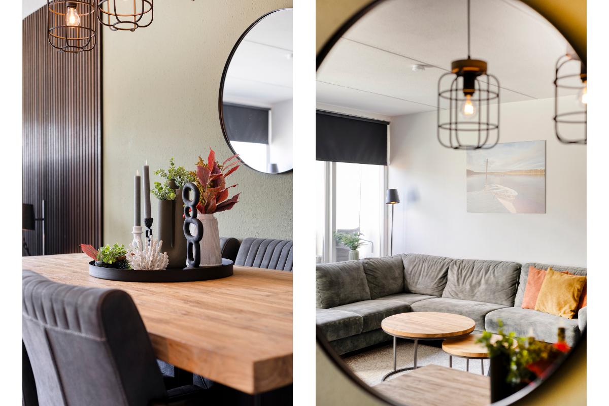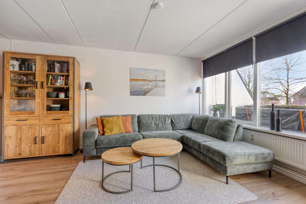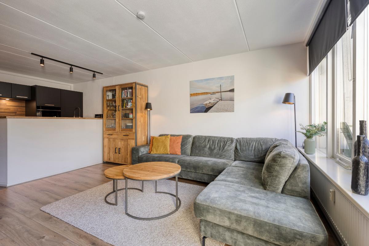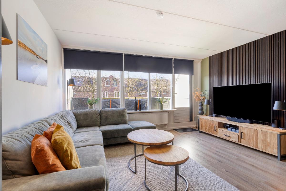 Woonkamer: De woonkamer is voorzien van een strak gestuukte wanden en een houten wandpaneel, wat zorgt voor een verzorgde en moderne uitstraling. Vanuit de woonkamer is er directe toegang tot het balkon die tevens is uitgerust met een hordeur.