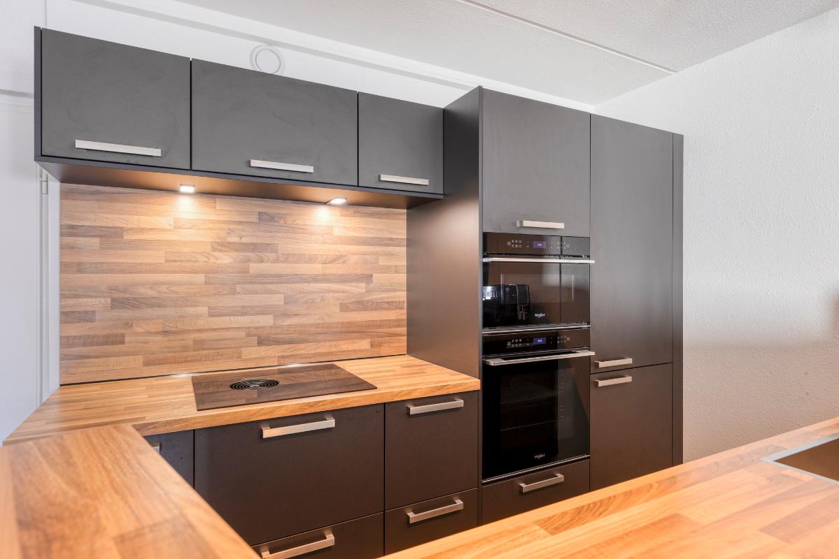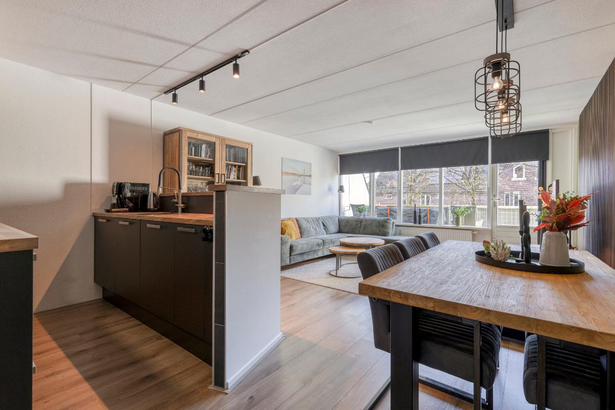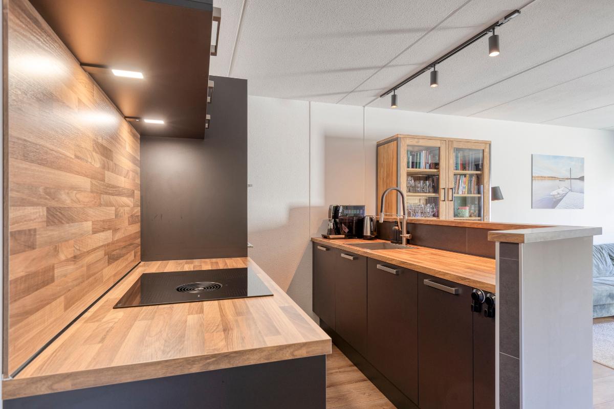 Keuken: De woning beschikt over een open keuken, vernieuwd in 2023, uitgevoerd met kunststof werkbladen met houtlook. De keuken is volledig uitgerust met hoogwaardige Whirlpool-apparatuur, waaronder een koevriescombinatie, een magnetron, een oven, een inductiekookplaat (Bora) met geïntegreerde afzuiging, een vaatwasmachine en een enkele spoelbak met uittrekbare kraan. De keuken biedt daarnaast veel bergruimte en is voorzien van LED-inbouwverlichting boven de inductieplaat, wat het geheel zowel functioneel als stijlvol maakt.