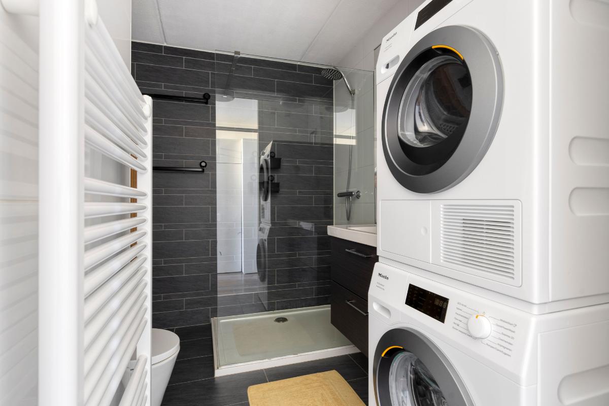 Badkamer: De luxe badkamer, vernieuwd in 2017, is voorzien van een ruime inloopdouche met regendouche, een wastafel met bijbehorend meubel, en een zwevend toilet. De spiegelkast en een designradiator maken de ruimte compleet. Daarnaast zijn hier de aansluitingen voor de wasmachine en droger te vinden.