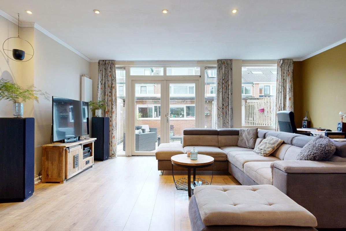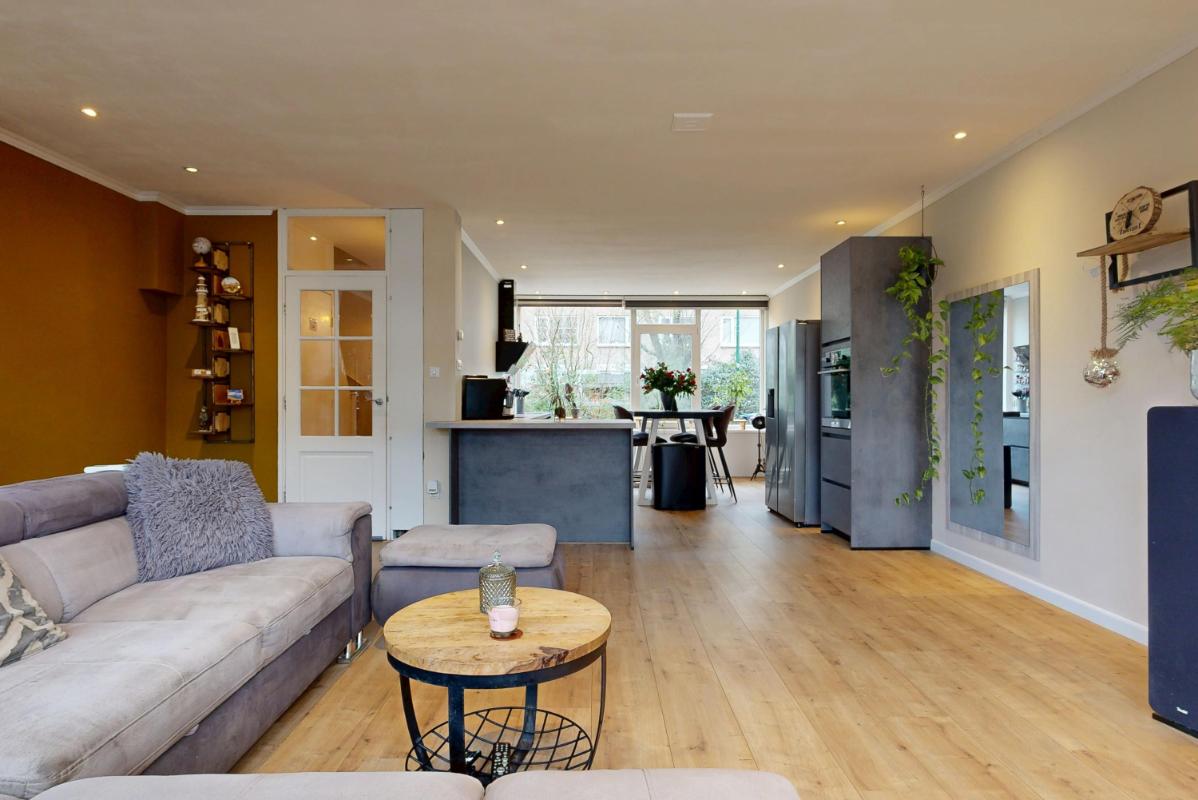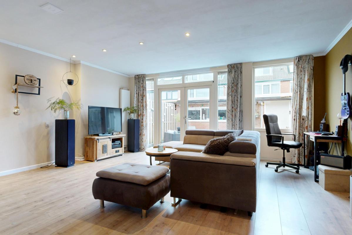 De uitgebouwde woonkamer (uitbouw gerealiseerd in 2022) vormt samen met de open keuken het hart van de woning. Dankzij de uitbouw en grote raampartijen is dit een lichte en aangename leefruimte.