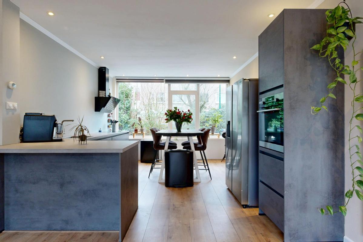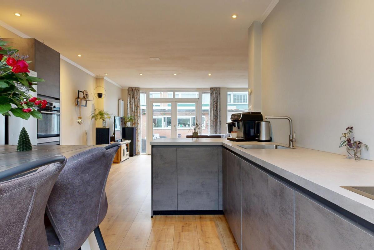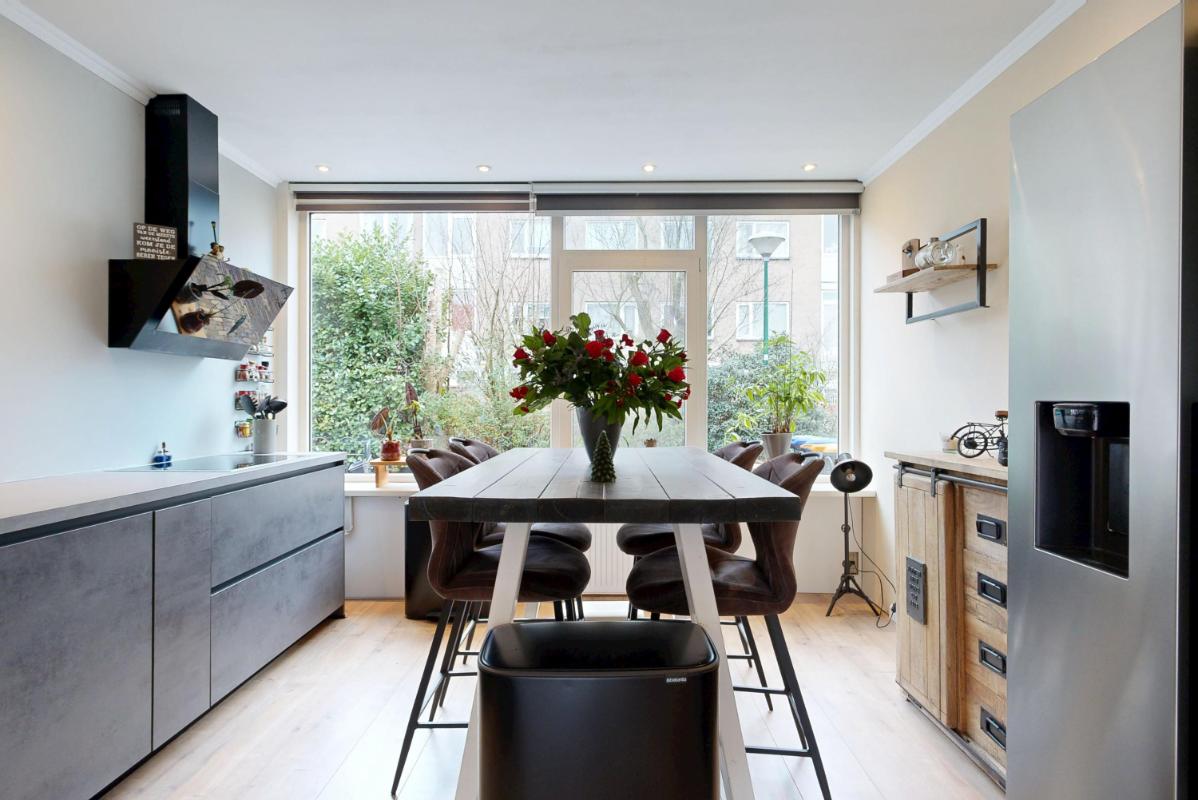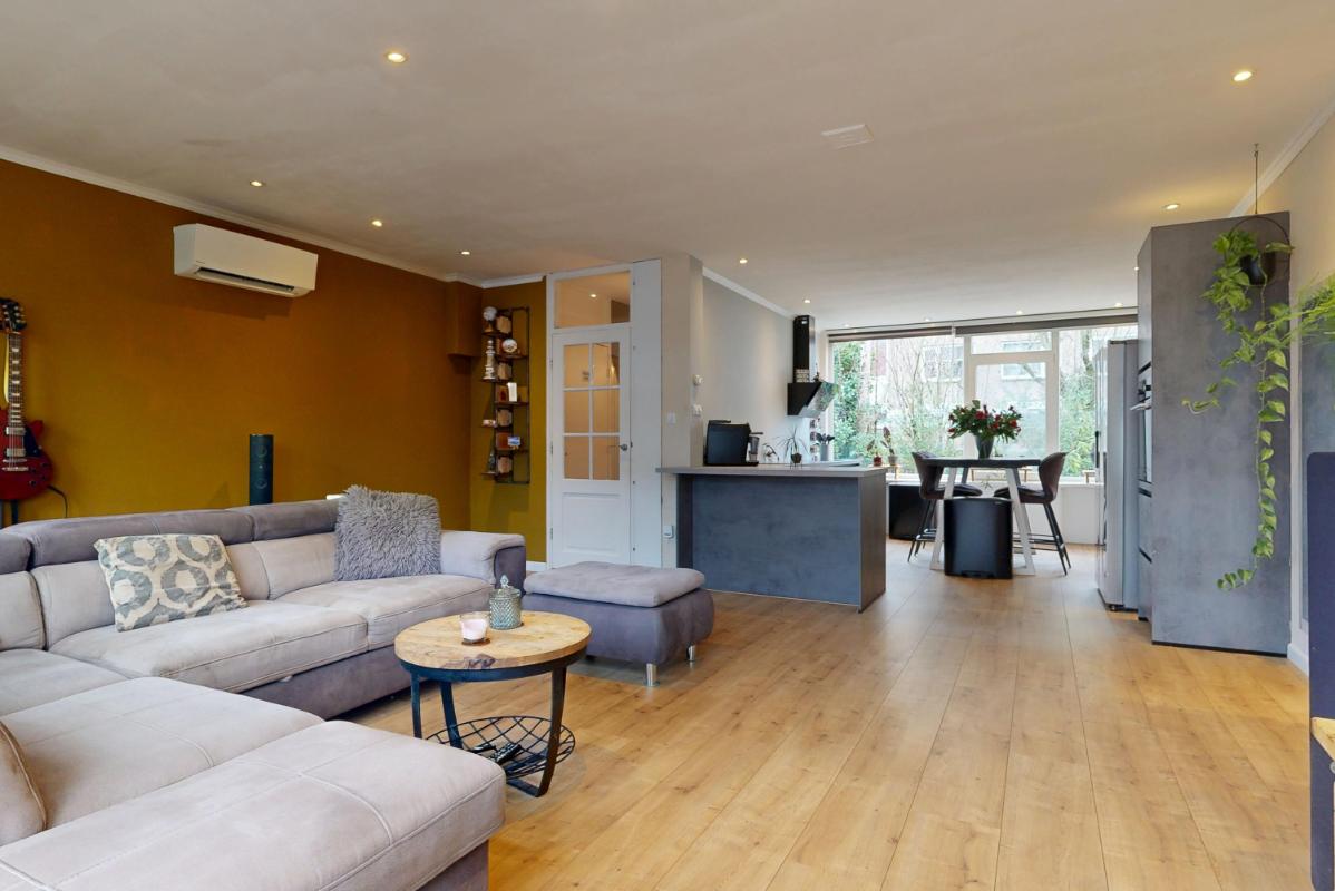 De uitgebouwde woonkamer (uitbouw gerealiseerd in 2022) vormt samen met de open keuken het hart van de woning. Dankzij de uitbouw en grote raampartijen is dit een lichte en aangename leefruimte.