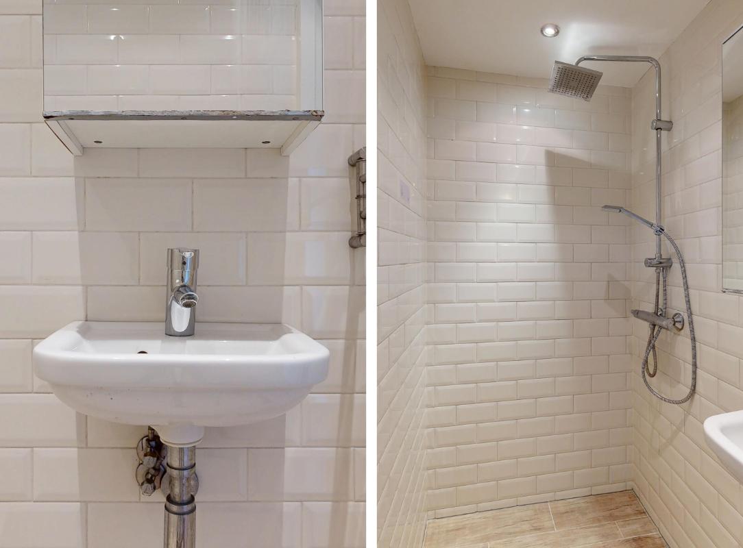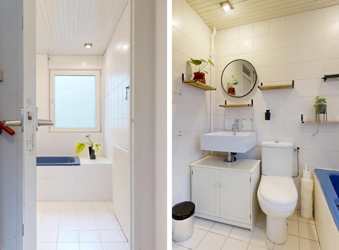 De badkamer is praktisch verdeeld over twee ruimtes: aan de voorzijde een badkamer met toilet, ligbad, wastafel en raam voor natuurlijke ventilatie. Ook is er een inpandig badkamer met douche en wastafel aanwezig.