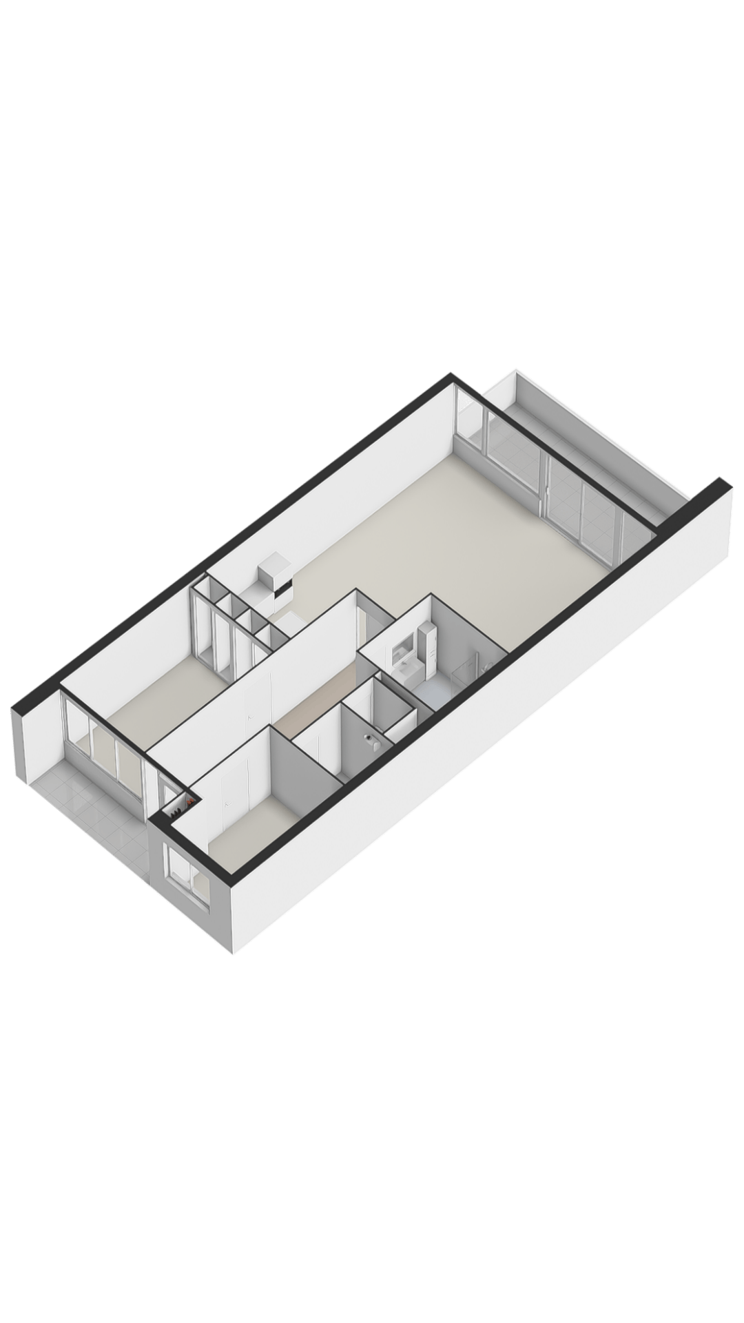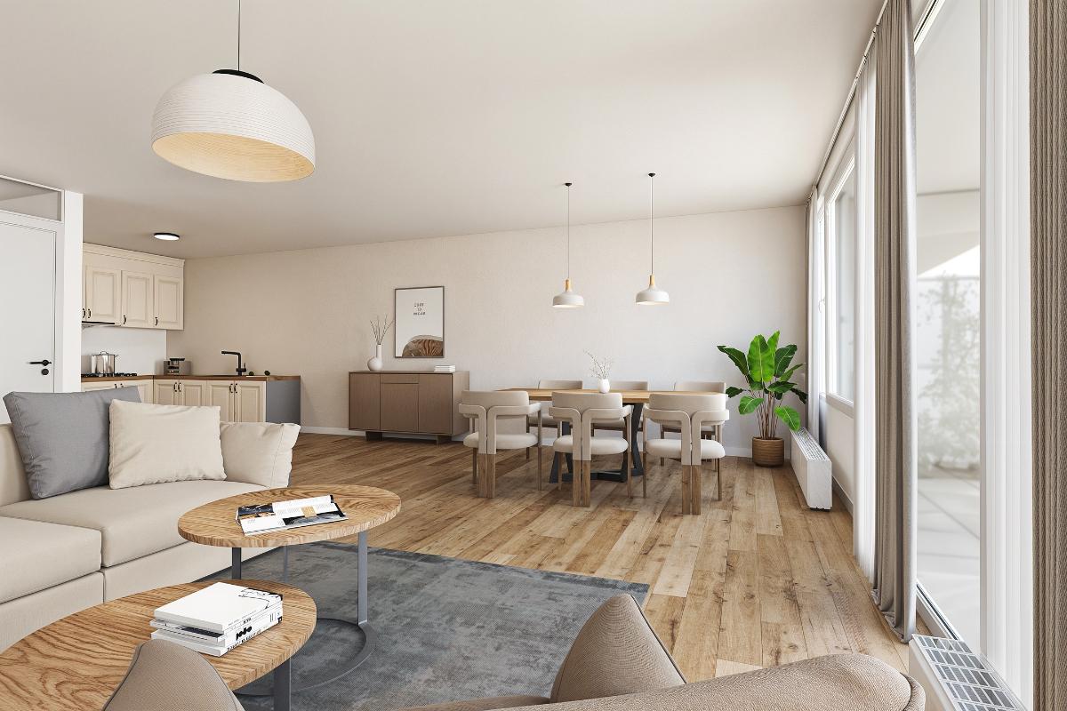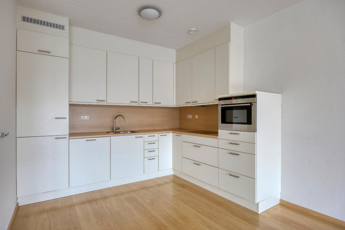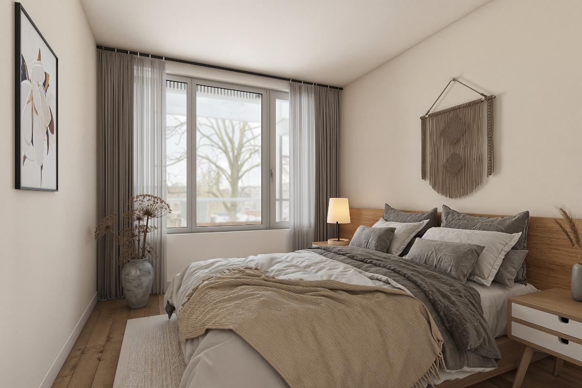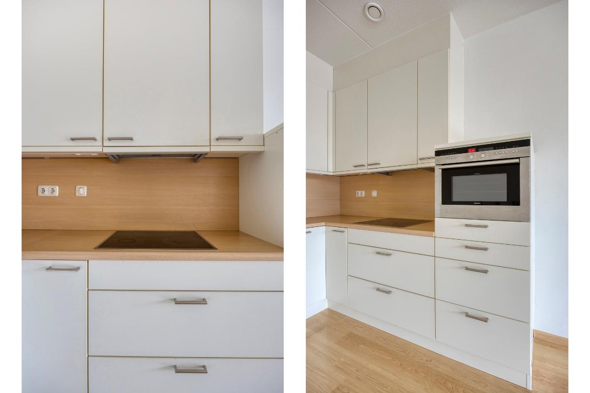Woonkamer: De ruime woonkamer met open keuken is heerlijk licht dankzij de riante raampartijen en de schuifpui, die direct toegang biedt tot het balkon. Daarnaast is de woonkamer voorzien van een intercom.
