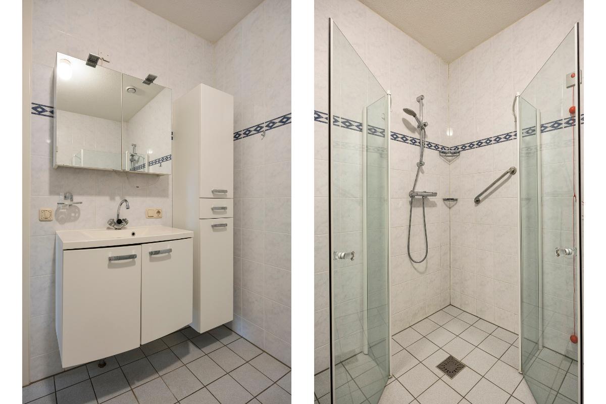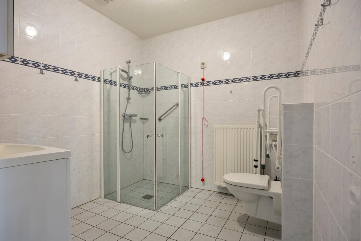 Badkamer: De volledig betegelde badkamer is netjes en comfortabel ingericht met een inloopdouche met dubbele deuren, een wastafel met wastafelmeubel, een praktische toiletkast en een radiator. (noodalarmering via trekkoord aanwezig)