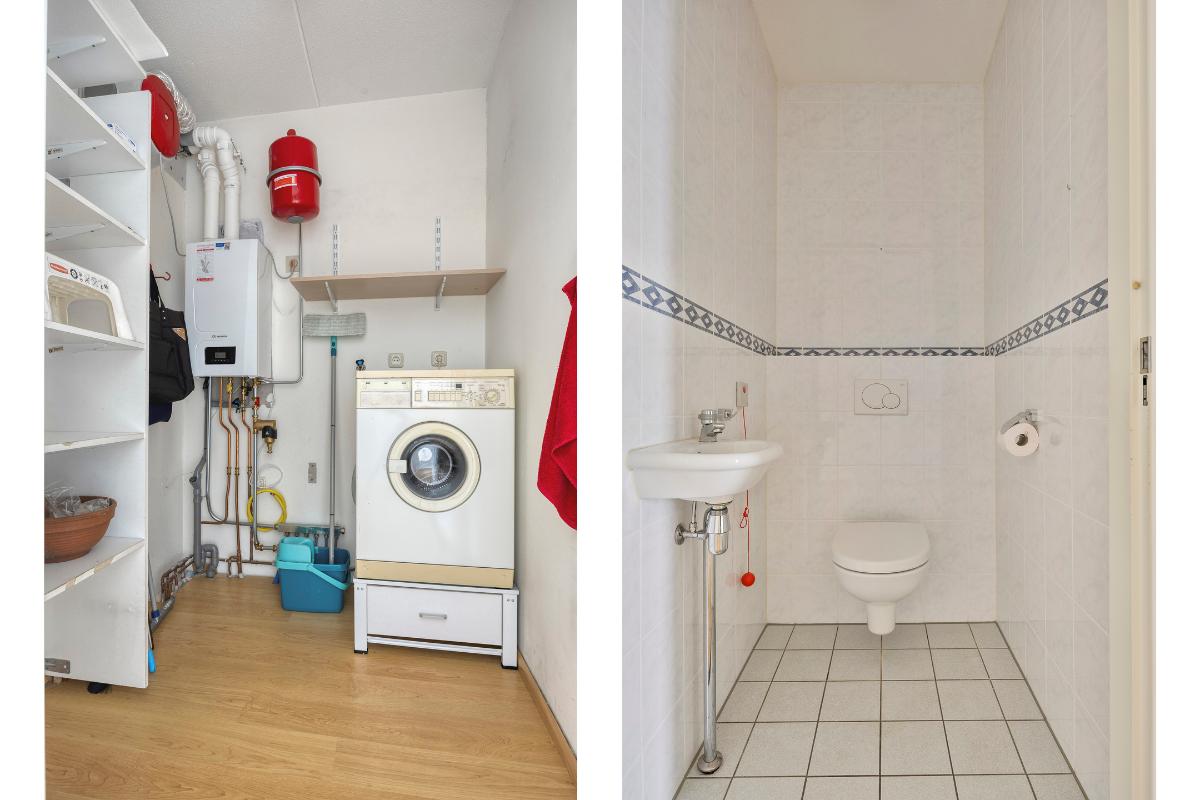 Cv-/wasruimte: De cv-ruimte biedt plaats aan de cv-ketel (Remeha 2023), de mechanische ventilatie (2021) en is voorzien van een wasmachine- en drogeraansluiting.