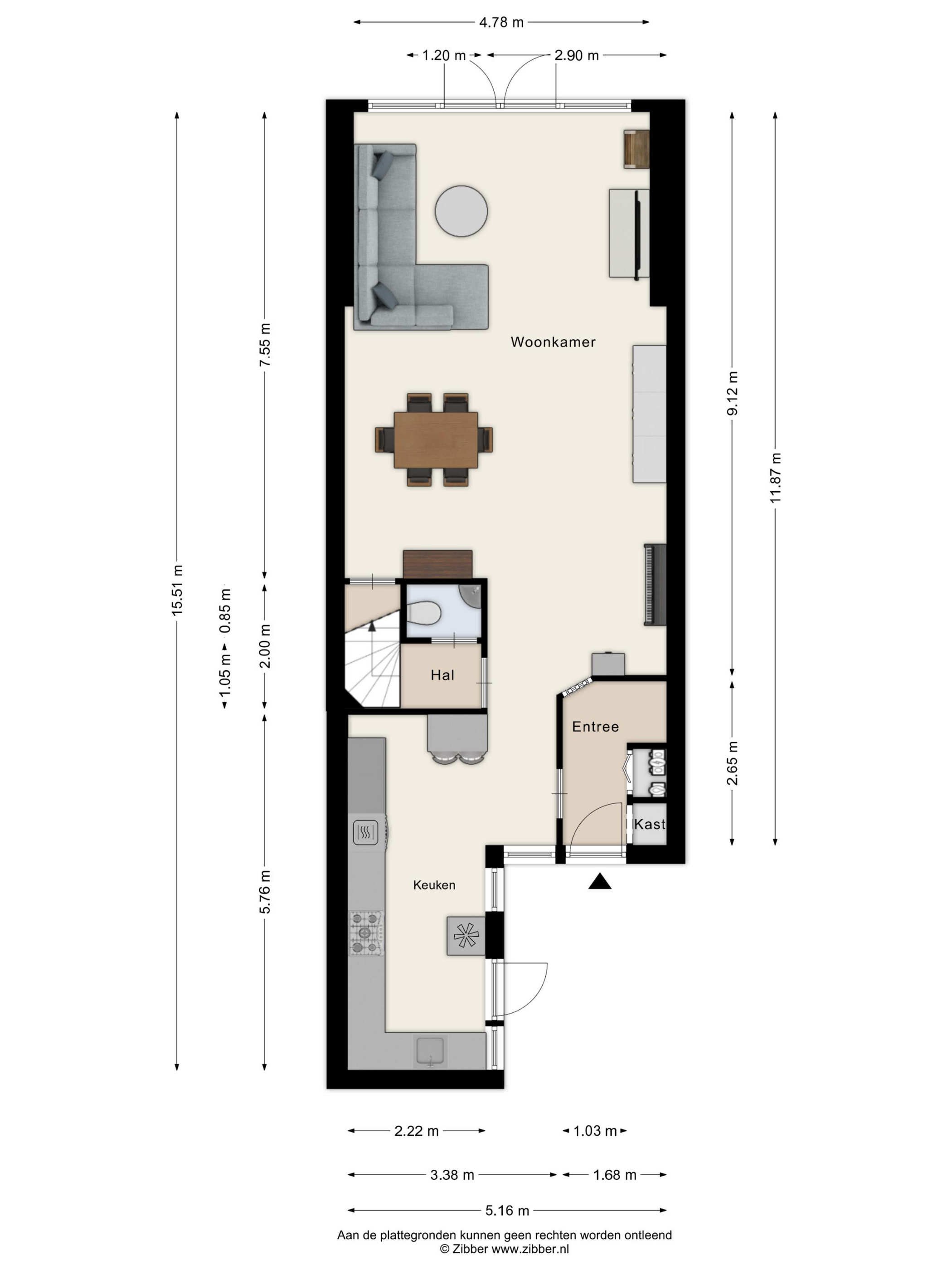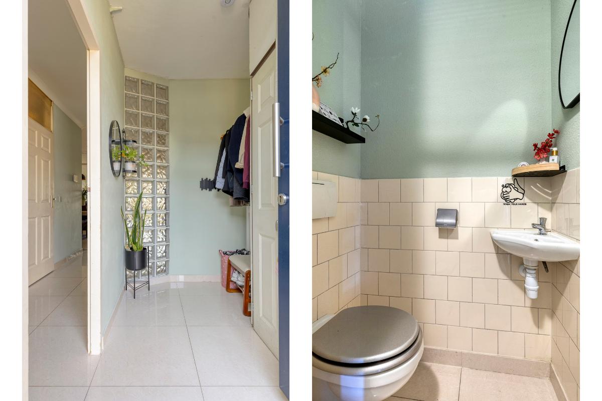 Hal: De hal biedt toegang tot de woonkamer en is praktisch ingericht met de meterkast, een voorraadhoek voorzien van bergplanken en een garderobehoek voor jassen, tassen en schoenen.