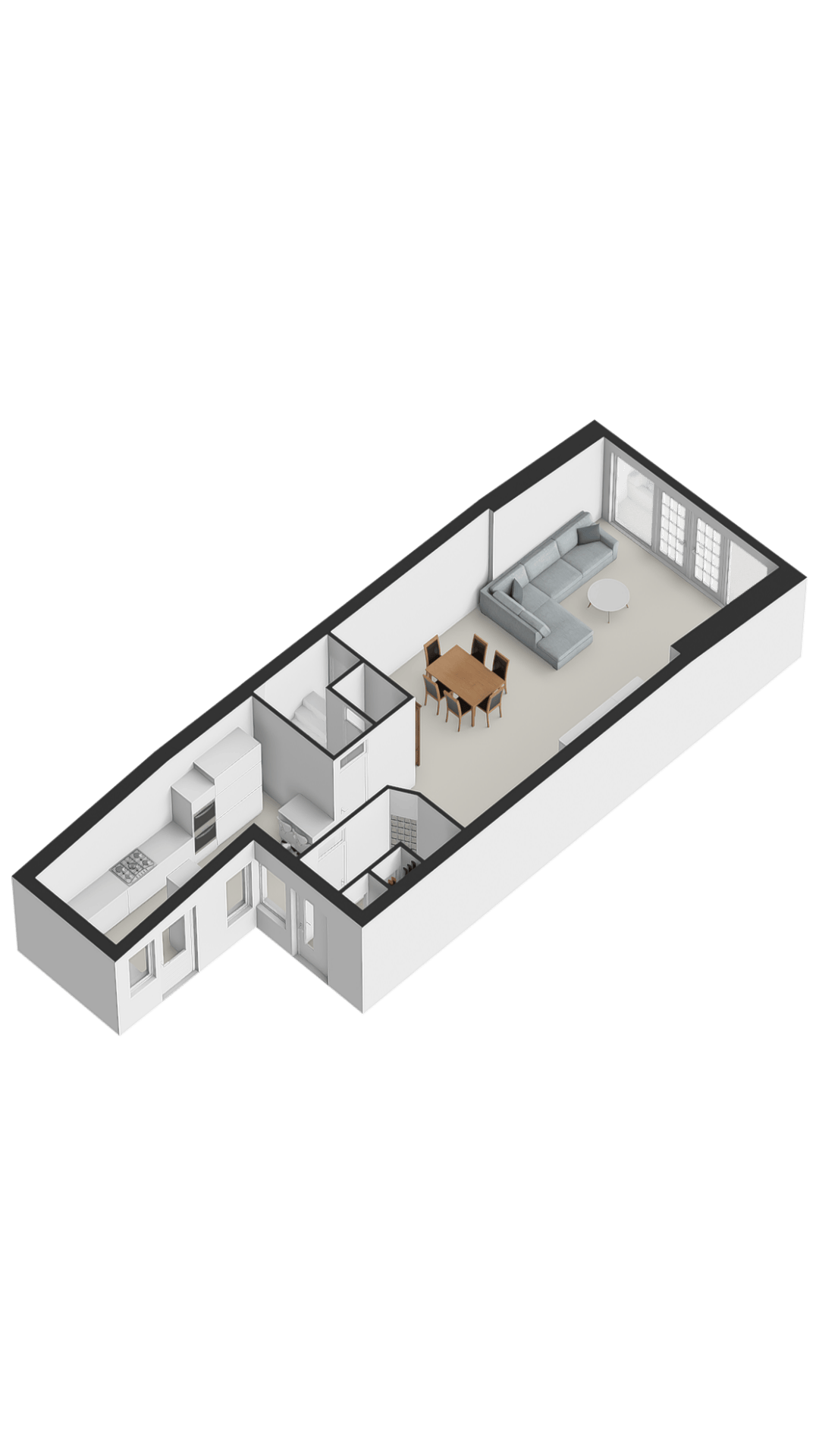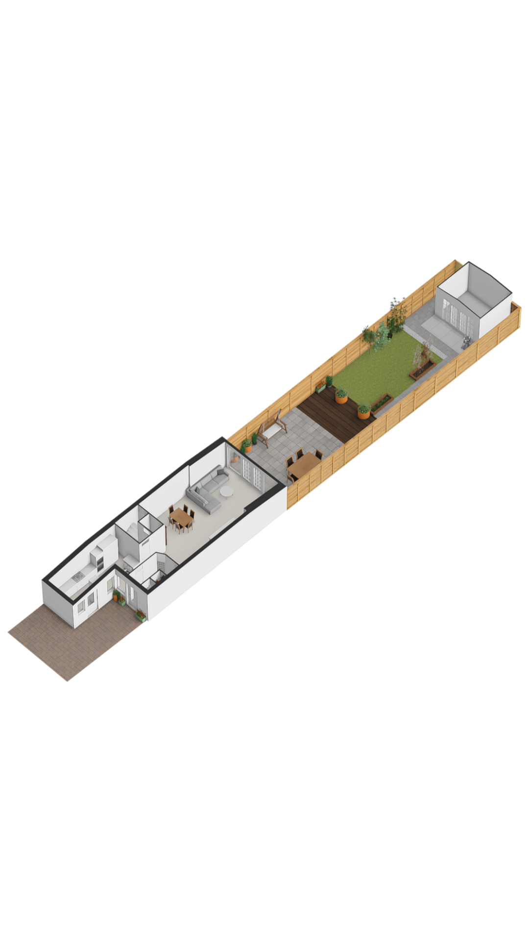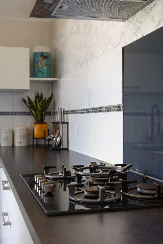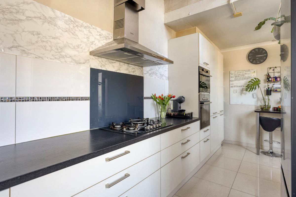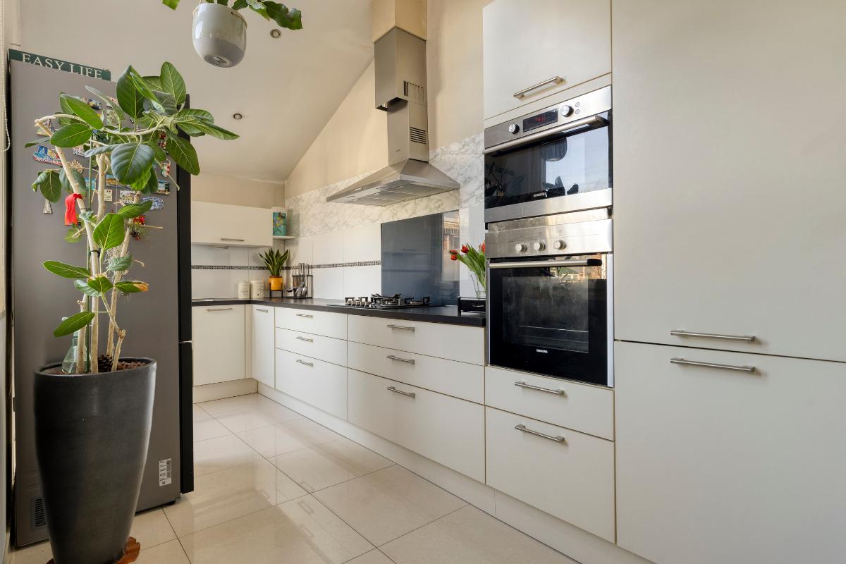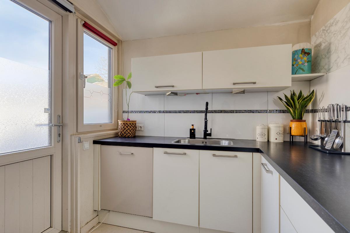 Keuken: De keuken, gerealiseerd door de voormalige berging bij de woning te betrekken, is voorzien van diverse inbouwapparatuur, waaronder een 4-pits gaskookplaat met wokbrander en afzuigkap, een oven, een magnetron, een vaatwasmachine en een enkele spoelbak met uittrekbare kraan. Daarnaast biedt de keuken veel bergruimte en via de deur is er directe toegang tot de voortuin.