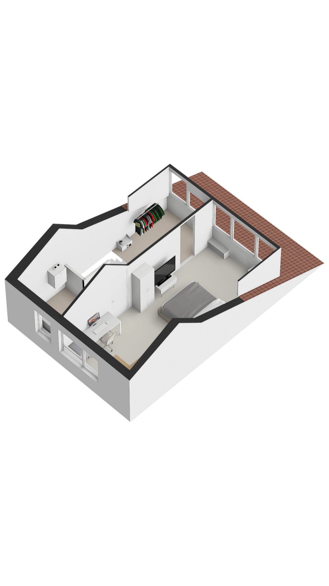Slaapkamers: Slaapkamer 4: De riante (master)slaapkamer is voorzien van een dakkapel met elektrische rolluiken, knieschotten en inbouwspots, en heeft een open verbinding met de overloop.