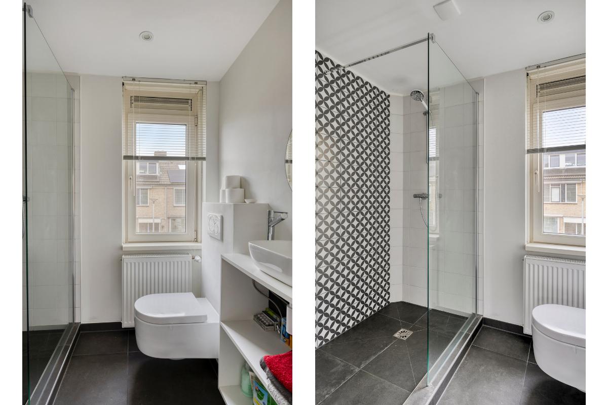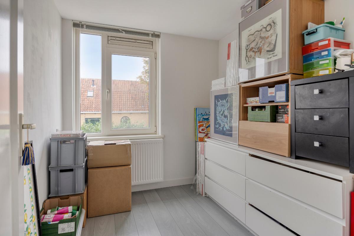 Eerste verdieping: De gehele eerste verdiepingsvloer is voorzien van laminaat en de kozijnen zijn hier allemaal van kunststof met een draai-/kiepsysteem. Op de overloop is er een bergkast en de vaste trap naar de tweede verdieping. Aan de achterzijde van de woning zijn twee slaapkamers gesitueerd en aan de voorzijde de derde slaapkamer en de eerste badkamer. De badkamer beschikt over een tweede toilet, een ruime inloopdouche en een wastafelmeubel.