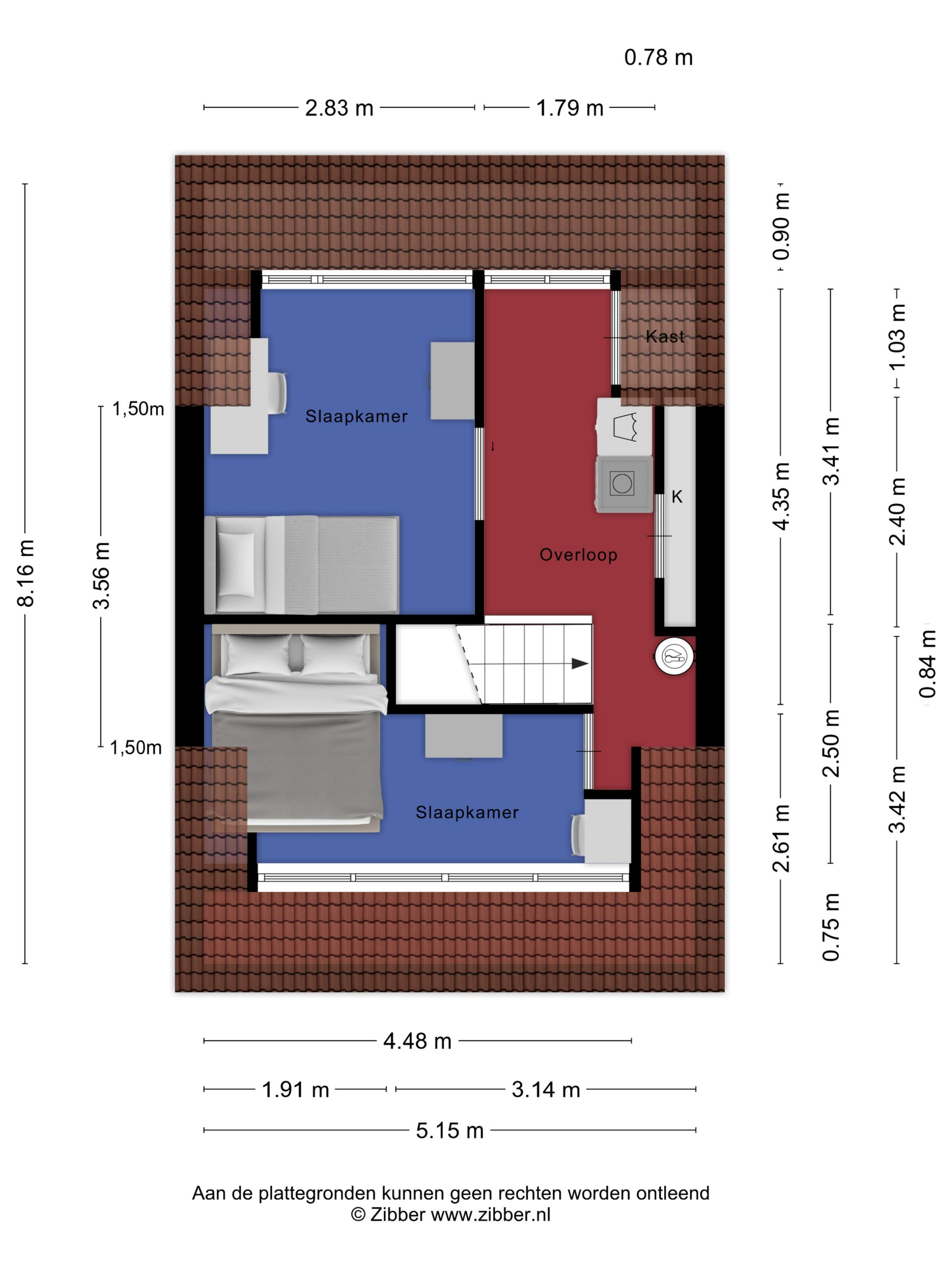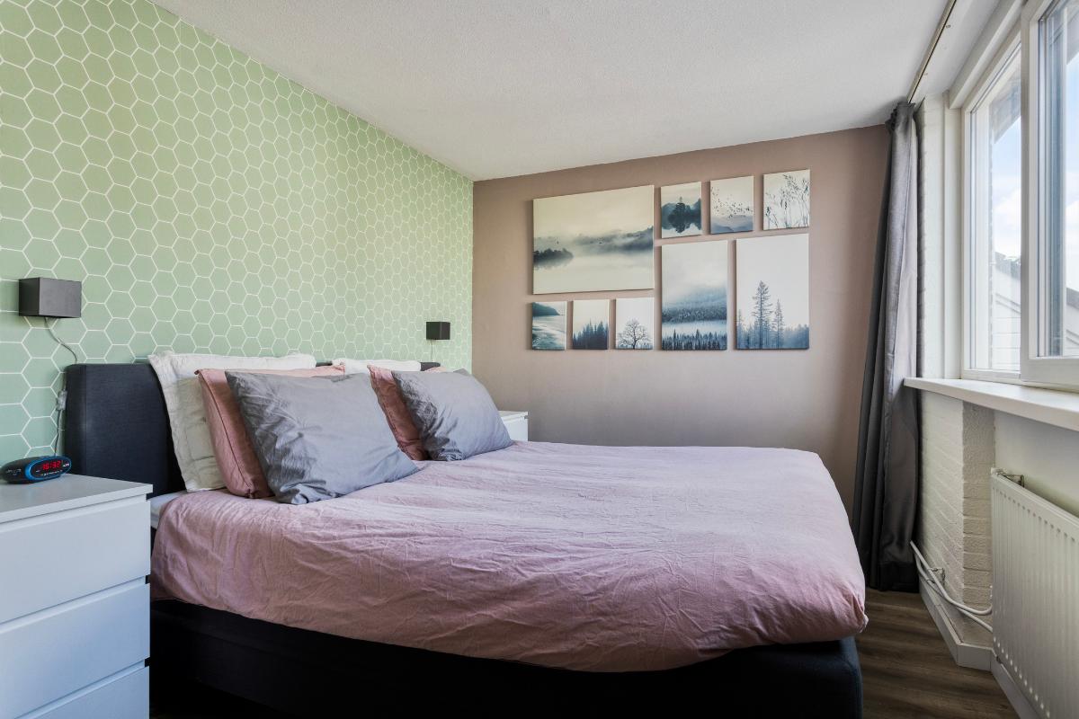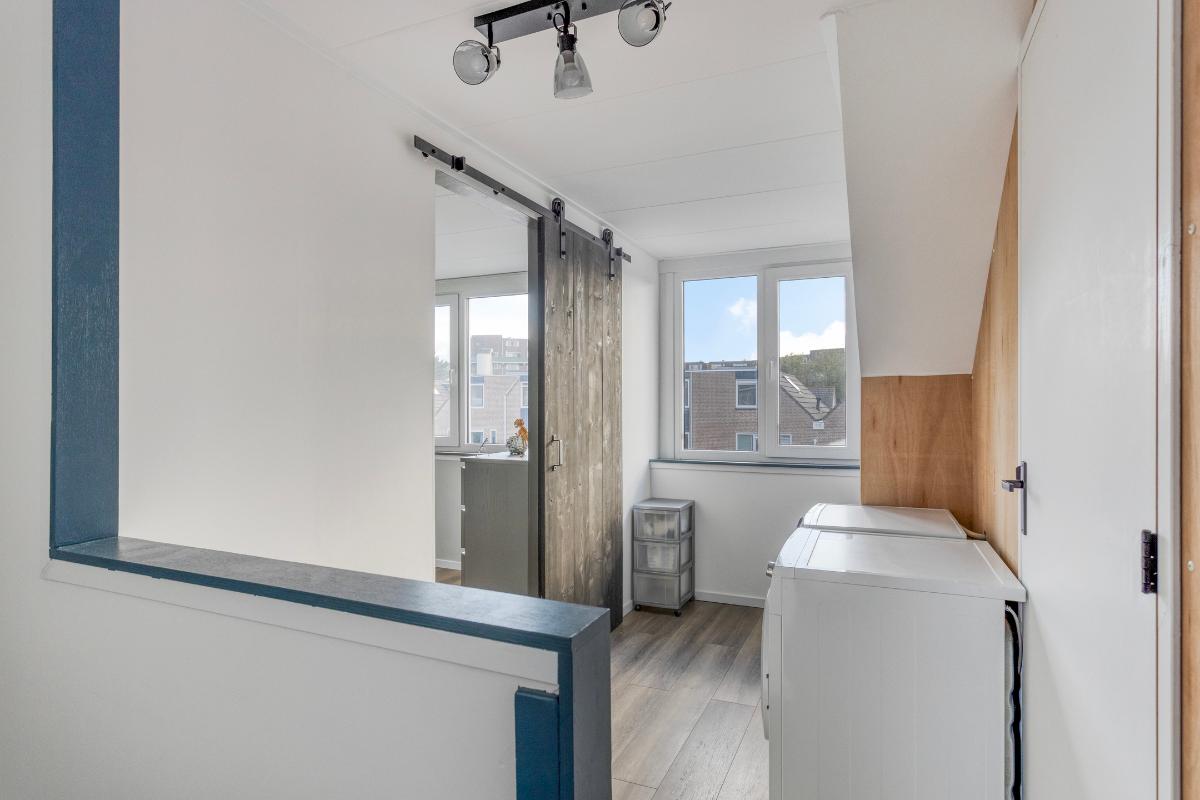 Tweede verdieping Overloop met wasmachineaansluiting en vaste kastenwand met opstelplaats van de Nefit HR cv-ketel. Dankzij de twee brede dakkapellen (2024) zijn hier twee volwaardige slaapkamers gerealiseerd. De gehele verdieping is afgewerkt met een laminaatvloer.