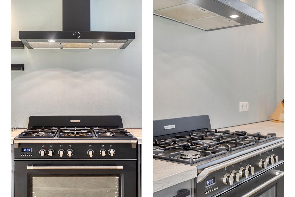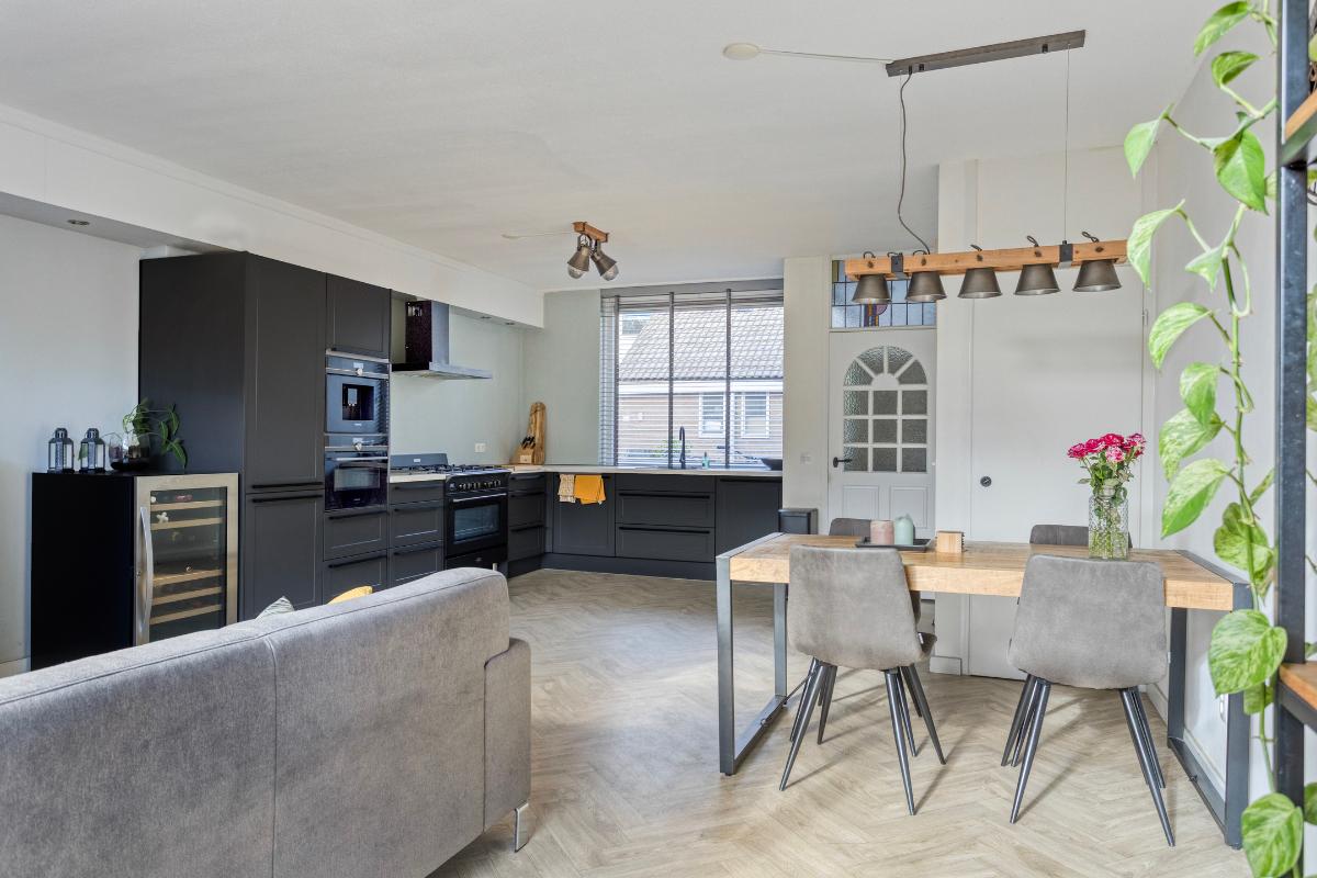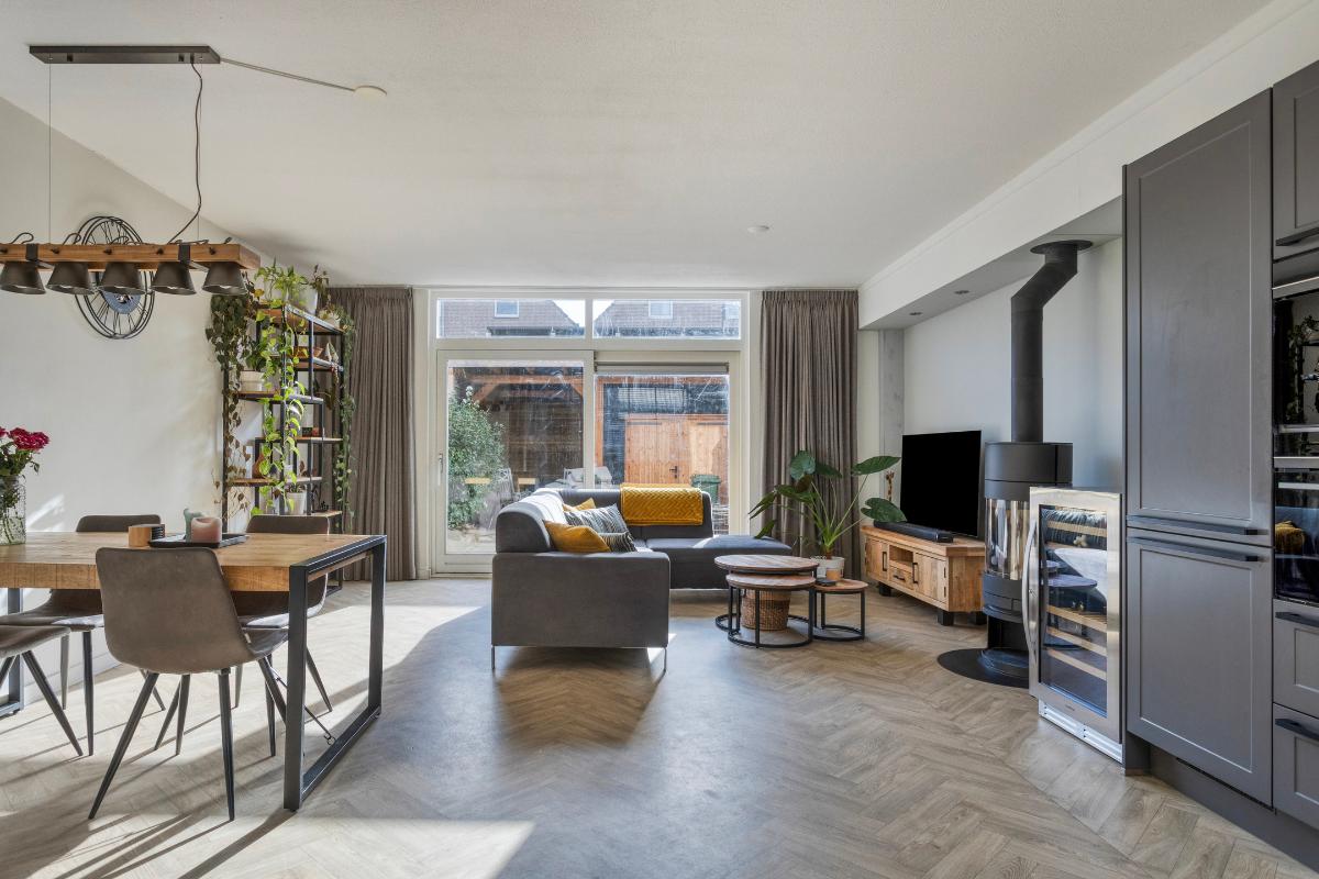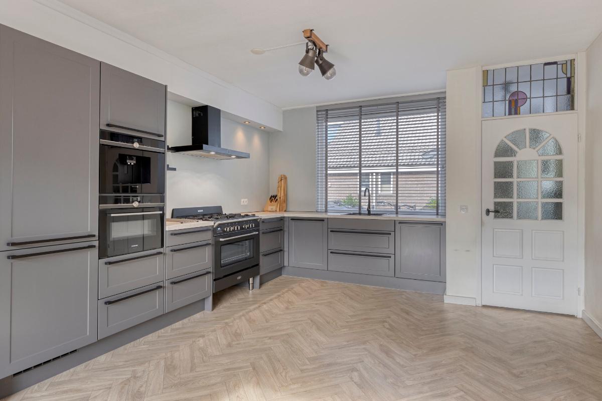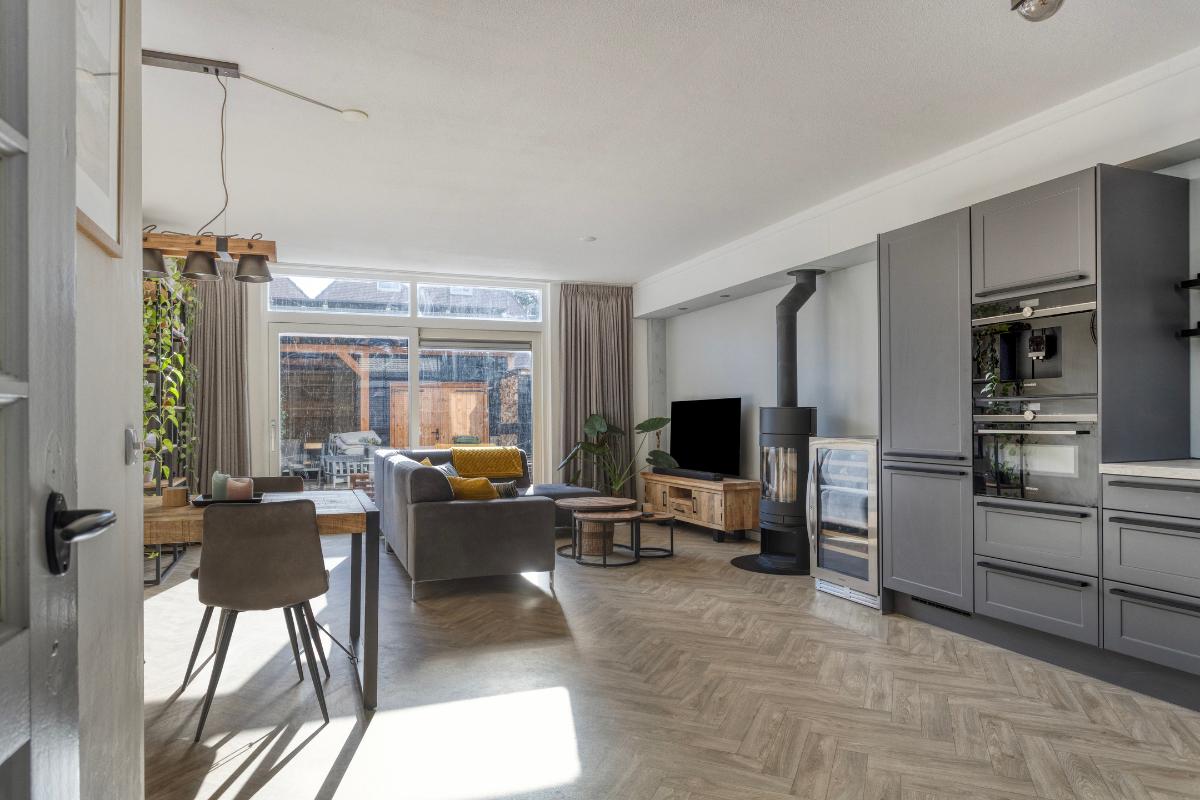 Indeling Begane grond Ruime entree hal met toilet, meterkast, trapopgang en garderobe ruimte. De lichte en zonnige woonkamer is voorzien van vloerverwarming, een visgraat vloer, trapkast en een draaibare houtkachel (ter overname). Via de grote schuifpui bereik je de achtertuin. De luxe open keuken (2020) is uitgevoerd in hoekopstelling en voorzien van onder andere een Boretti fornuis met 5 gaspitten, combi-oven, afzuigkap, Siemens inbouw koffiemachine, vaatwasser en koel-/vriescombinatie.