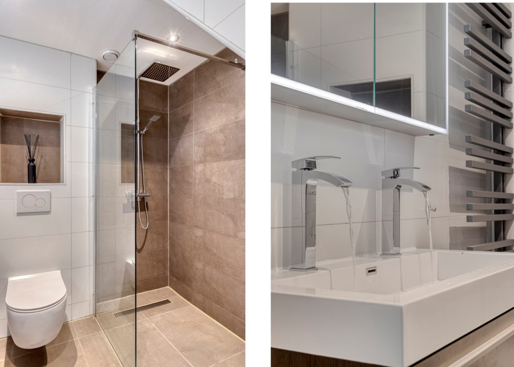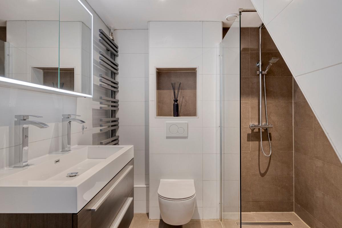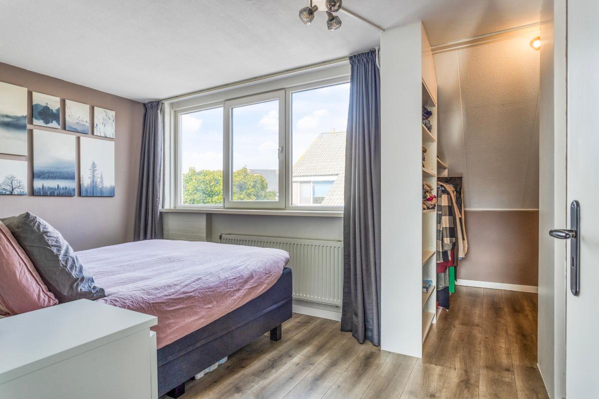 Eerste verdieping Overloop met trap naar de tweede verdieping. Royale slaapkamer aan de voorzijde met walk-in closet. Twee slaapkamers aan de achterzijde. Alle slaapkamers zijn voorzien van een nette laminaatvloer. De moderne badkamer (2020) beschikt over een ruime inloopdouche met regen- en handdouche, toilet, dubbele wastafel en handdoekradiator.