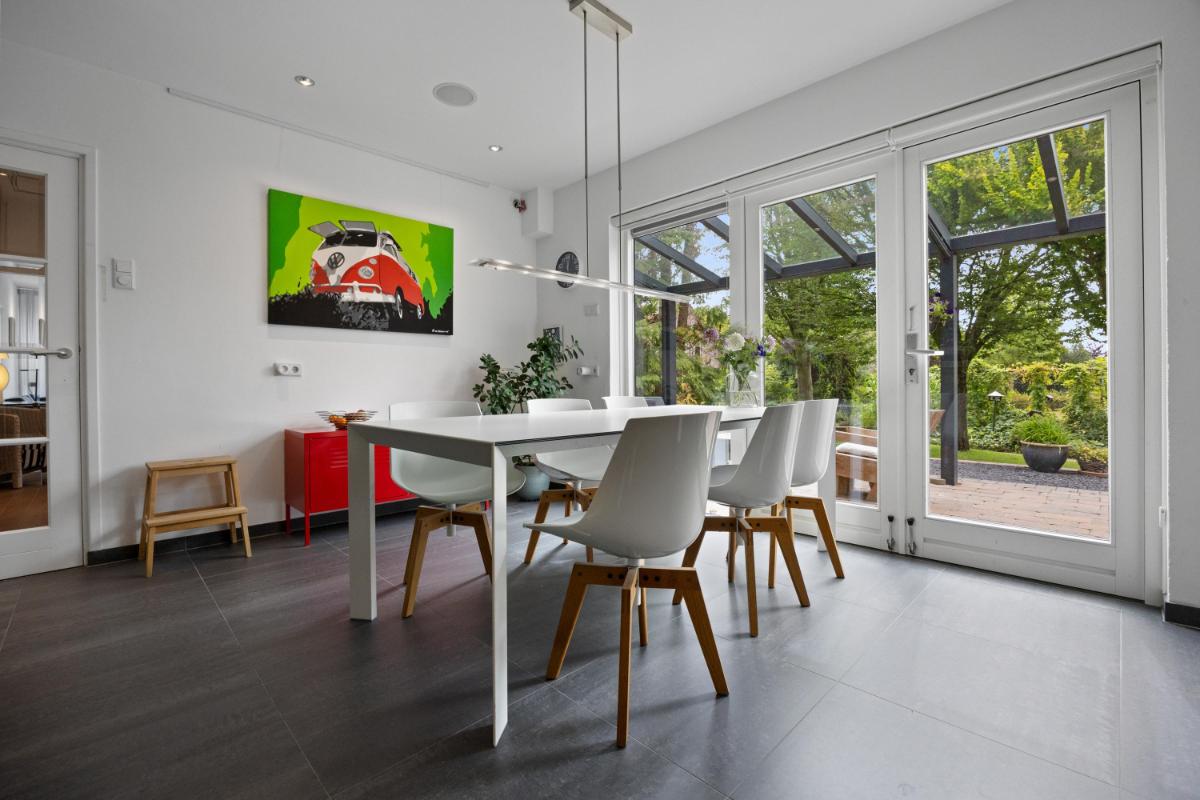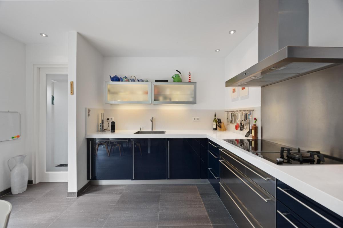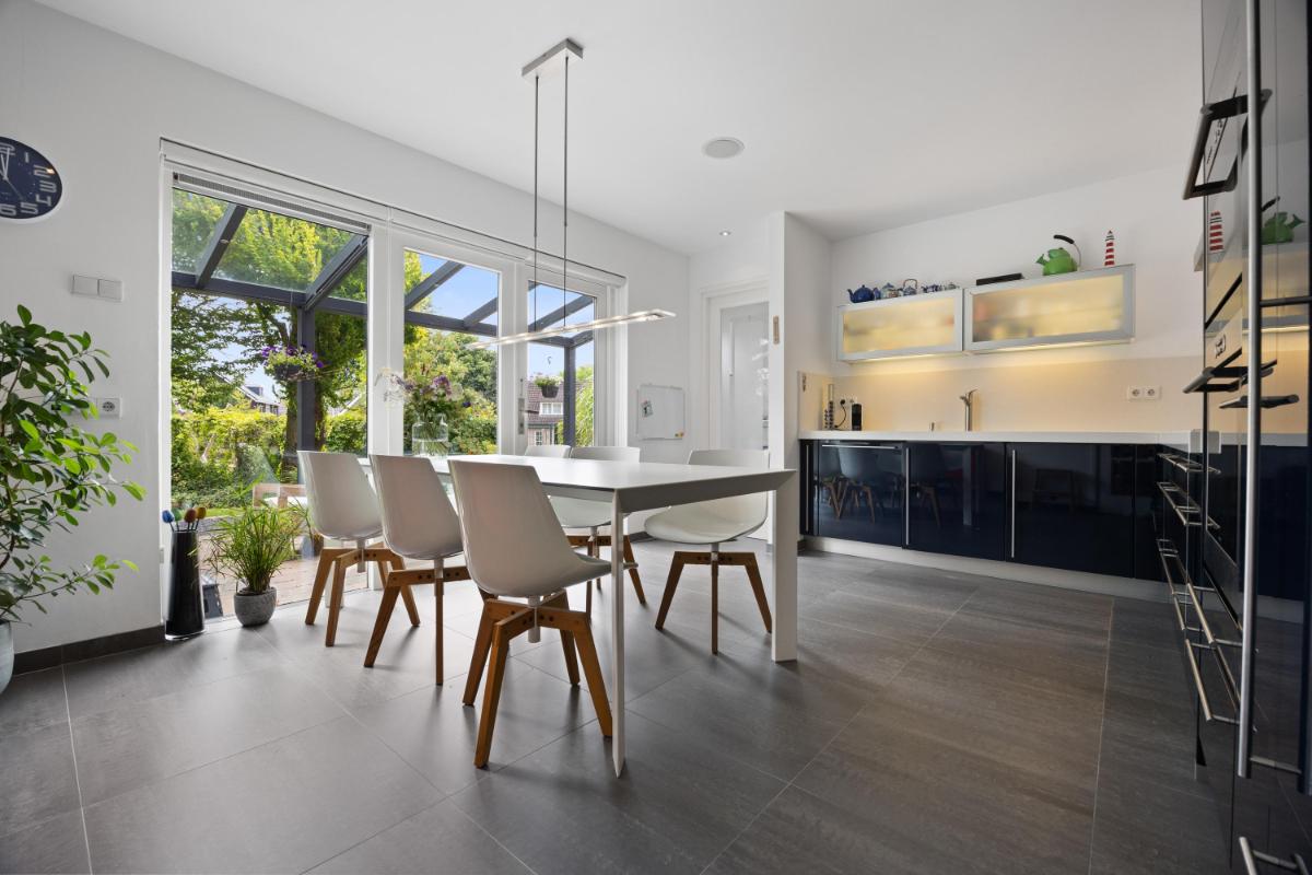 Dichte keuken voorzien van complete inbouwkeuken (2012) met o.a. inductiekookplaat, wokbrander, afzuigkap, combi-magnetron, oven, koelkast en vaatwasser. De keuken is voorzien van een keramische tegelvloer. Er is ruimte voor een grote eettafel en openslaande deuren welke toegang geven naar de zonnige tuin met veranda en elektrische zonwering.
