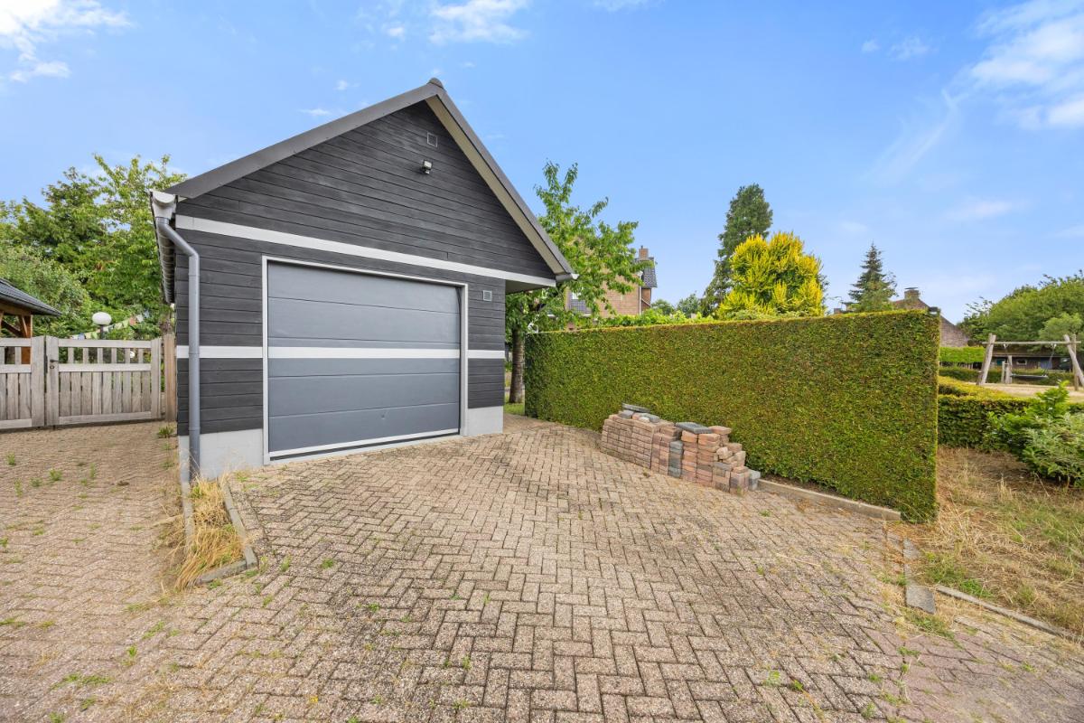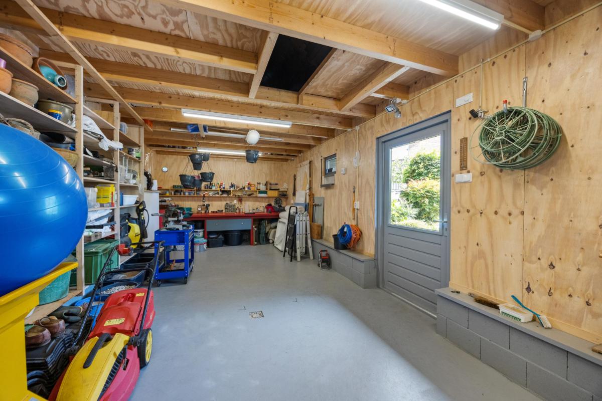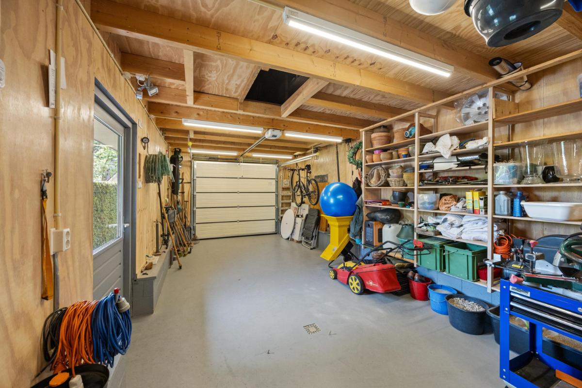 Een royale vrijstaande garage van 35 m², uitstekend geïsoleerd en voorzien van een praktische vliering van 11 m² en een grote werkbank – ideaal voor de fervente klusser of hobbyist.