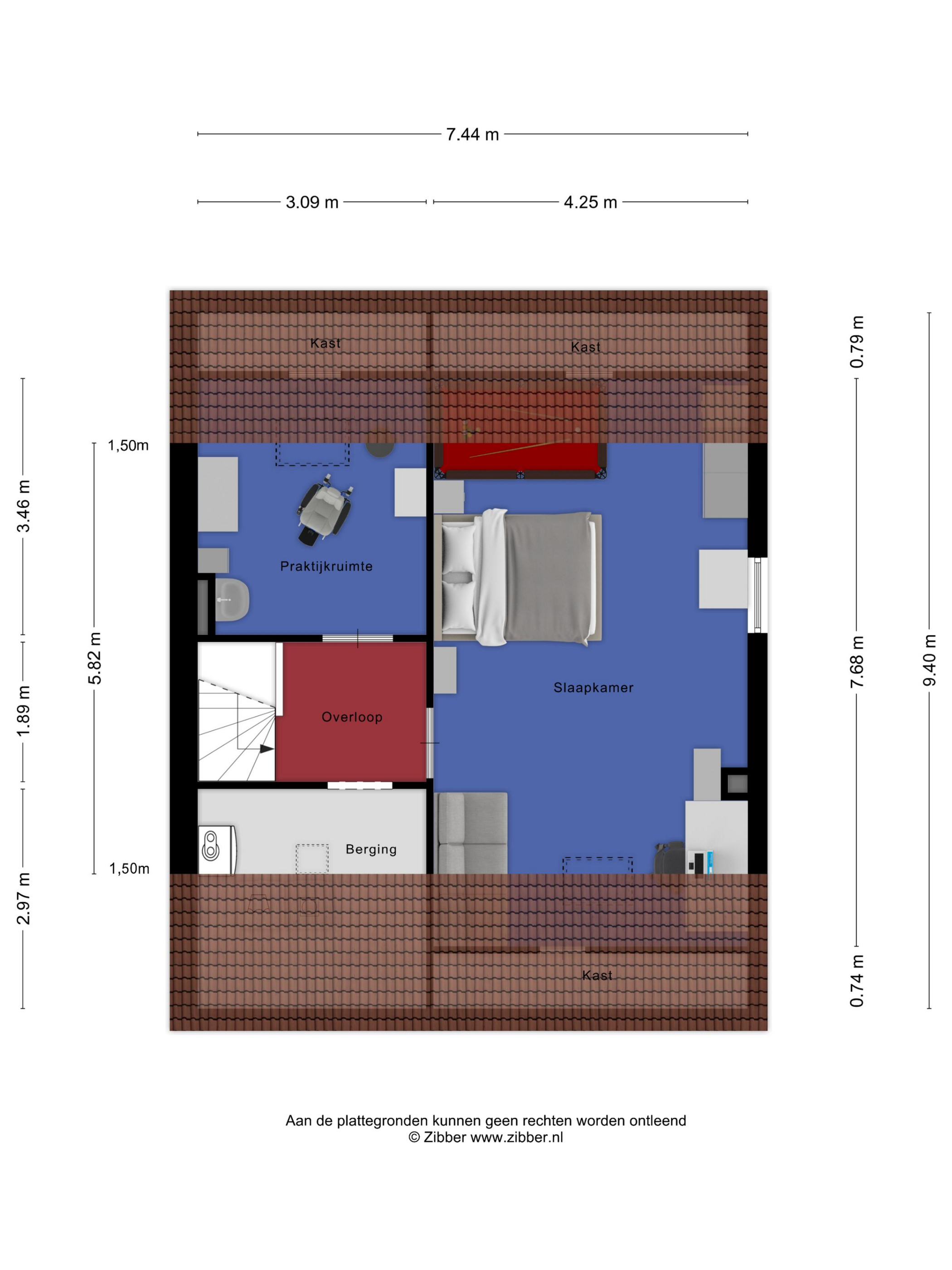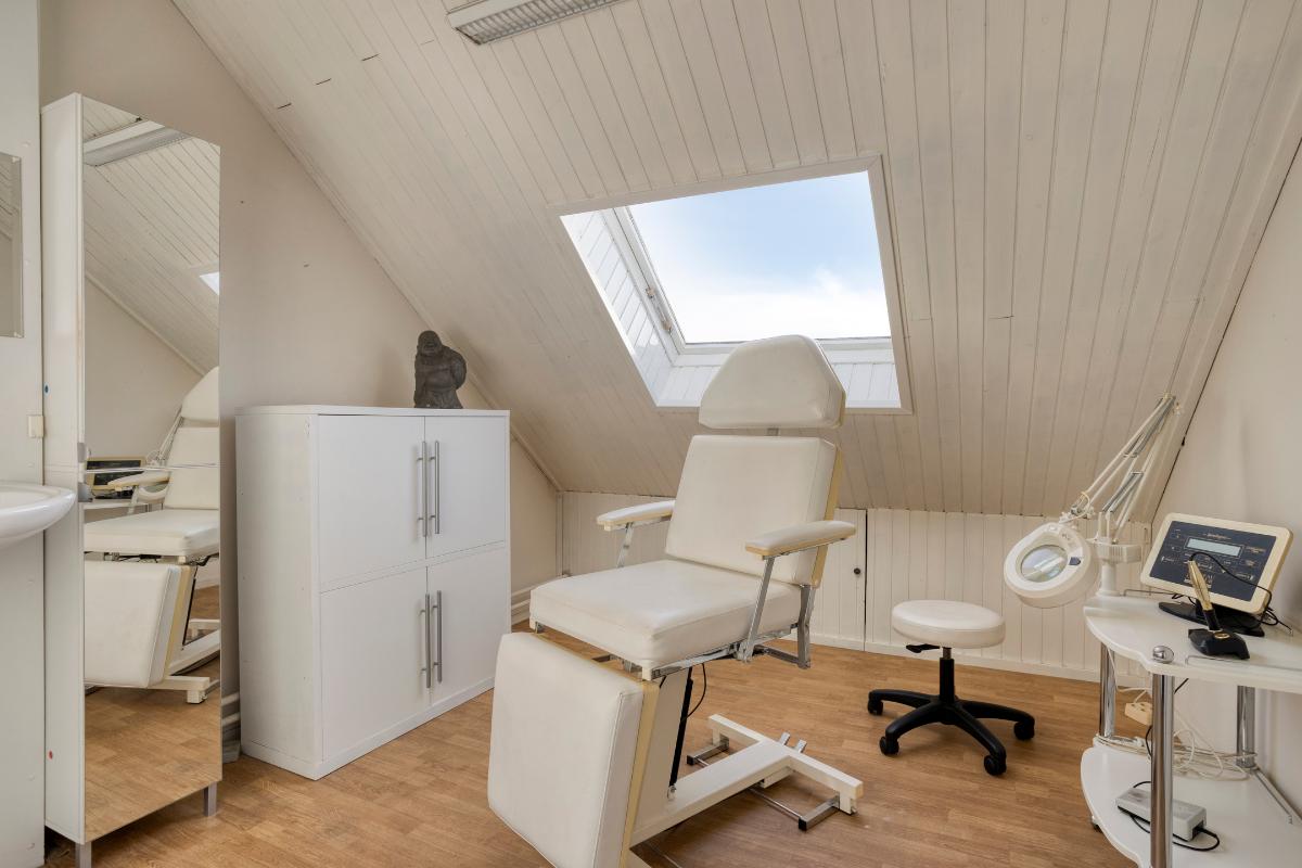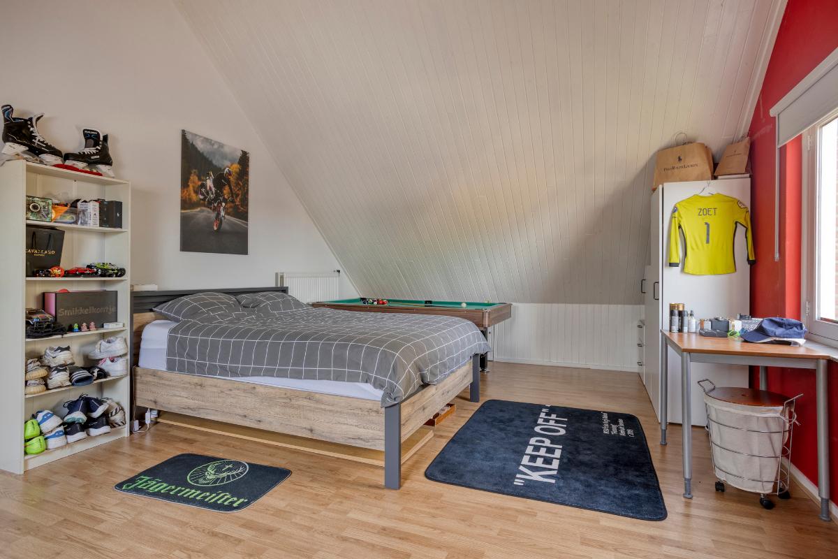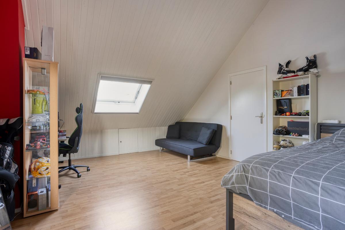 Slaapkamer 4 De zolderverdieping herbergt een verrassend ruime vierde slaapkamer, momenteel in gebruik als praktijkruimte, maar ook uitstekend geschikt als logeerkamer, werkkamer of hobbyruimte. In de kamer bevindt zich een kleine vliering met opbergruimte. Dankzij het dakraam valt er volop daglicht binnen, waardoor de kamer licht en aangenaam aanvoelt.