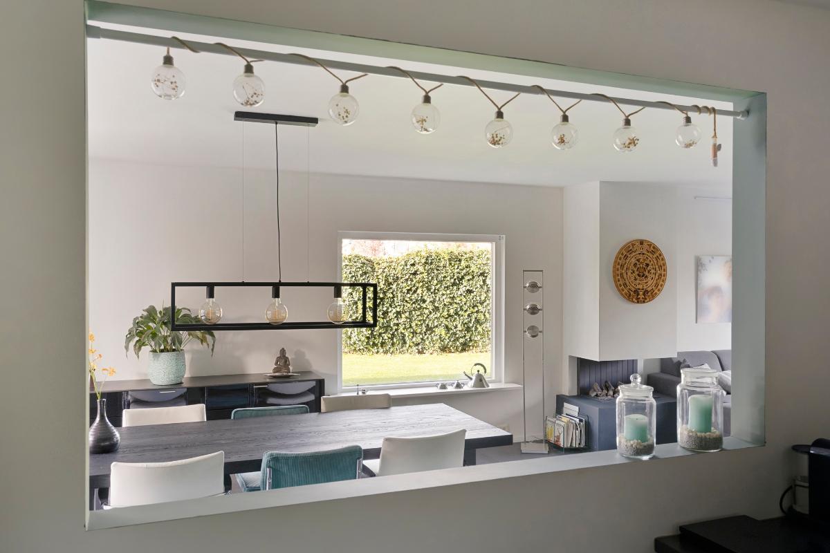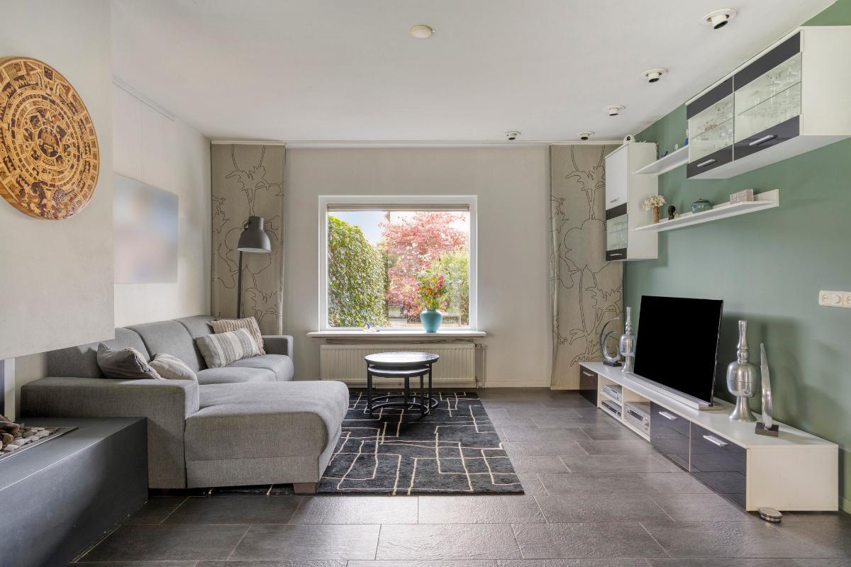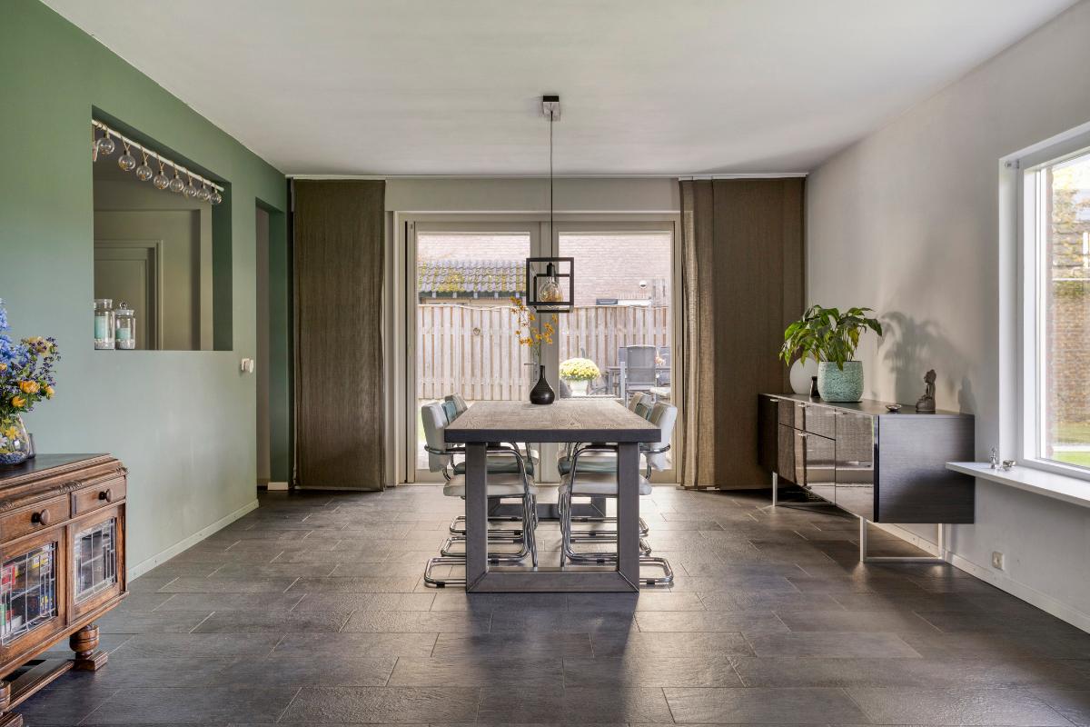 Woonkamer De riante woonkamer is een heerlijke leefruimte met een open en lichte uitstraling. Grote raampartijen aan zowel de voor- als achterzijde zorgen voor een overvloed aan daglicht en een fijn contact met de tuin. De ruimte is keurig afgewerkt met een donkere tegelvloer, gestuukte wanden en een strak plafond met inbouwspots, wat zorgt voor een moderne en verzorgde uitstraling.