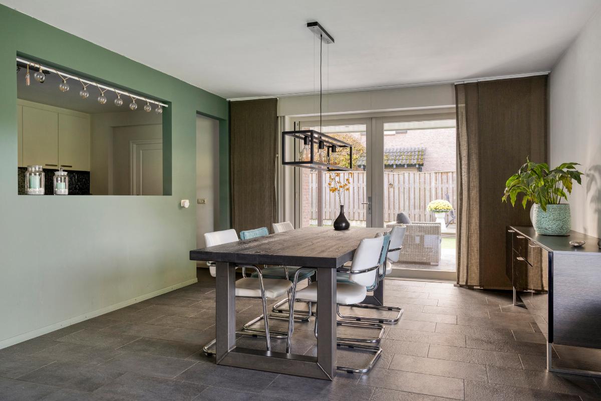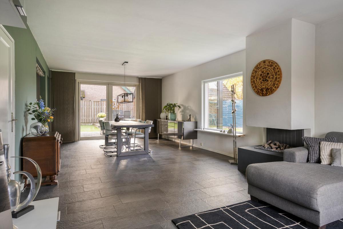 Centraal in de woonkamer bevindt zich een strakke gashaard, die niet alleen sfeer brengt maar ook het middelpunt vormt van het zitgedeelte. Aan de achterzijde is voldoende ruimte voor een royale eettafel; hier zorgen de grote openslaande deuren naar de tuin voor een prettige overgang tussen binnen en buiten.