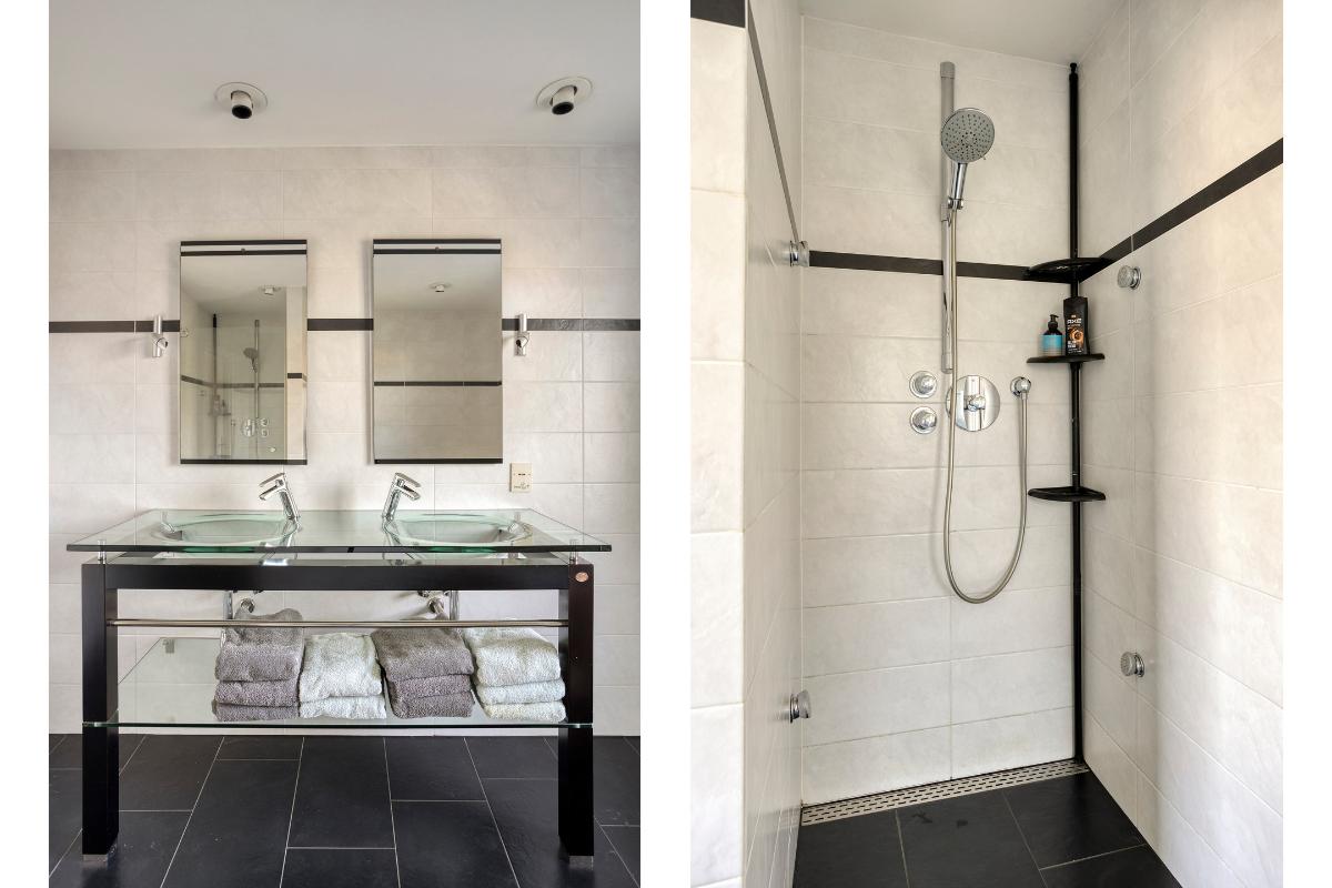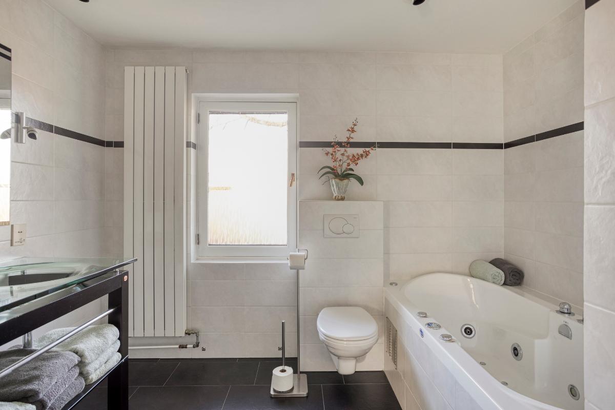 Badkamer De volledig betegelde badkamer is uitgevoerd in een lichte kleurstelling met een donkere vloer en sierstrip in de wand. De badkamer is luxe uitgerust met een ligbad met whirlpoolfunctie, inloopdouche met (zij)massagestralen, wastafelmeubel met dubbele wastafel en een hangcloset. Dankzij het raam valt er prettig daglicht binnen, terwijl de ruimte ook goed te ventileren is. Een moderne, complete en comfortabele badkamer met een luxe uitstraling.