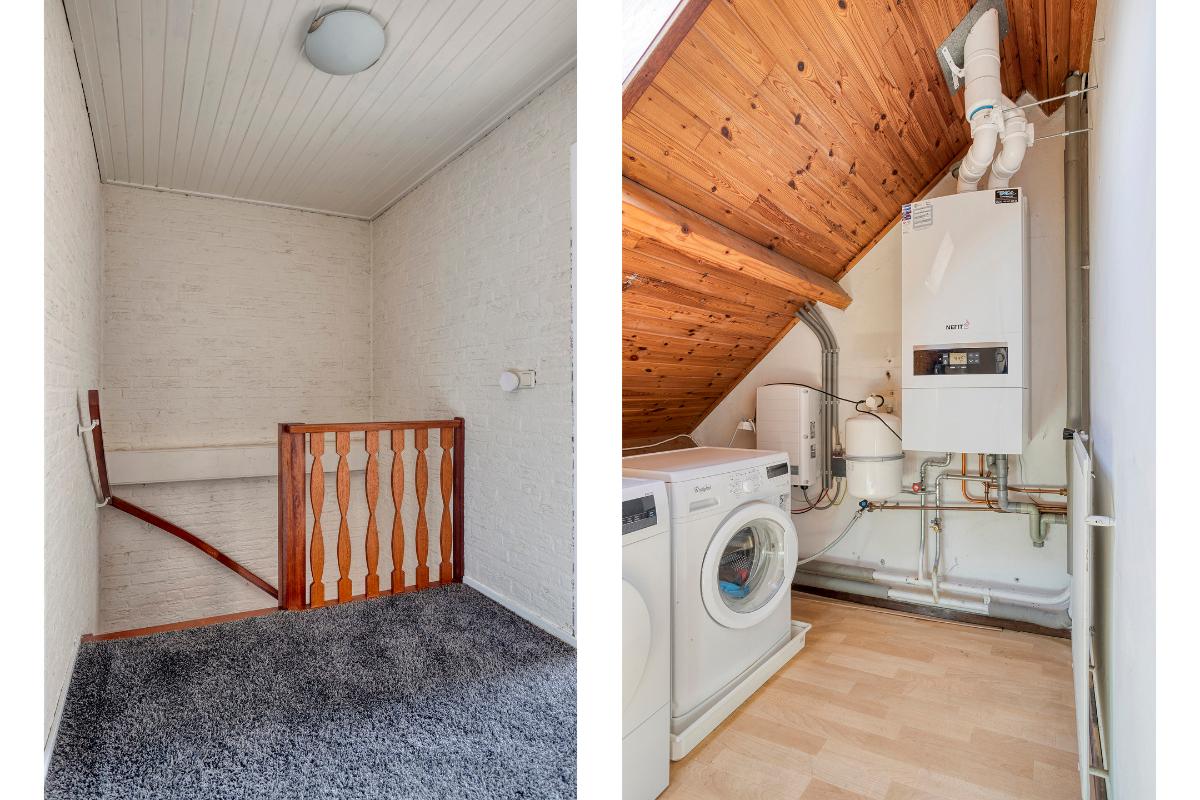 Was-/stookruimte In de separate technische ruimte bevinden zich de CV-installatie (Nefit, 2016), de omvormer van de zonnepanelen en de aansluitingen voor wasmachine en droger. De ruimte is praktisch ingericht met voldoende plaats voor apparatuur en bergruimte, en is afgewerkt met een lichte linoleum vloer en houten dakbeschot.