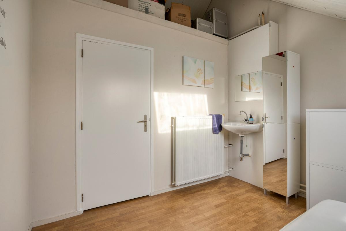 De ruimte is afgewerkt met een lichte laminaatvloer, geschilderde wanden en een wit houten dakafwerking. Verder is er een wastafel aanwezig en zijn er praktische bergruimtes achter de knieschotten, ideaal voor het opbergen van spullen die u niet dagelijks nodig heeft.
