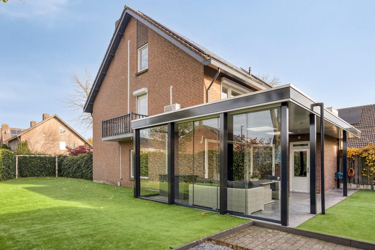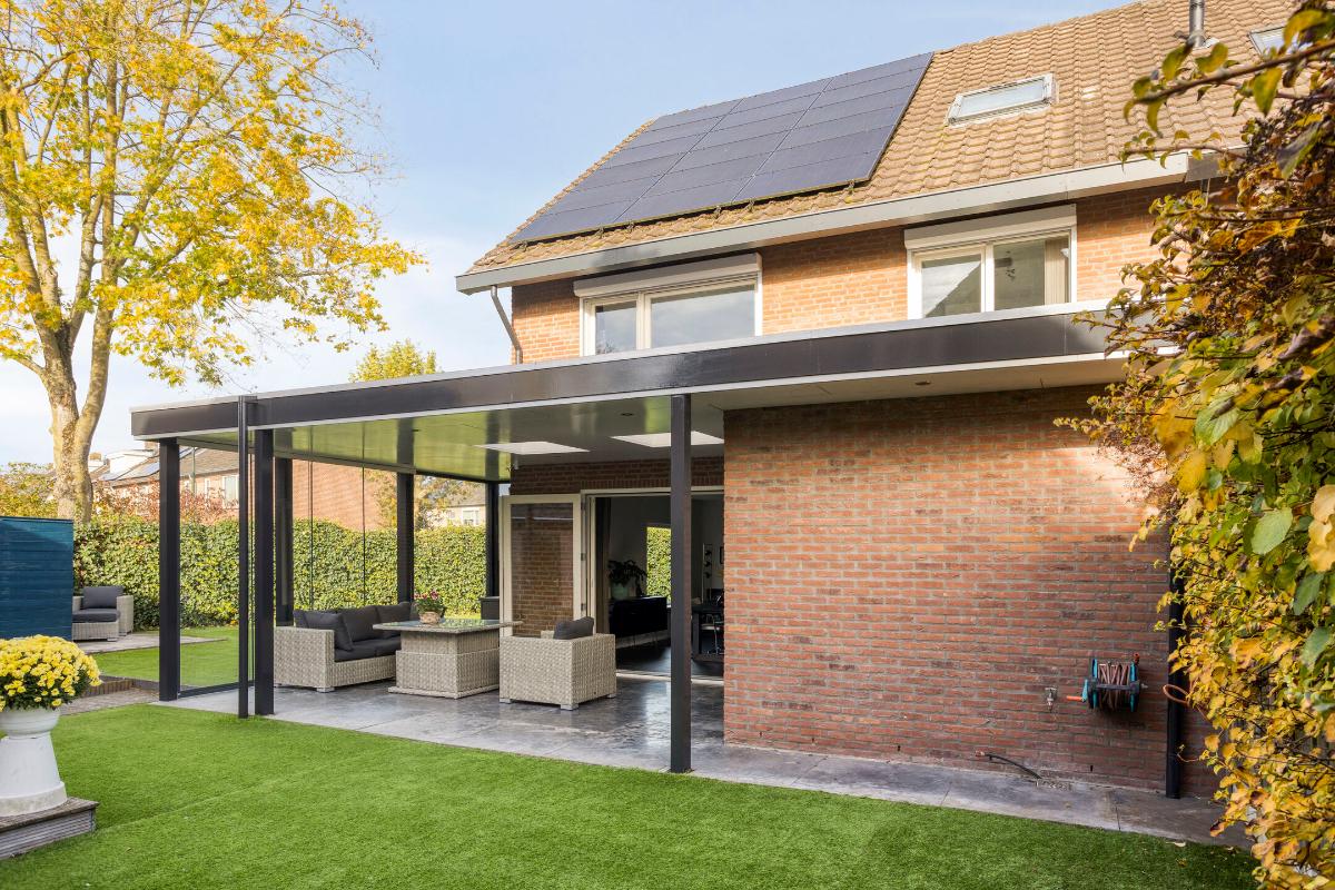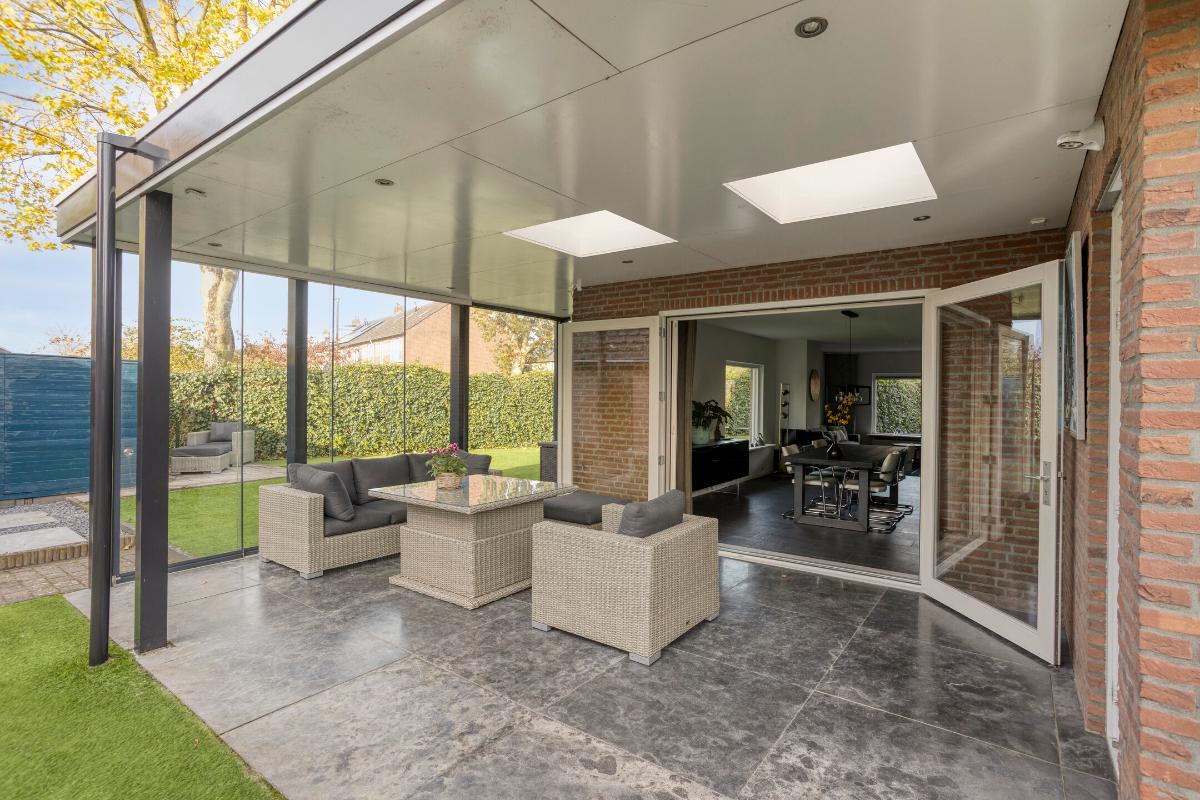 Een echte blikvanger is de moderne overkapping direct aan de woning, deels voorzien van grote glazen (schuif)wanden en twee lichtkoepels. Hierdoor vormt deze overkapping een sfeervolle verlenging van de woonkamer, een groot gedeelte van het jaar is het hier heerlijk vertoeven. Op warme dagen kunnen de glazen wanden worden geopend, terwijl u op koelere avonden geniet van een knusse, overdekte buitenruimte.