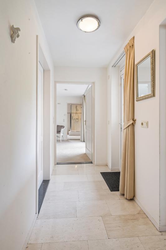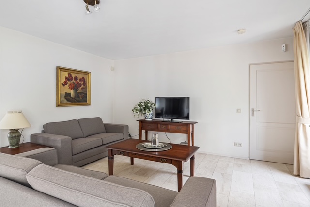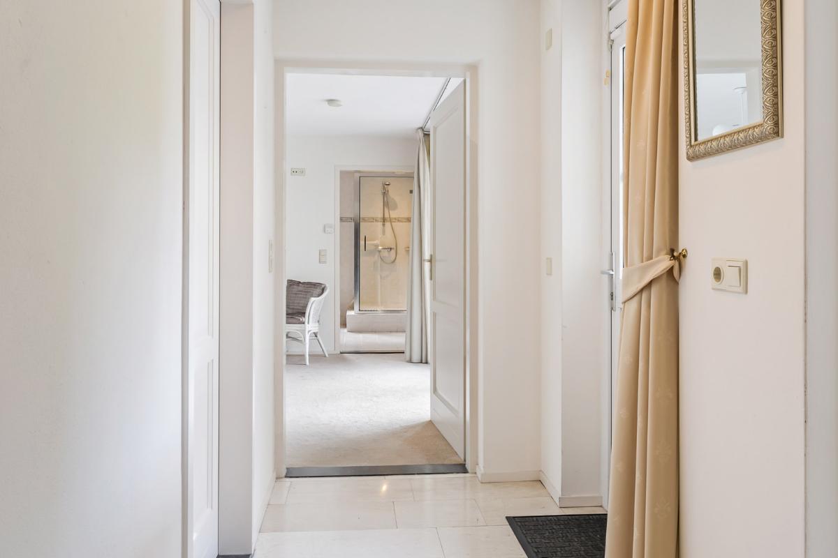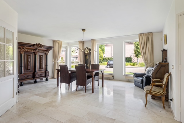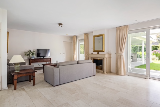 De royale woonkamer is licht en aangenaam, beschikt over een Travertin vloer, gestuukte wanden en plafon en biedt voldoende plek voor zowel een gezellige zithoek als een riante eethoek. De woonkamer beschikt over vloerverwarming en een gashaard voor extra sfeer in de koudere wintermaanden. Vanuit de woonkamer is middels een schuifpui de tuin bereikbaar.