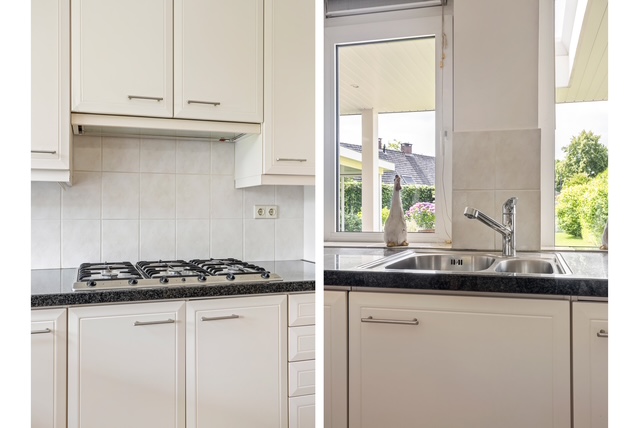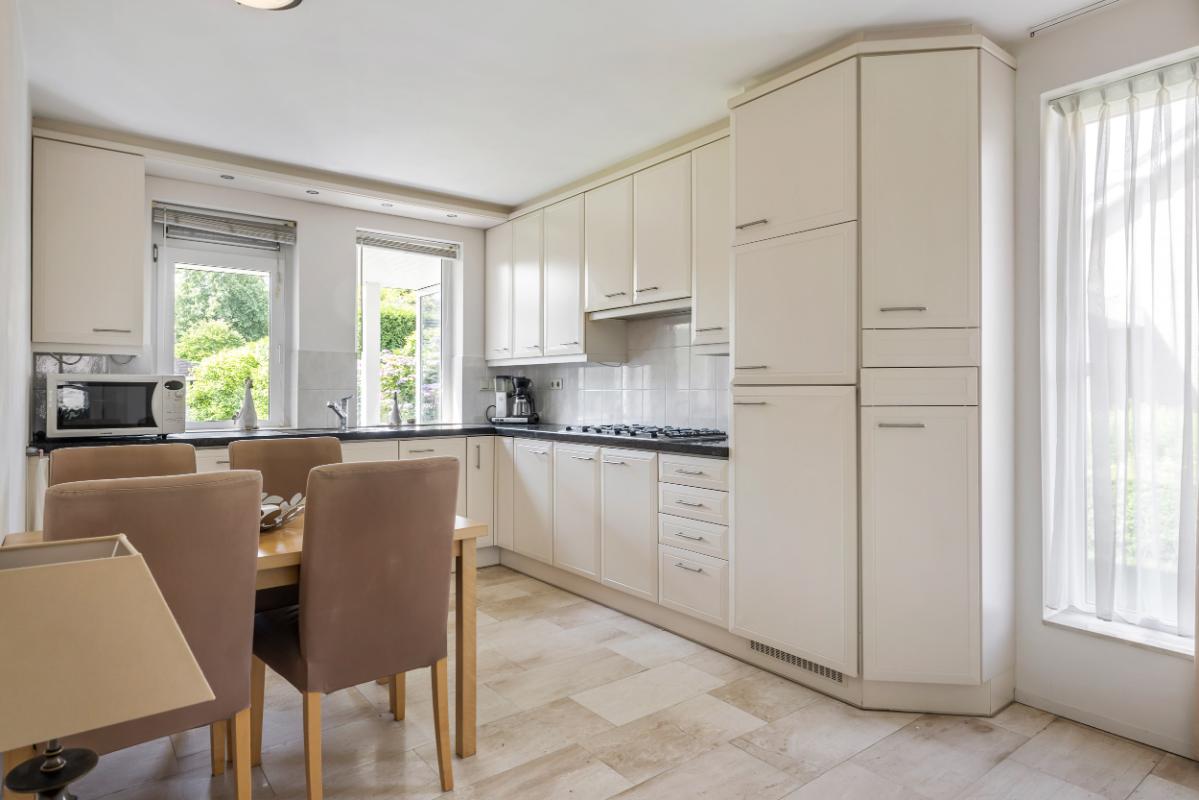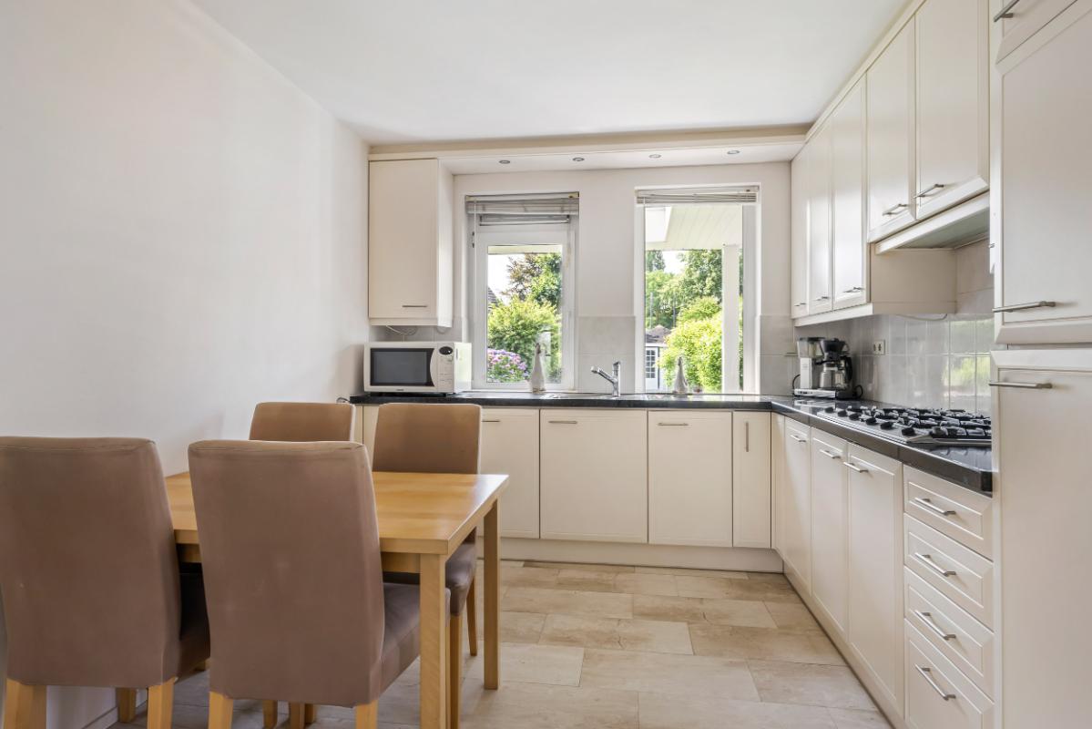 De dichte keuken is gelegen aan de achterzijde en heeft een L-opstelling voorzien van alle gewenste inbouwapparatuur. Vanuit de keuken heeft men een fraai zicht op de groene achtertuin.