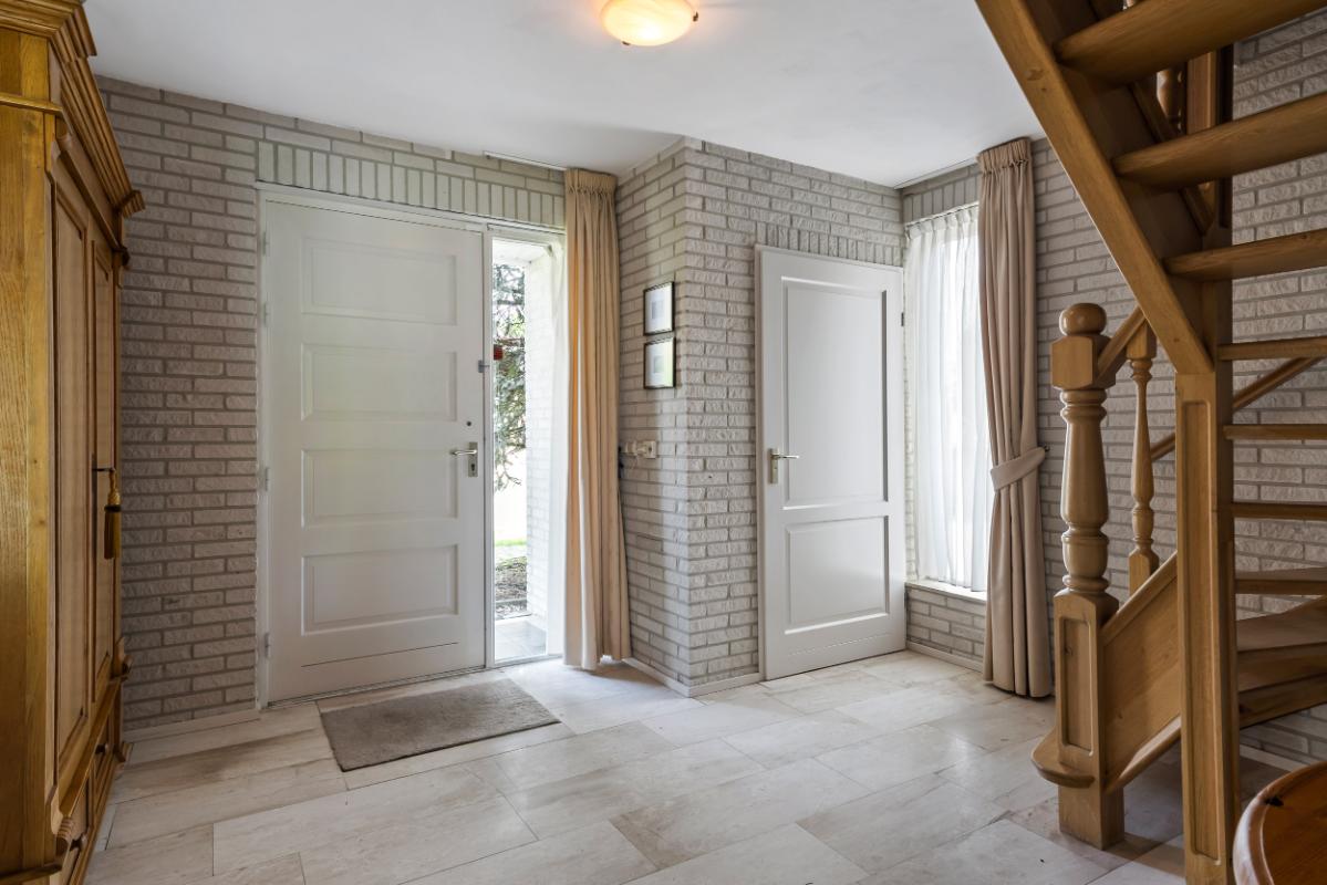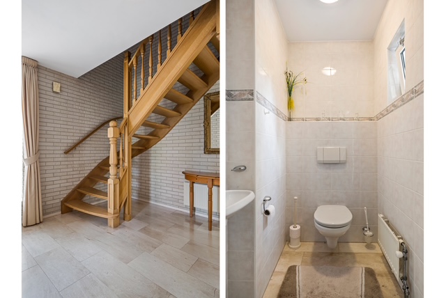 Via de entree kom je in de ruime hal met garderobe, trapopgang en toiletruimte. De toiletruimte is in lichte tinten betegeld en voorzien van een wandcloset en fonteintje.