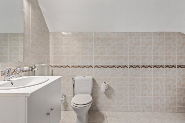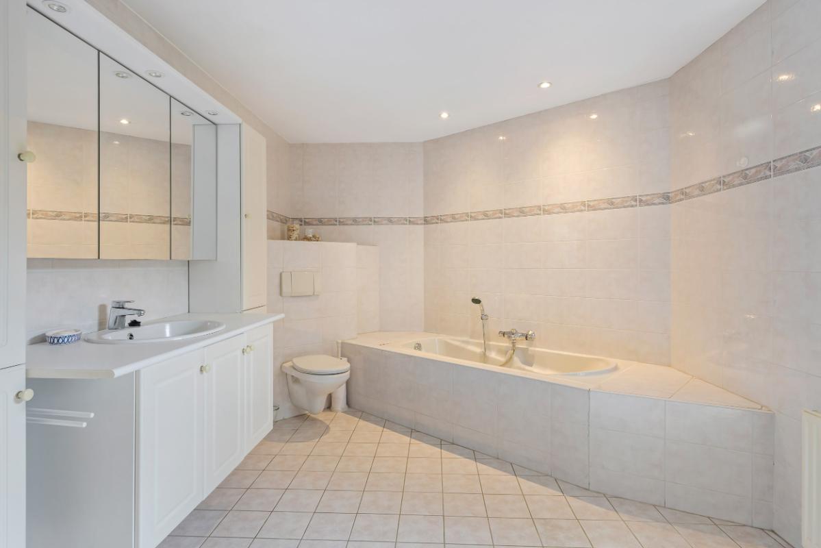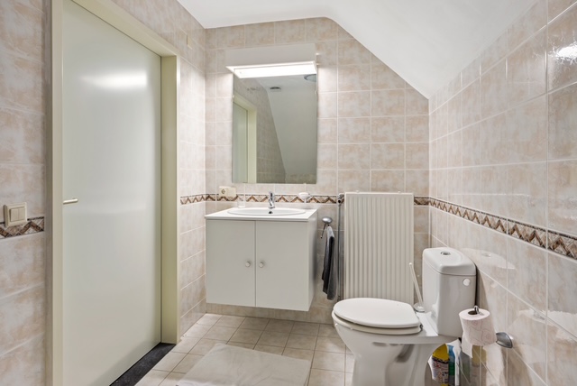 De tweede badkamer is uitgerust met een ligbad, wastafel en toilet.