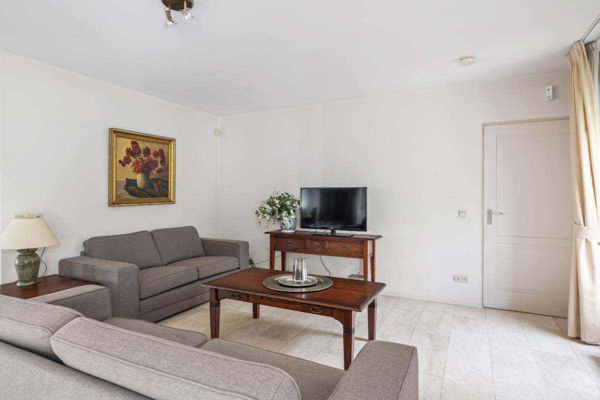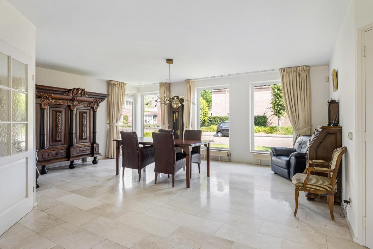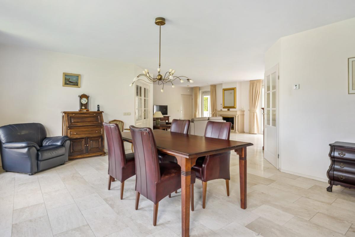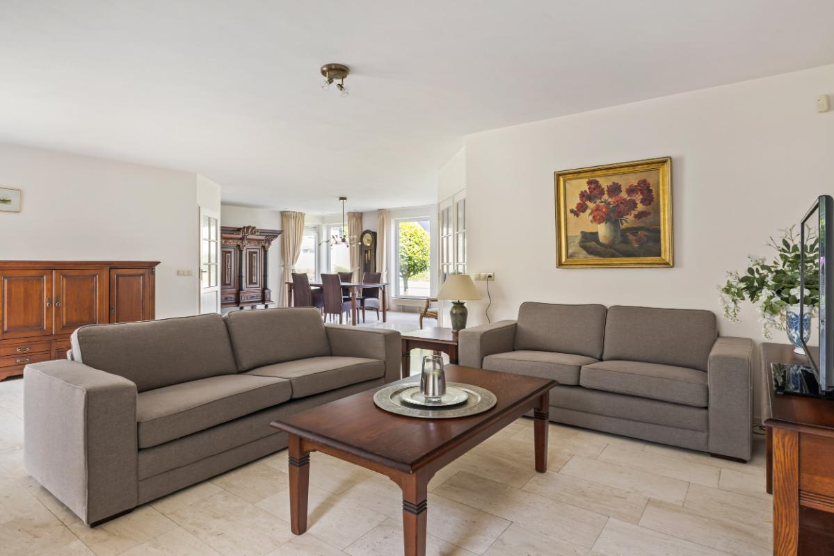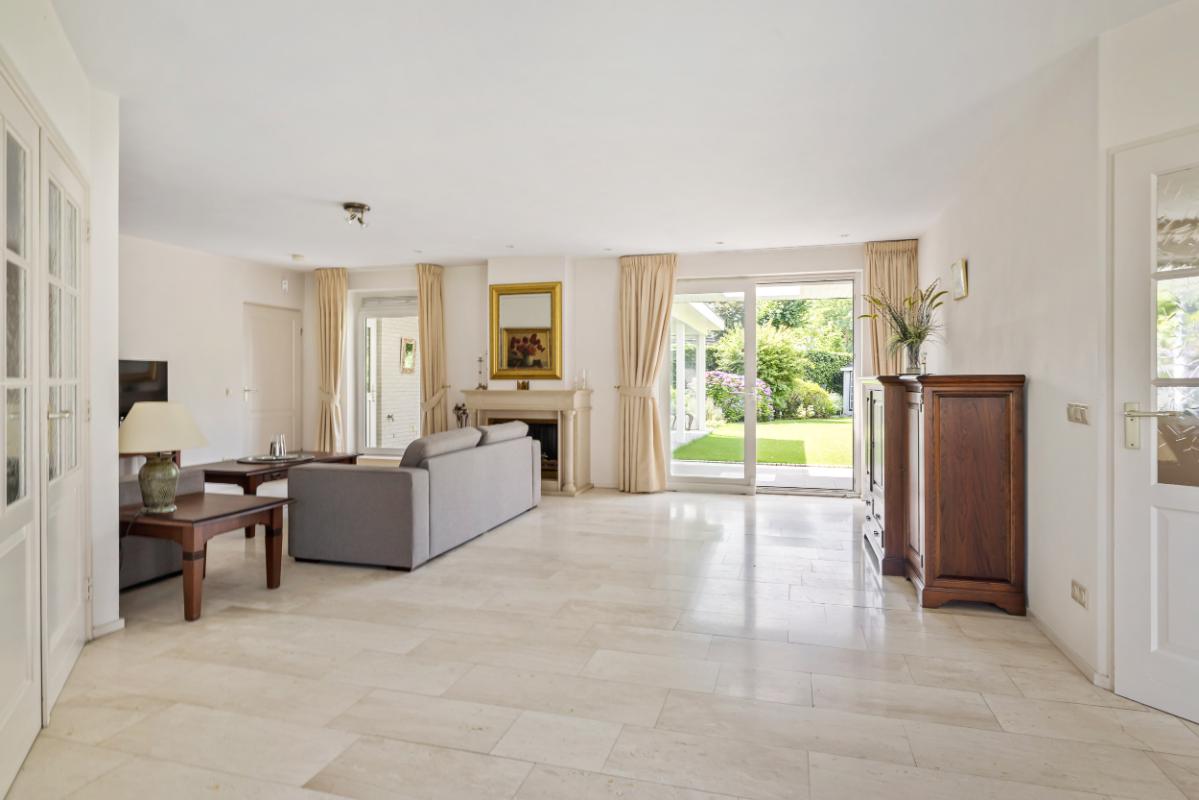 De royale woonkamer is licht en aangenaam, beschikt over een Travertin vloer, gestuukte wanden en plafond en biedt voldoende plek voor zowel een gezellige zithoek als een riante eethoek. De woonkamer beschikt over vloerverwarming (bijverwarming) en een gashaard voor extra sfeer in de koudere wintermaanden. Vanuit de woonkamer is middels een schuifpui de tuin bereikbaar.