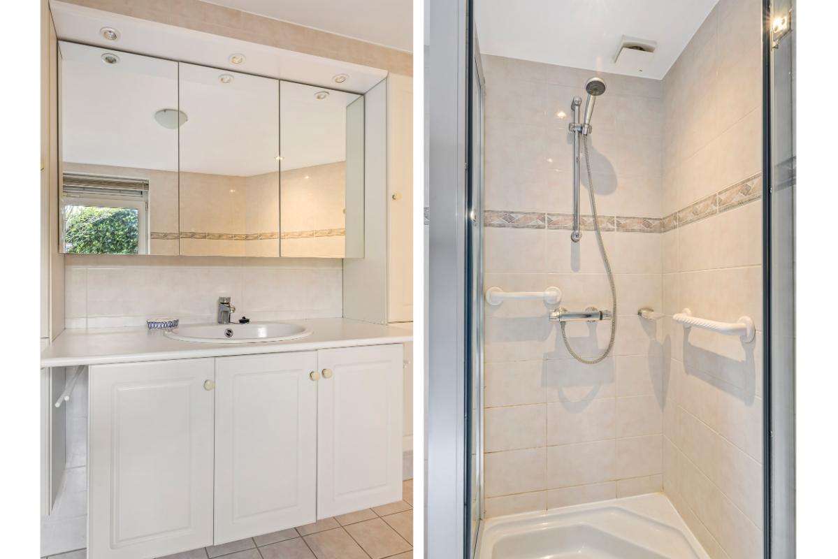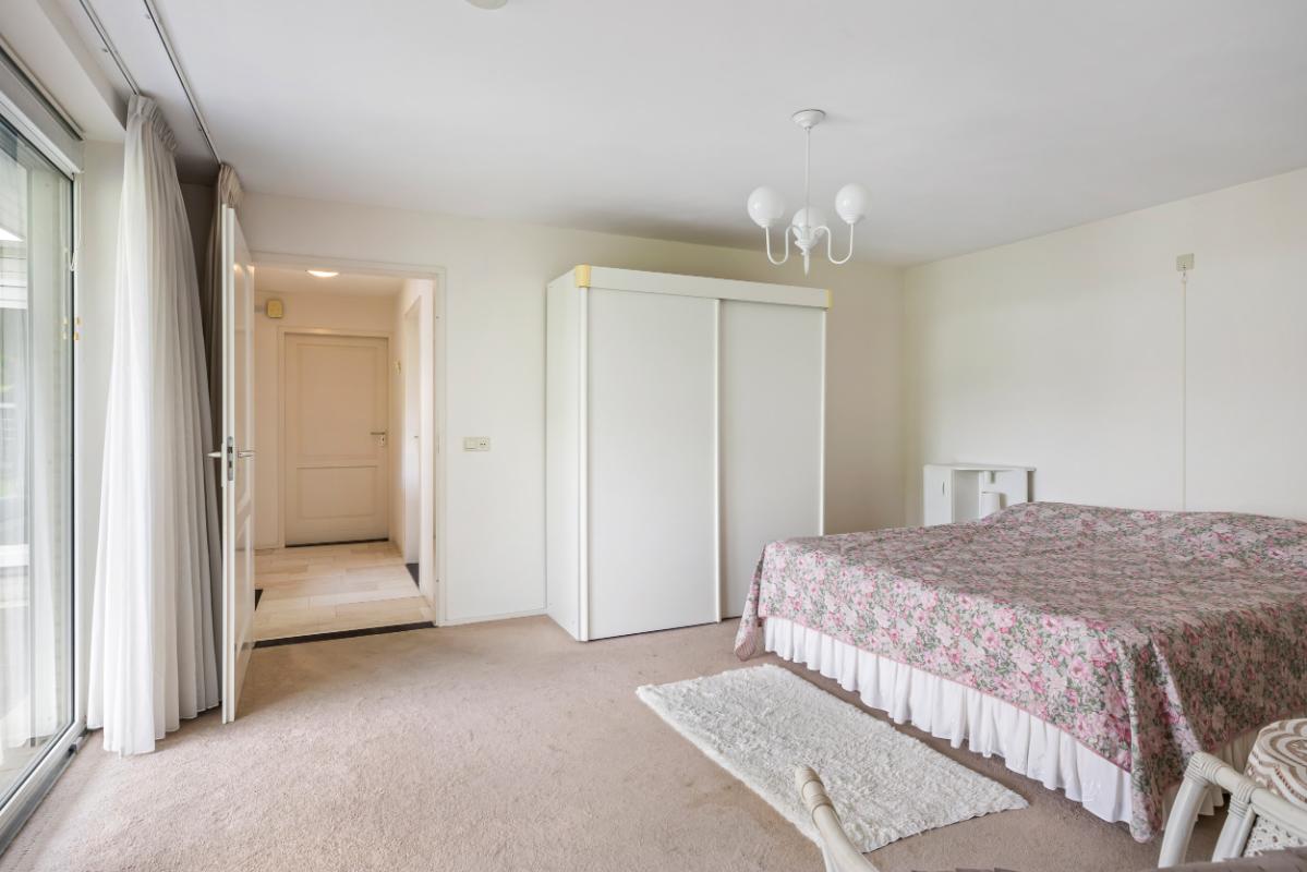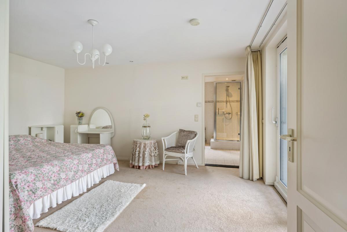 Aan de achterzijde bevindt zich de riante ouderslaapkamer op de begane grond met directe toegang tot een complete badkamer voorzien van ligbad, douche, wastafel met meubel en toilet. Een ideale opzet voor gelijkvloers wonen, een mantelzorgsituatie of logeeraccommodatie.