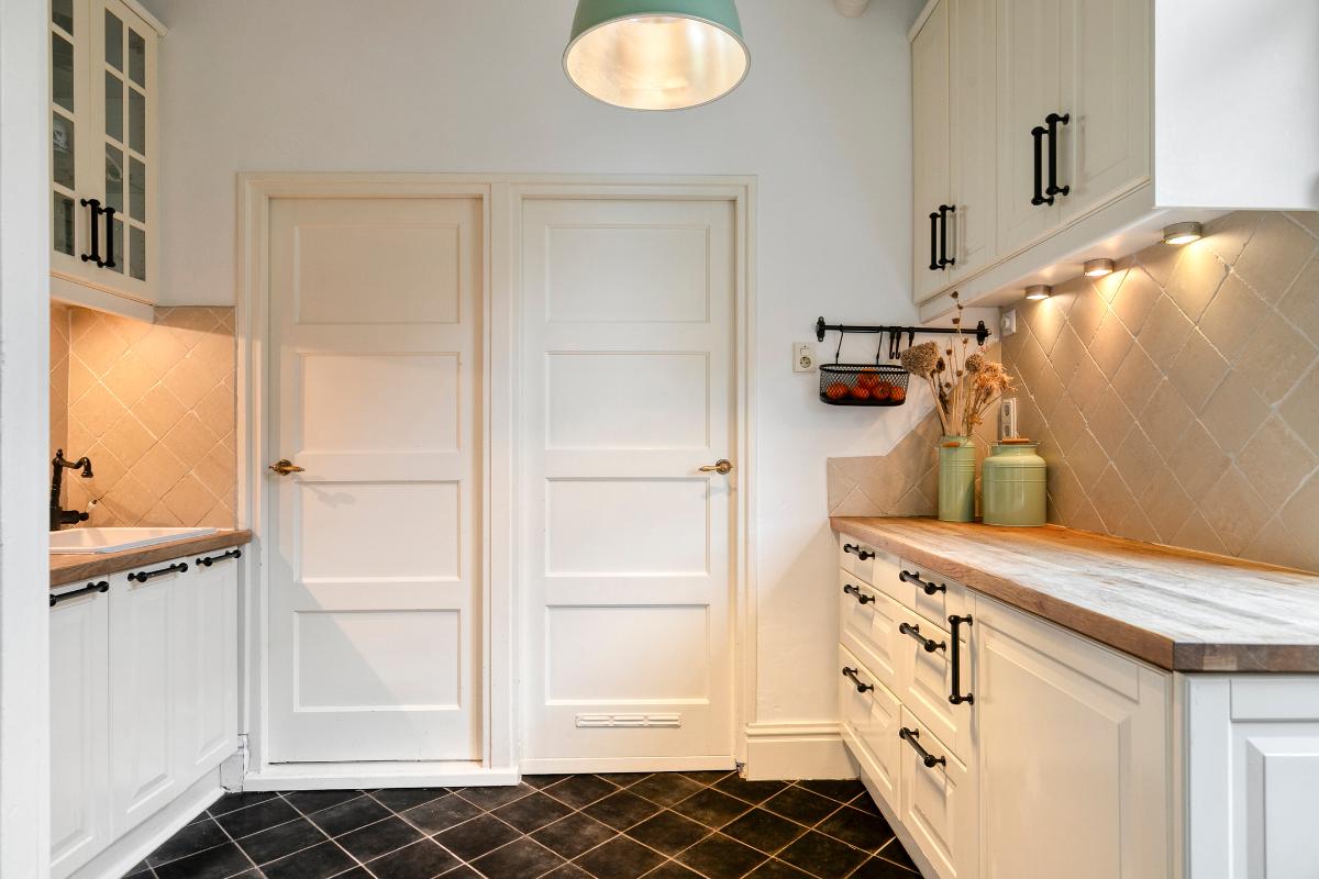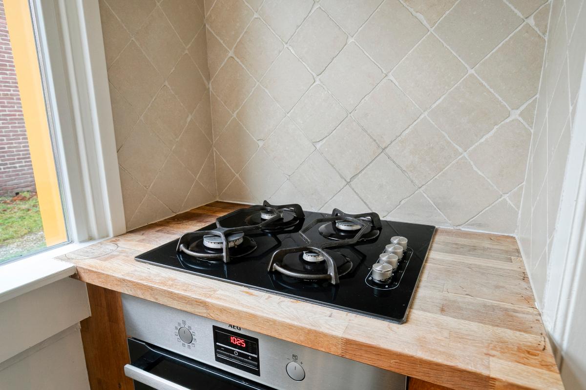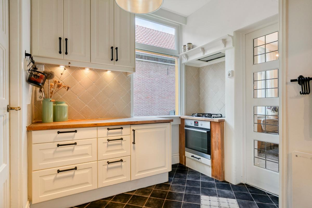 De keuken is speels ingedeeld met meerdere keukenblokken, waaronder een blok met gaskookplaat, een blok met spoelbak en een ruim werkblad. Aangrenzend bevindt zich de bijkeuken met toegang tot de slaapkamer/werkkamer op de begane grond. Deze ruimte heeft een grote raampartij en een fraai uitzicht op de achtertuin.