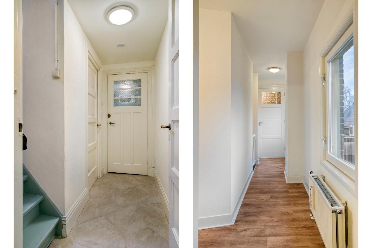 Begane grond De entree komt uit in een compacte hal met houten vloer, garderoberuimte en meterkast. Vanuit hier bereikt u de ruime living aan de voorzijde. Deze sfeervolle leefruimte wordt gekenmerkt door een prettige lichtinval dankzij de vele raampartijen. De houtkachel zorgt voor extra warmte en sfeer tijdens de wintermaanden. Wanden en plafond zijn strak afgewerkt met stucwerk.