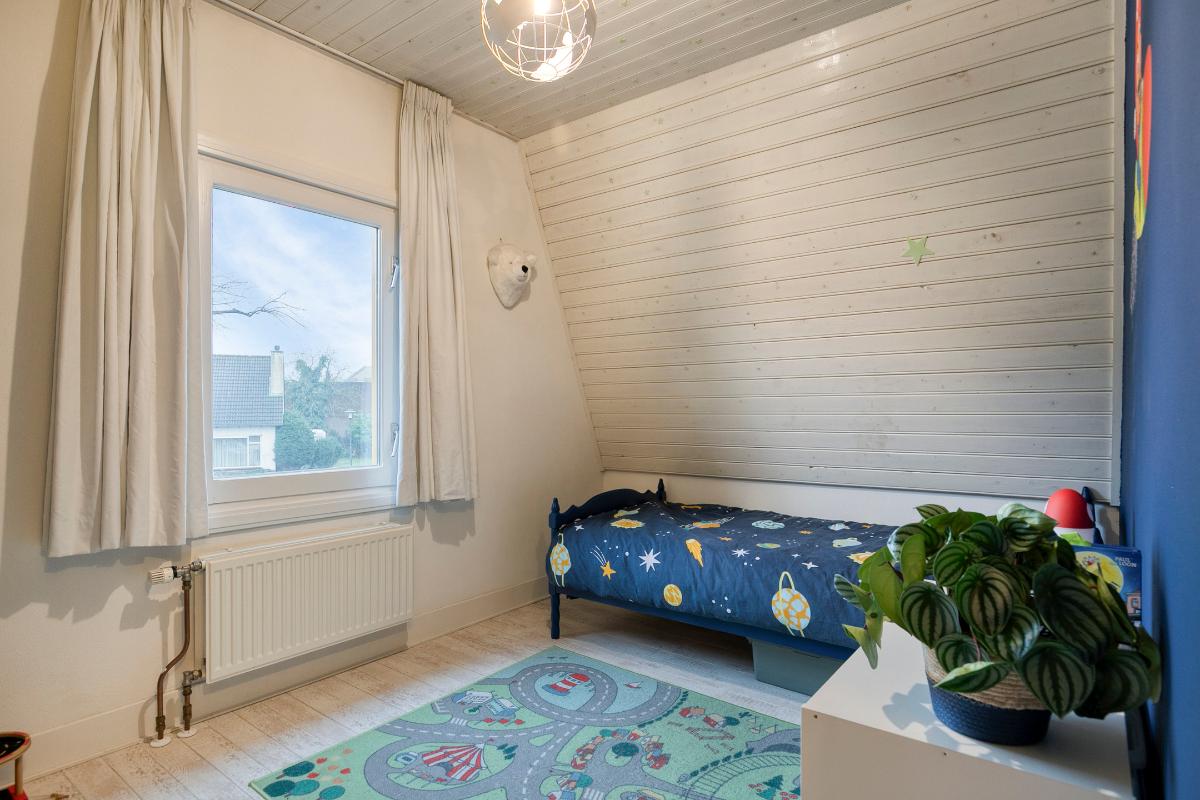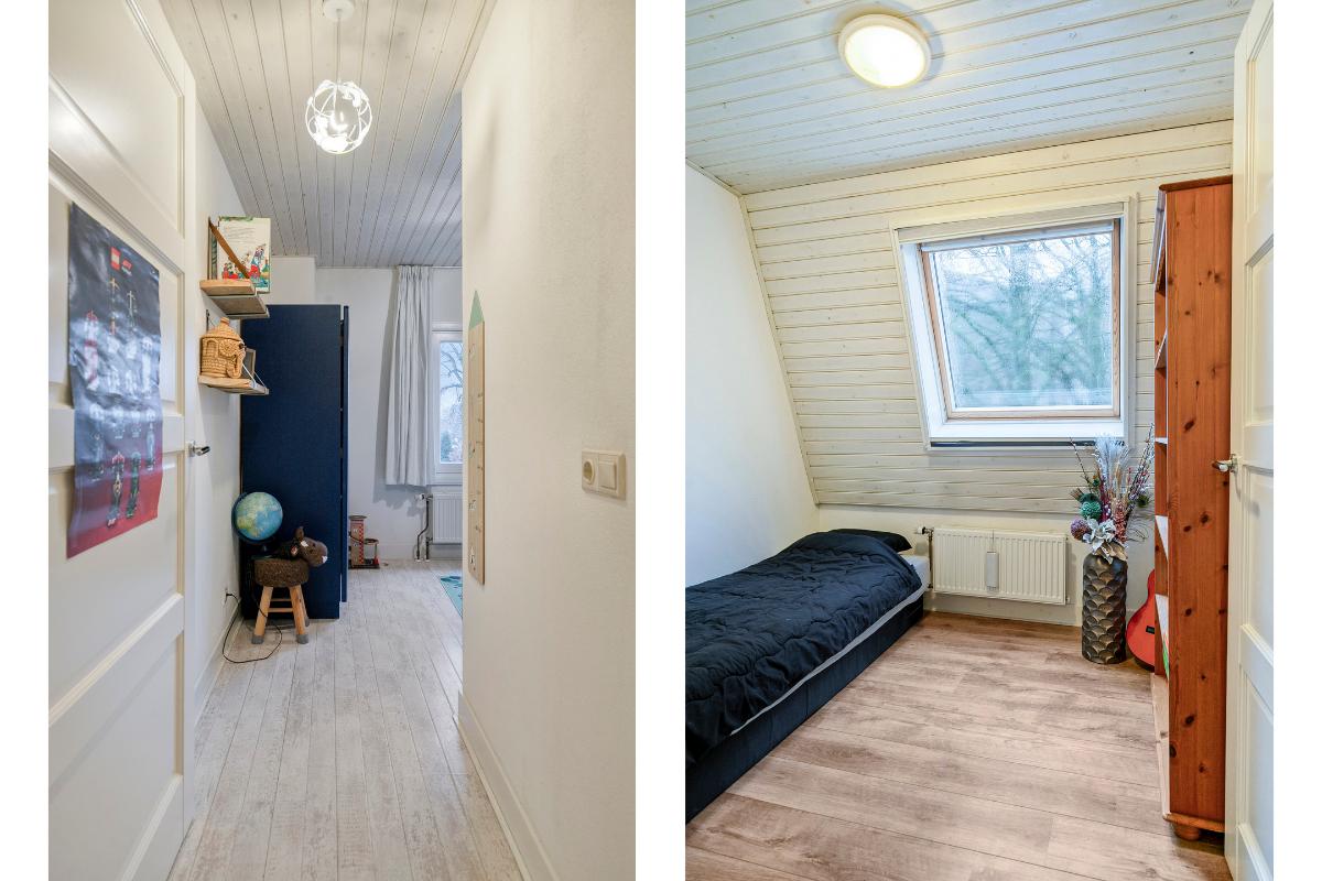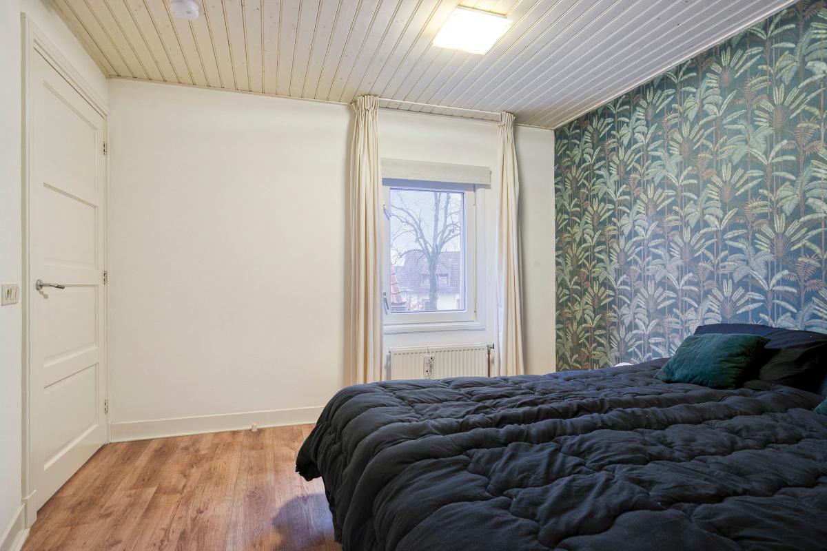 Slaapkamer 2 (voorzijde): laminaatvloer, houten kozijnen en dubbele beglazing.