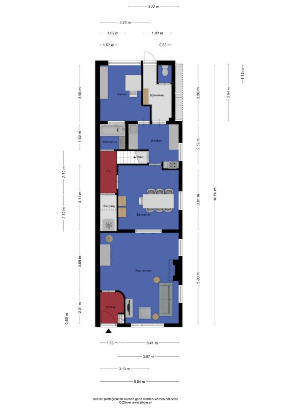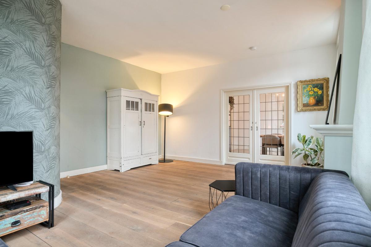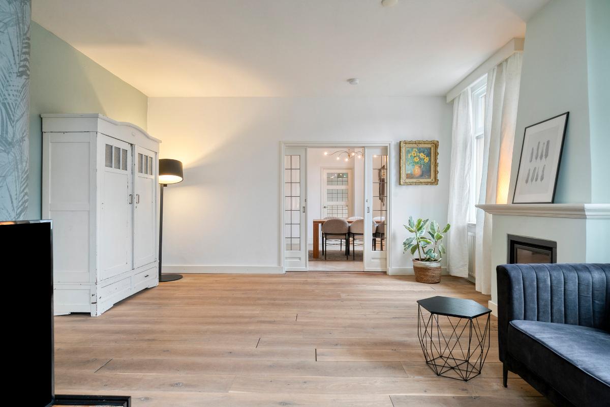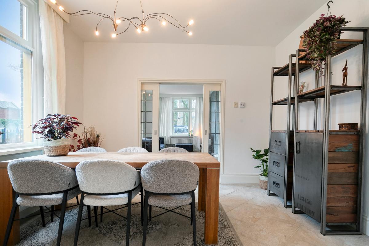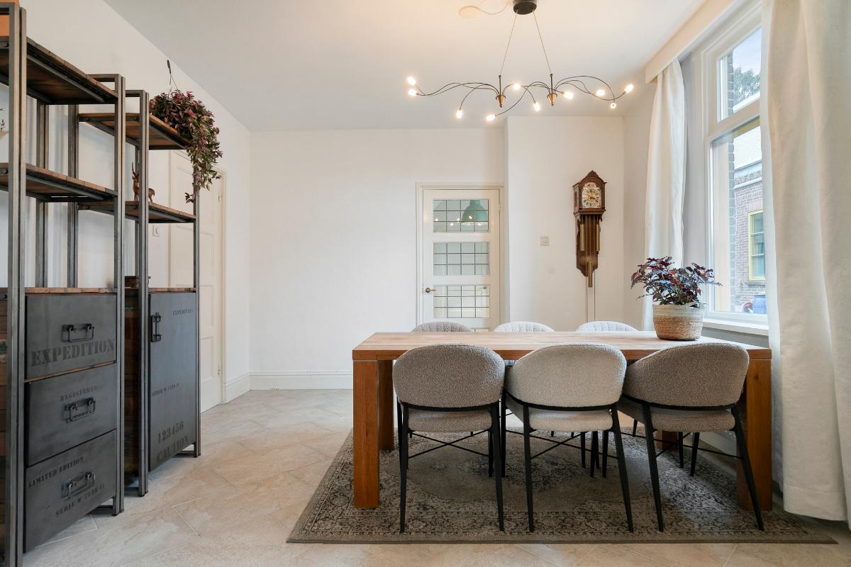 Via de authentieke en-suite deuren komt u in de eetkamer: een lichte en praktische ruimte met tegelvloer en eveneens gestucte wanden en plafonds. Vanuit de eetkamer zijn het portaal met trapkast en badkamer bereikbaar, evenals de keuken.