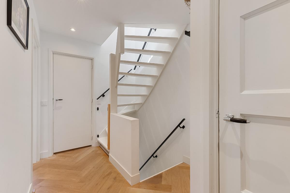 Begane grond: Entrée/hal met meterkast en fraaie glas-in-looddeur naar de woonkamer. Prachtig eiken lamelparket in visgraatmotief door de gehele begane grond. De woonverdieping is slim opgesplitst in een sfeervol zitgedeelte en een riante woonkeuken. Tussen beide ruimtes ligt een handige trapkast en een ruim toilet.