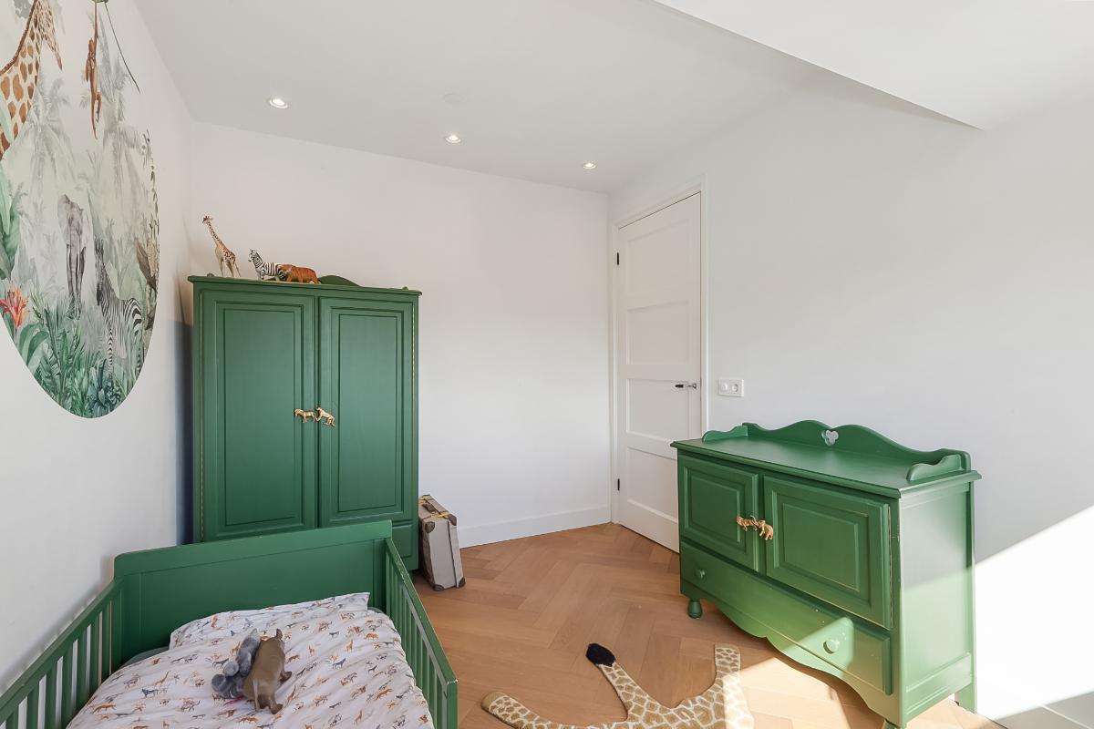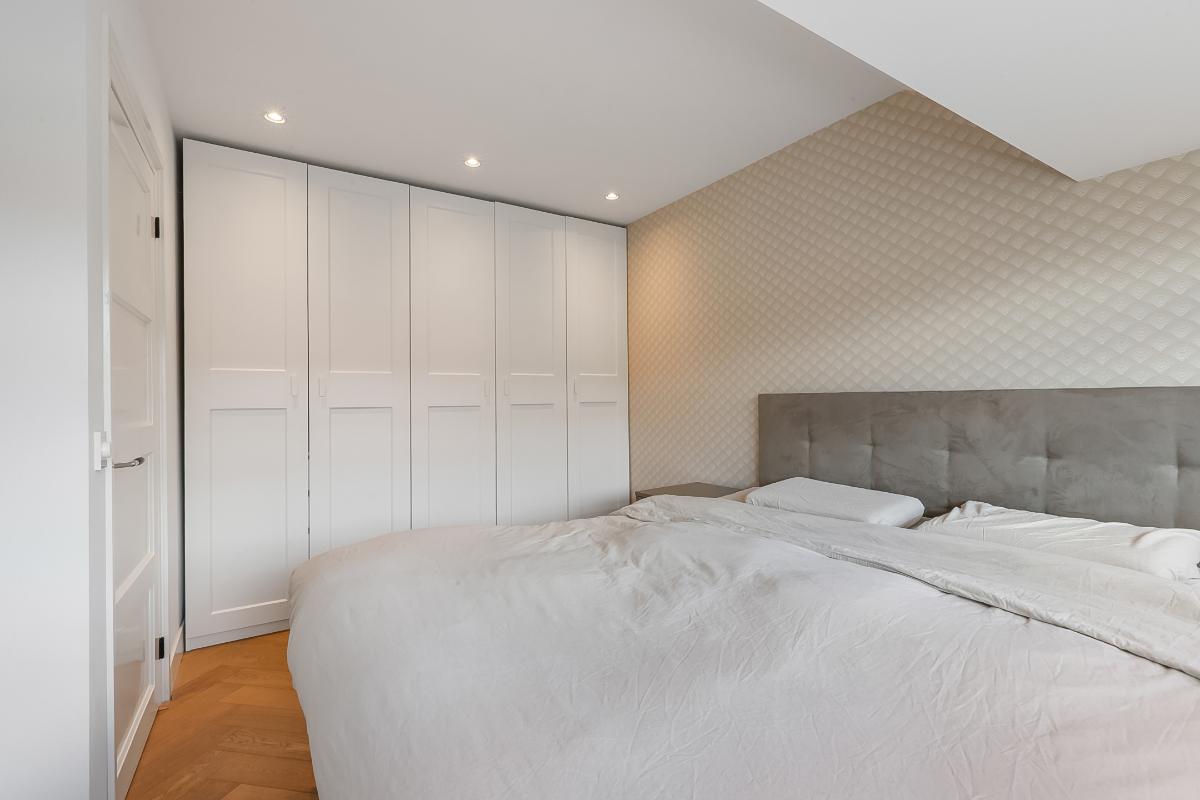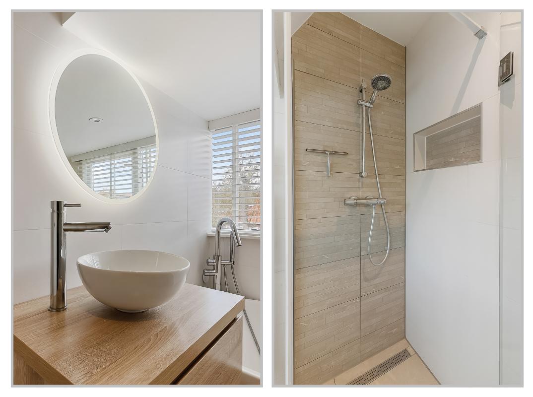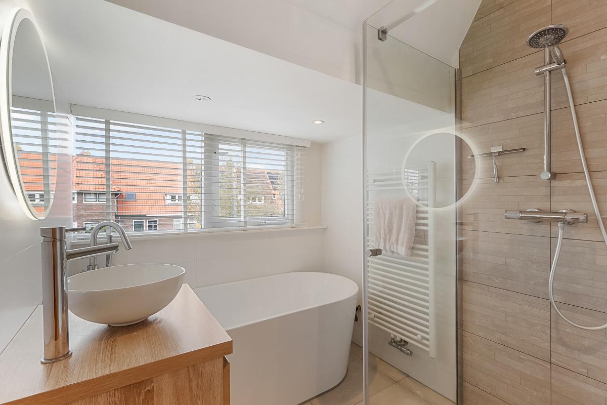 Eerste verdieping: Overloop met een apart toilet. Dezelfde eiken visgraat lamelparketvloer ligt hier door de gehele verdieping. Drie slaapkamers: twee aan de achterzijde en één extra ruime kamer aan de voorzijde. Complete badkamer met inloopdouche, wastafelmeubel en vrijstaand bad.