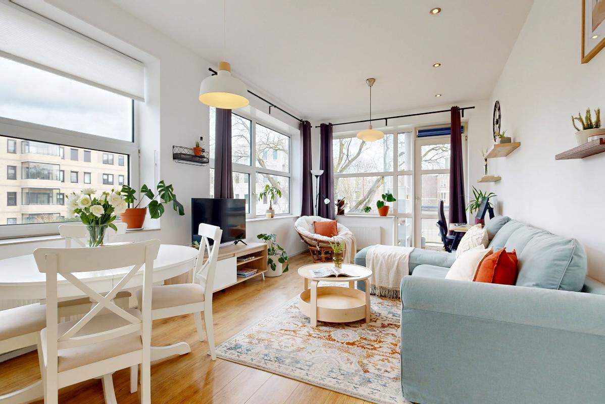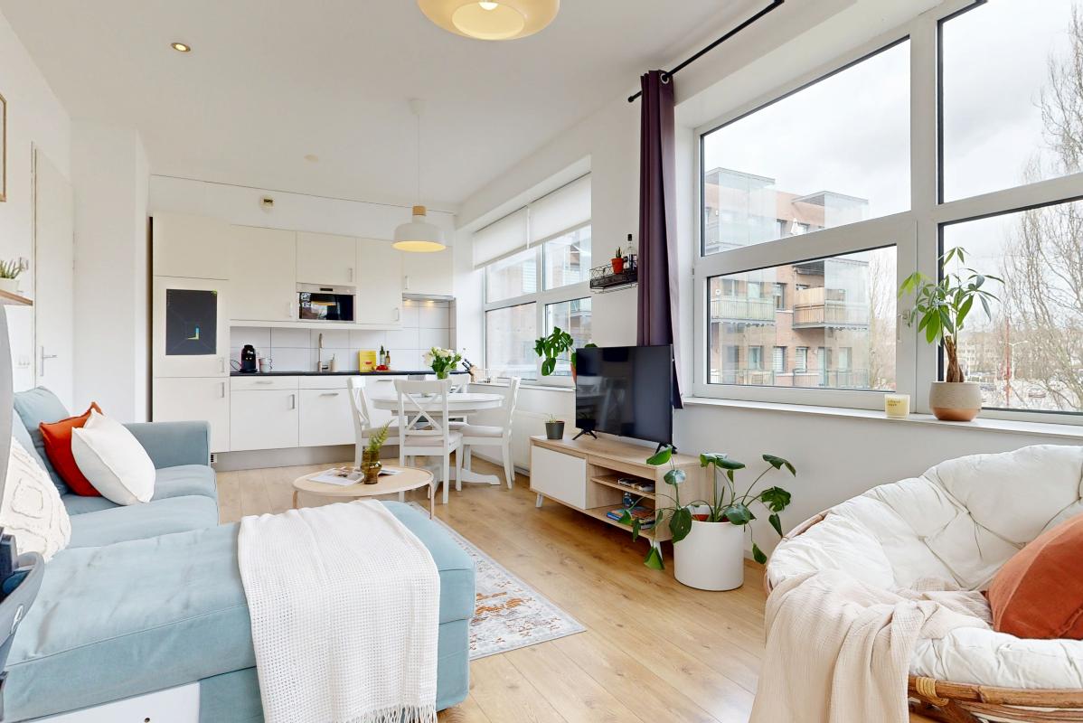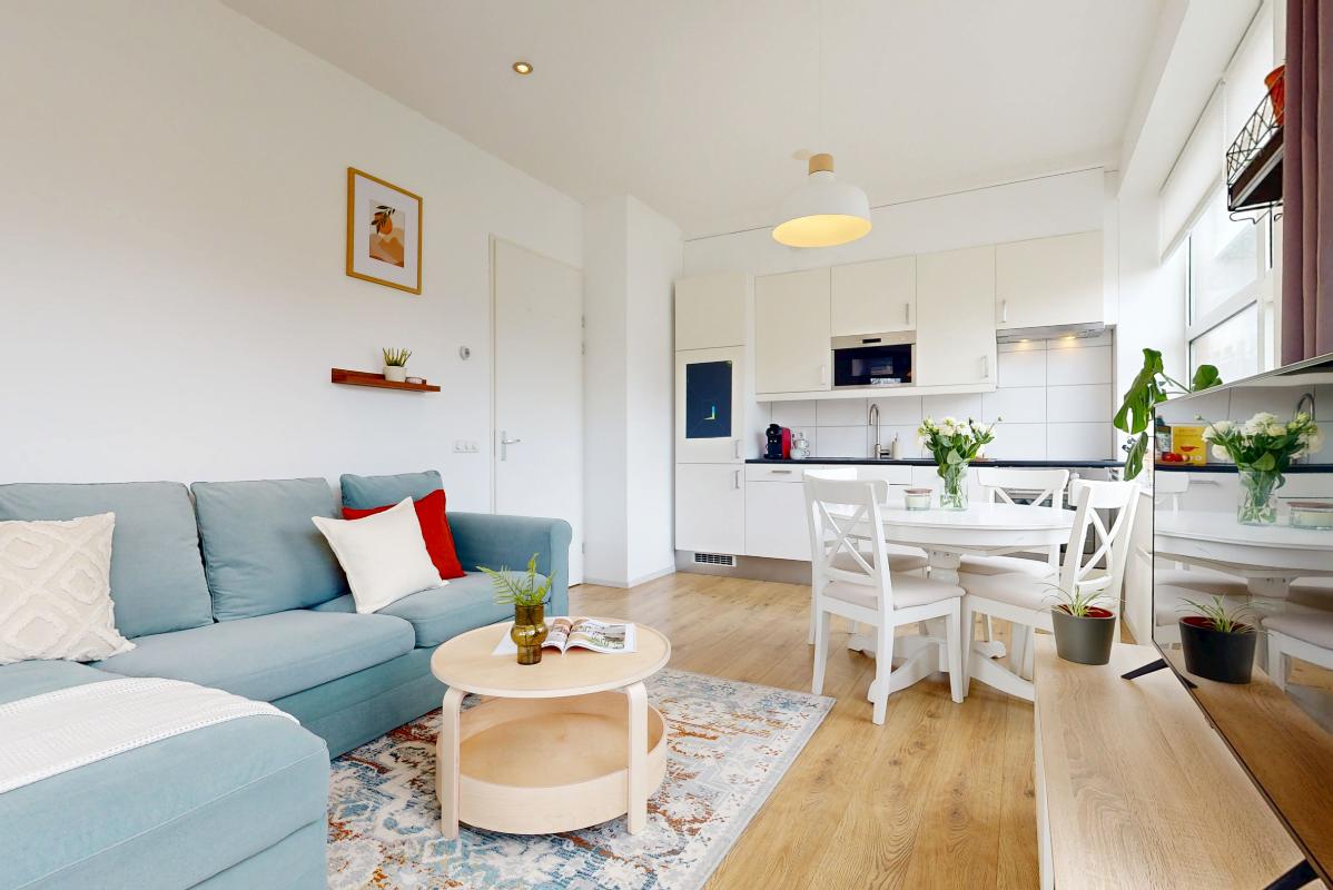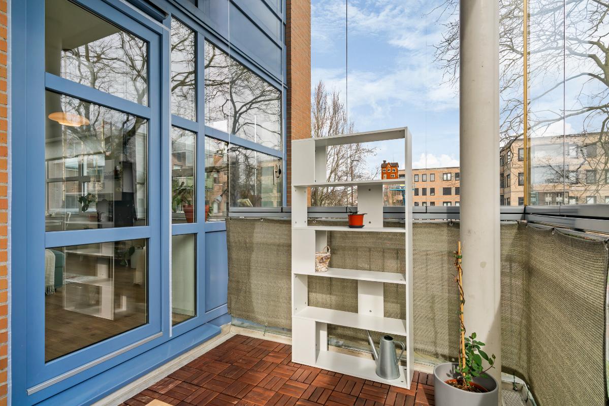 Vanuit de hal stap je de fijne, lichte woonkamer binnen. Grote raampartijen zorgen voor veel lichtinval en een open, ruimtelijk gevoel. Er is volop plek voor een gezellige zithoek en een eettafel. De open keuken sluit hier naadloos op aan en is modern en praktisch uitgevoerd met alle gewenste inbouwapparatuur; een oven, inductiekookplaat, koel-vriescombinatie, magnetron en vaatwasser, ideaal voor wie graag kookt. Vanuit de woonkamer loop je direct het balkon op, welke is gelegen op het oosten. Dit balkon is voorzien van glasplaten, zodat je hier ook bij minder weer comfortabel kunt zitten en kan genieten van het ruimtelijke en vrije uitzicht.